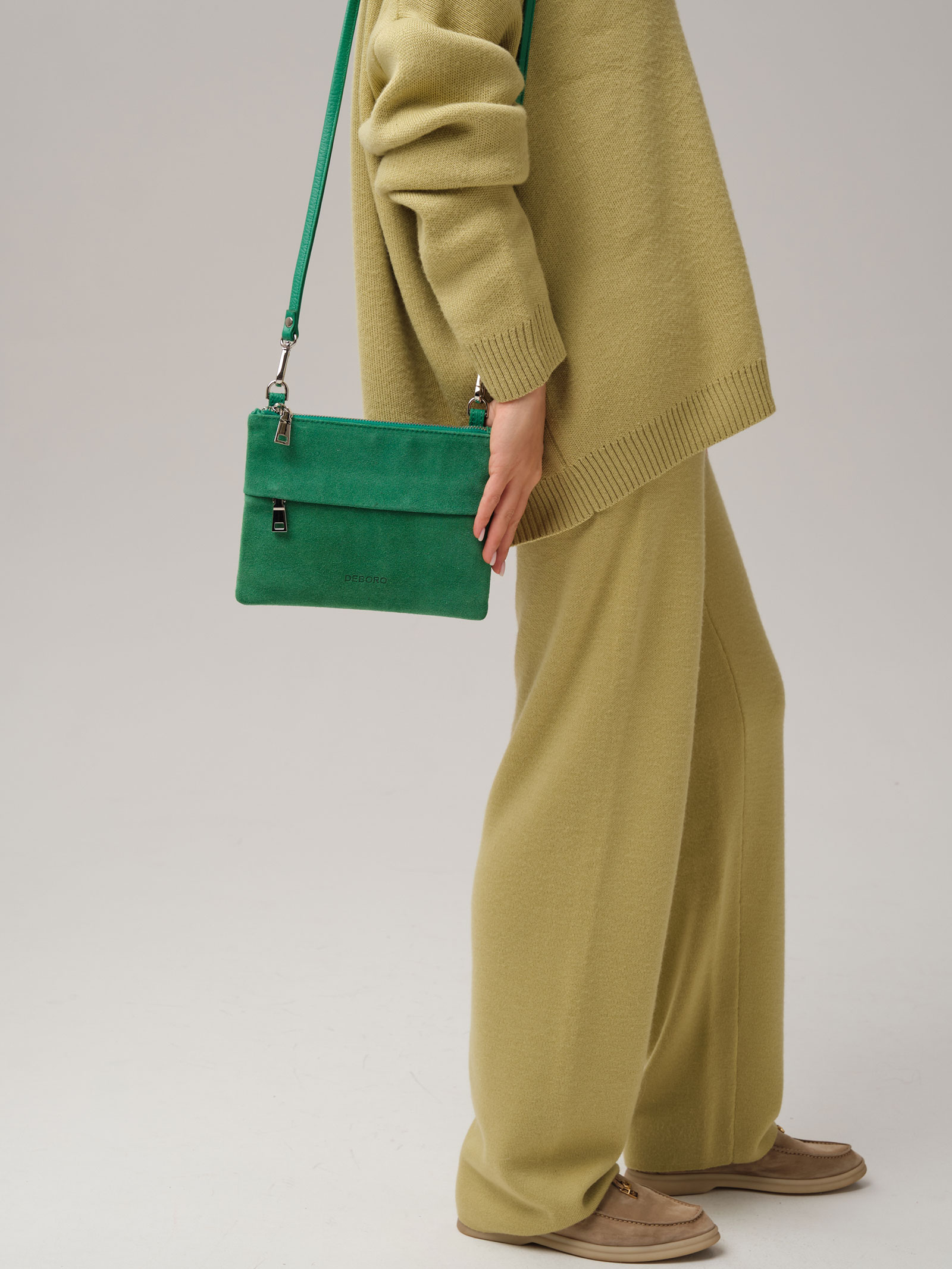 Детали: натуральная замша, натуральная кожа, съемный нерегулируемый плечевой ремень, 1 внешний карман на молнии, 1 внутреннее отделение, 1 внутренний боковой карман на молнии, водонепроницаемая хлопковая подкладка, широкая палитра цветов, без ремня можно носить как клатч.