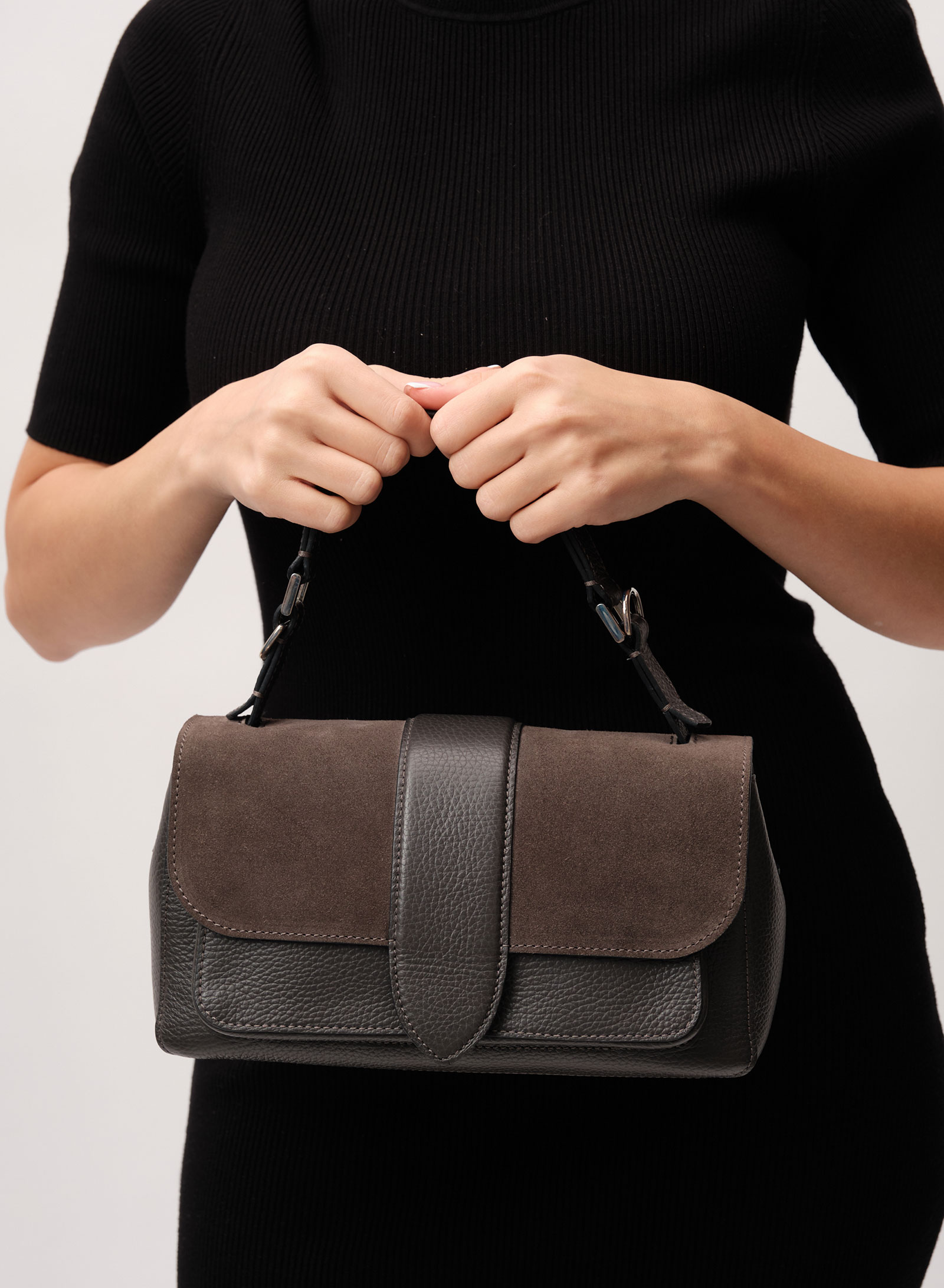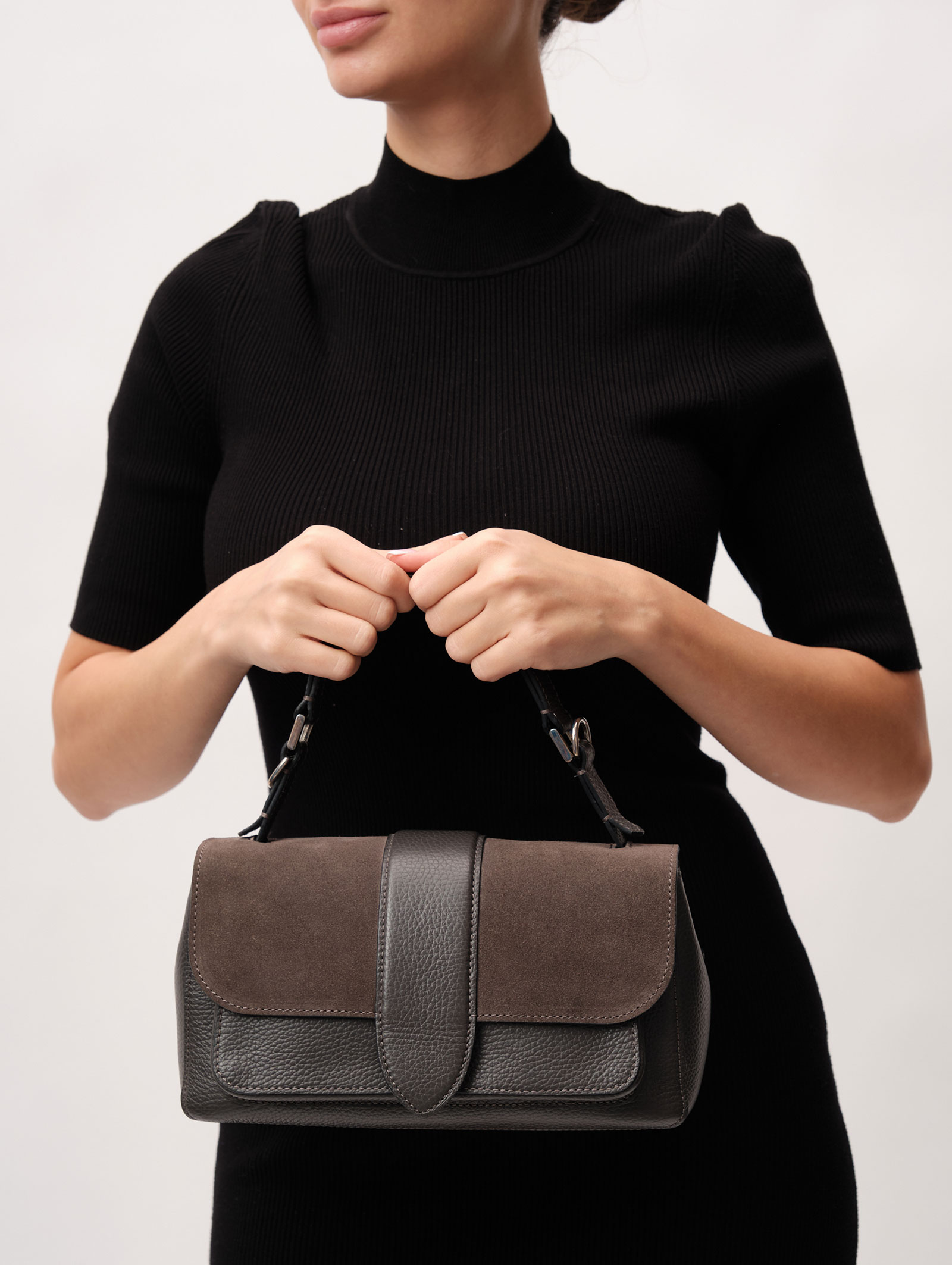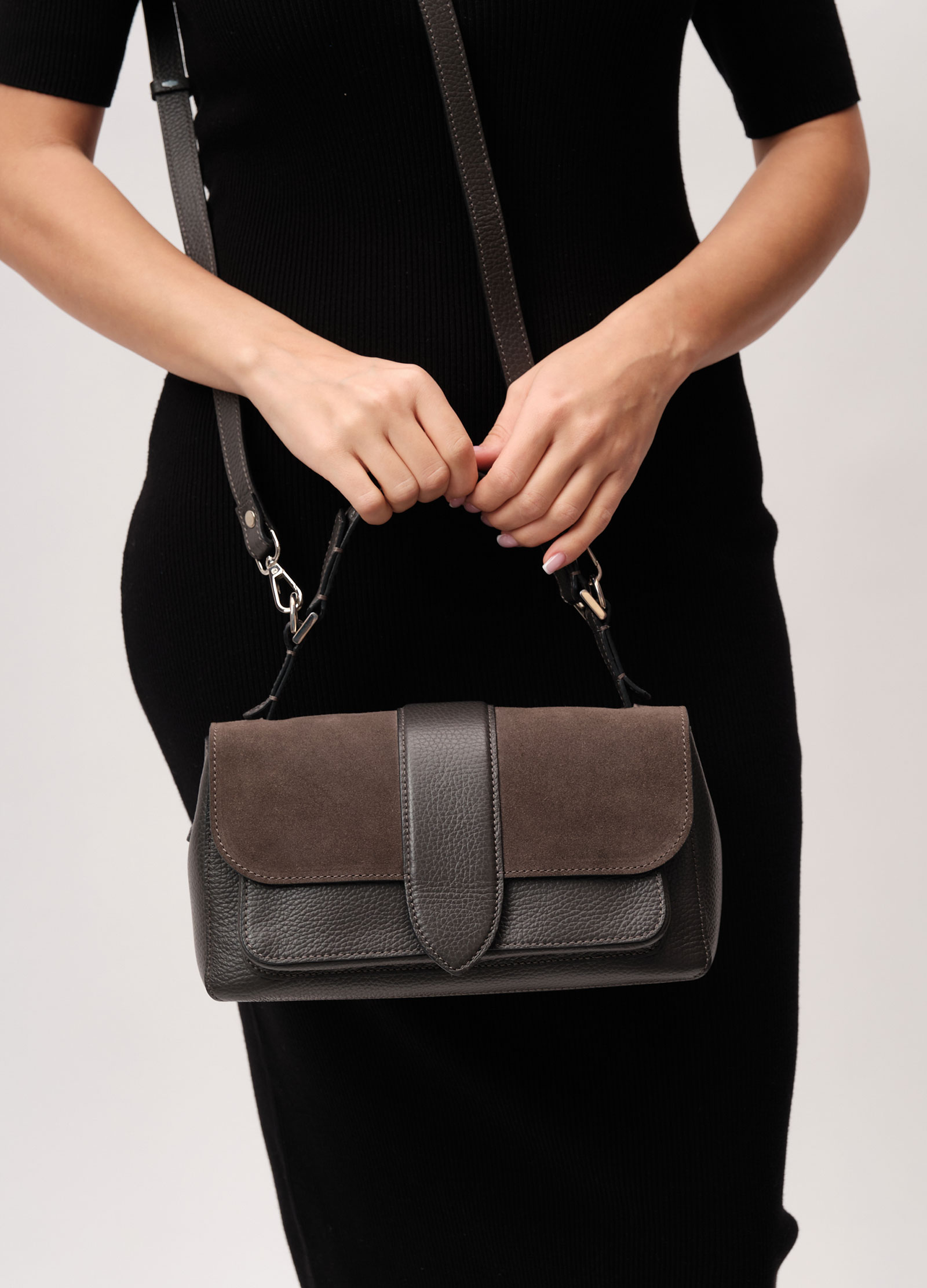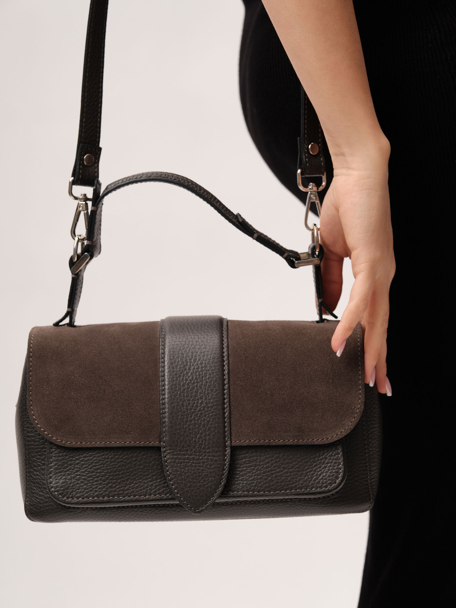 Детали: натуральная кожа, натуральная замша, несъемная ручка, съемный регулируемый плечевой ремень, 1 накладной внешний карман под клапаном, клапан с внутренней отделкой из натуральной замши на кнопке-магните, 1 внутренний закрытый карман на молнии, 1 внутреннее отделение, хлопковая водонепроницаемая подкладка.