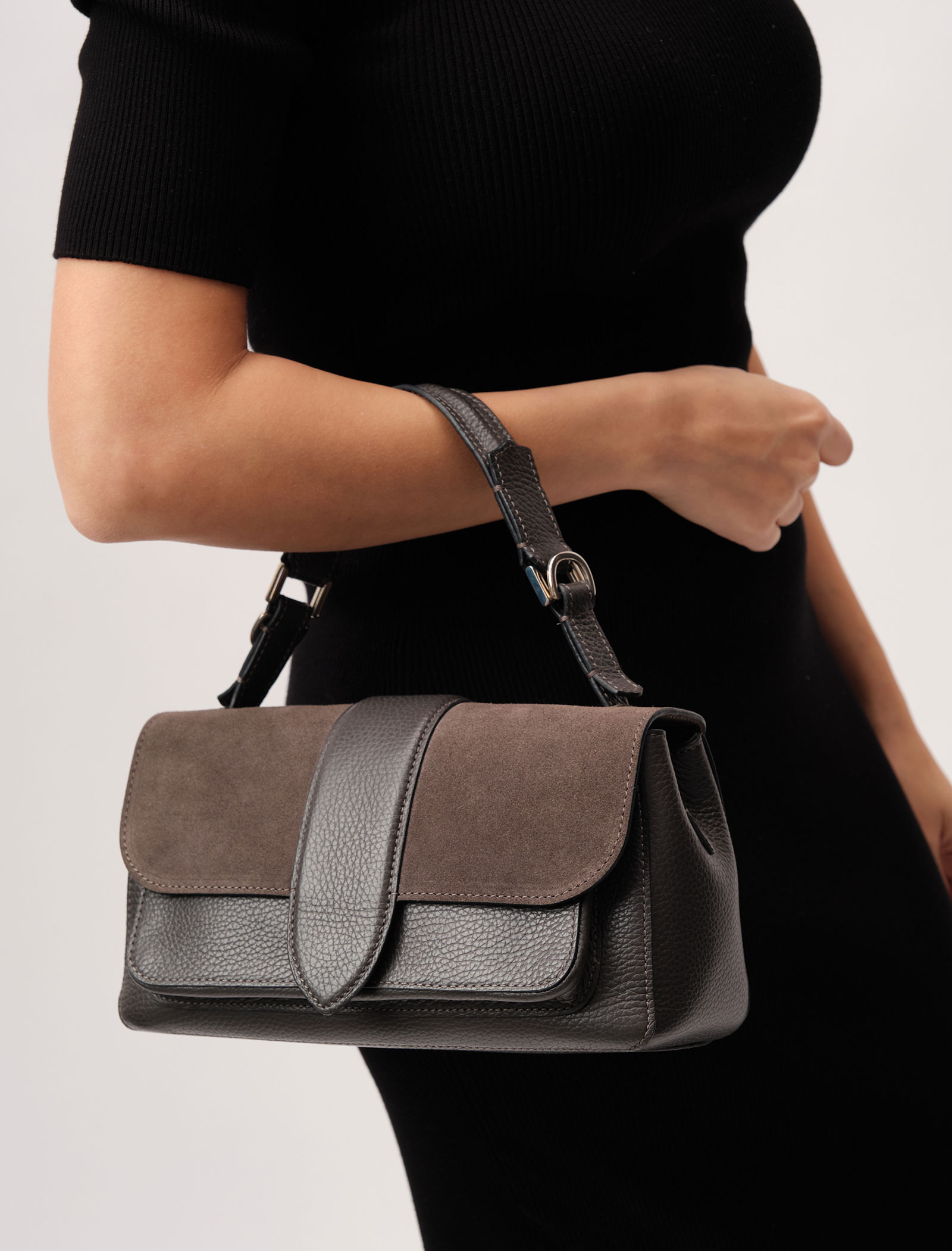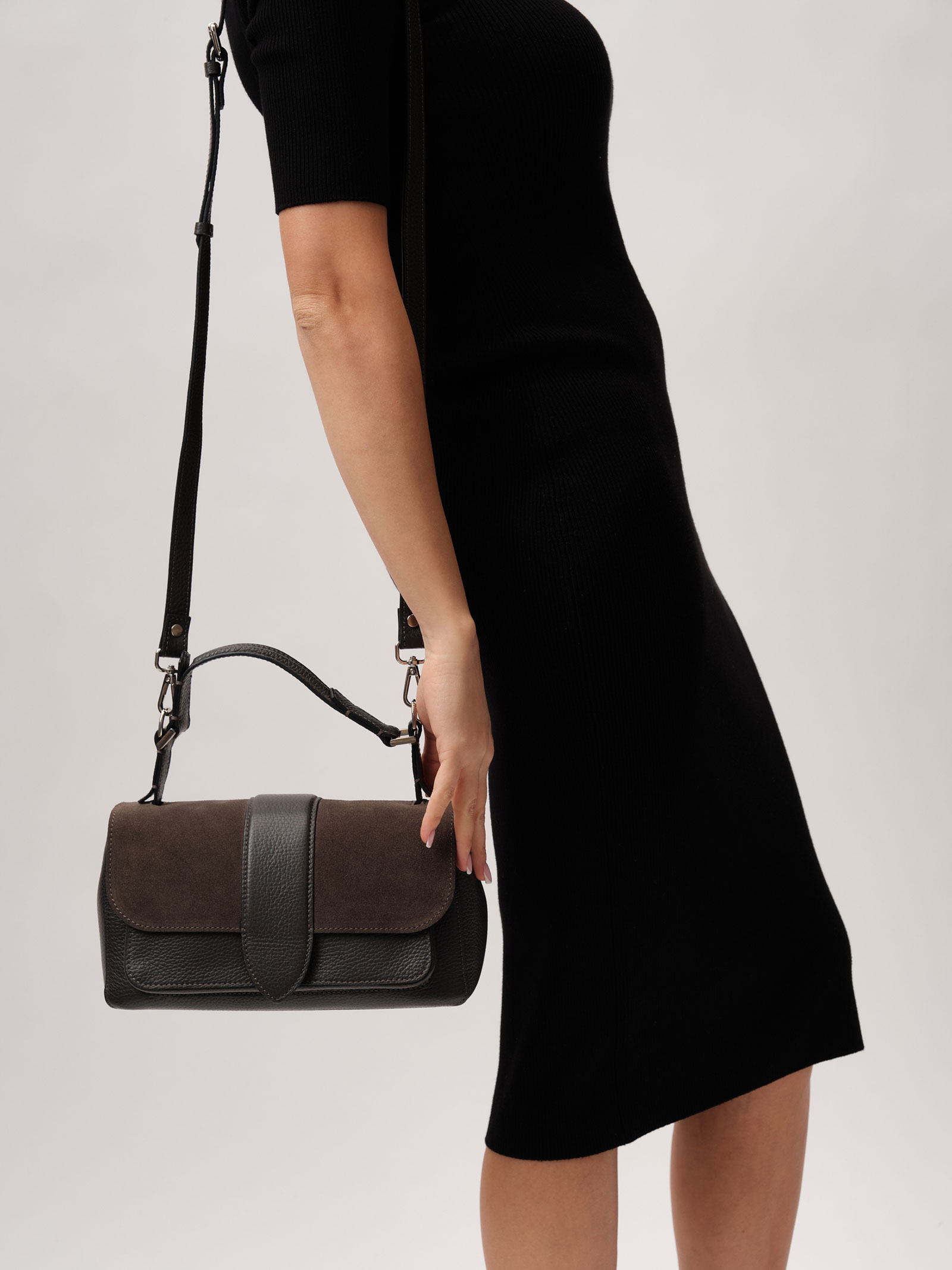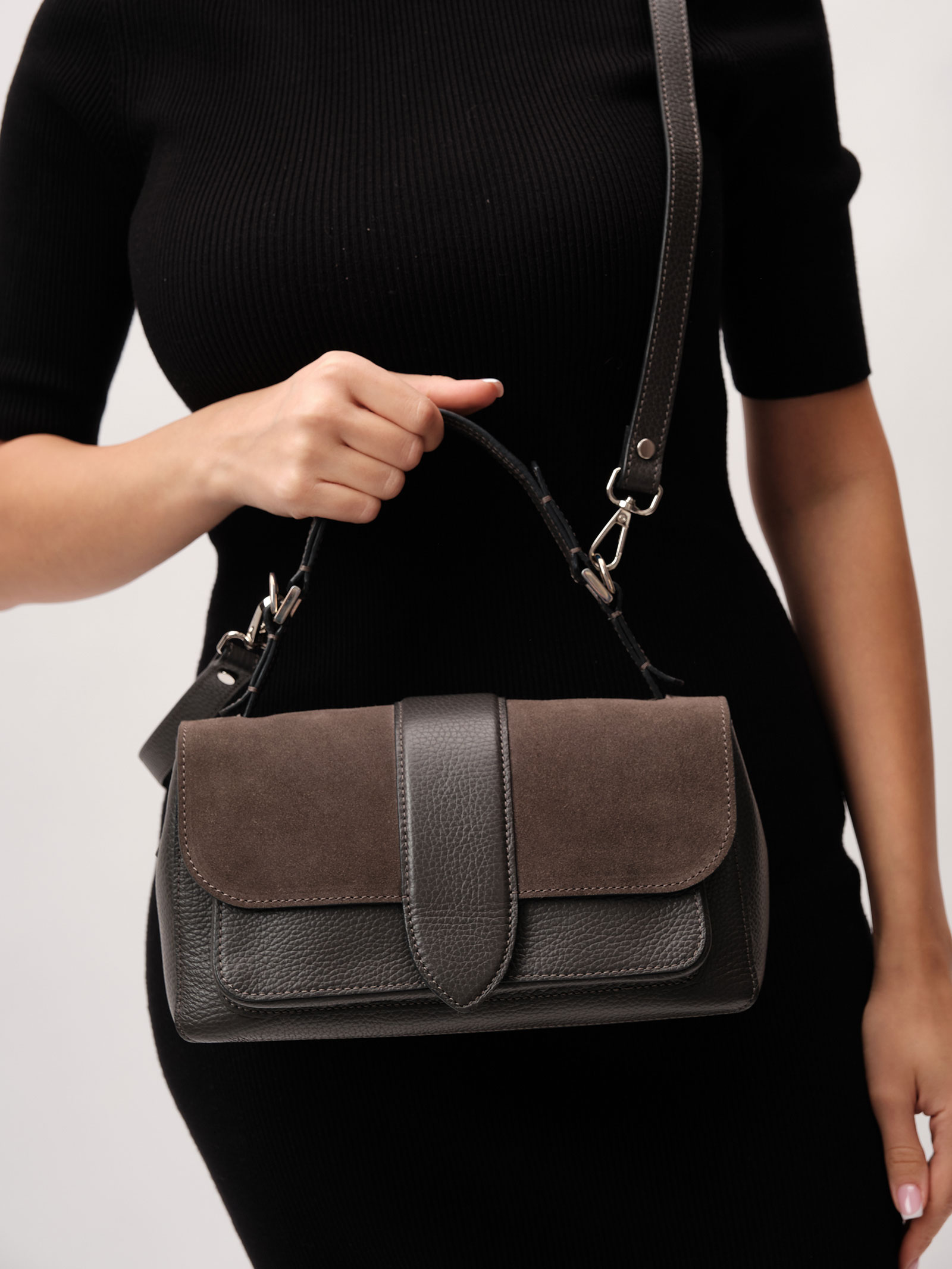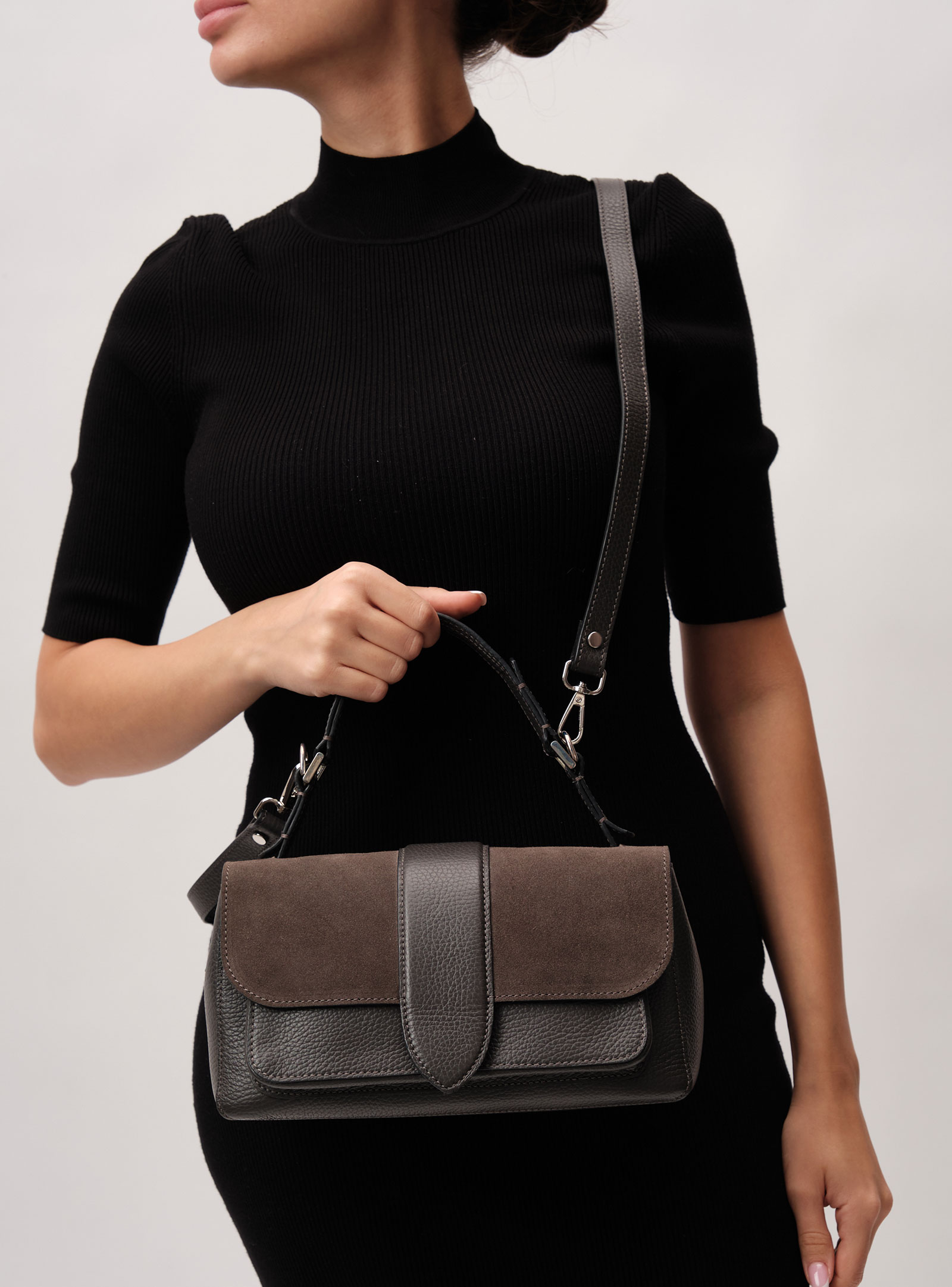 Детали: натуральная кожа, натуральная замша, несъемная ручка, съемный регулируемый плечевой ремень, 1 накладной внешний карман под клапаном, клапан с внутренней отделкой из натуральной замши на кнопке-магните, 1 внутренний закрытый карман на молнии, 1 внутреннее отделение, хлопковая водонепроницаемая подкладка.