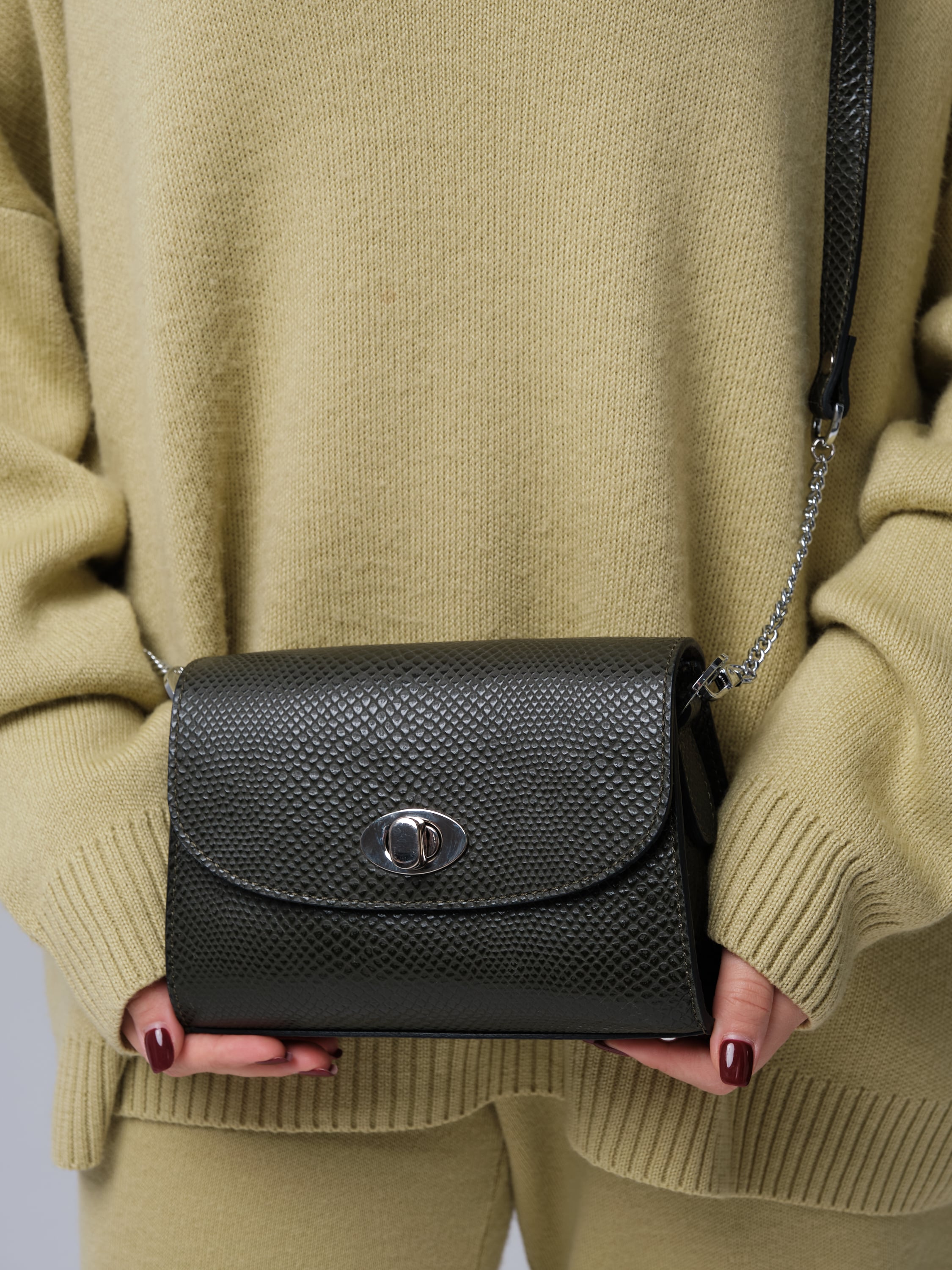 Небольшая женская сумка кросс-боди в темно-зеленом цвете Deboro 30300 олива/аризона из натуральной кожи. Клапан с внутренней стороны изготовлен из натуральной замши, закрывается на замок-вертушку.