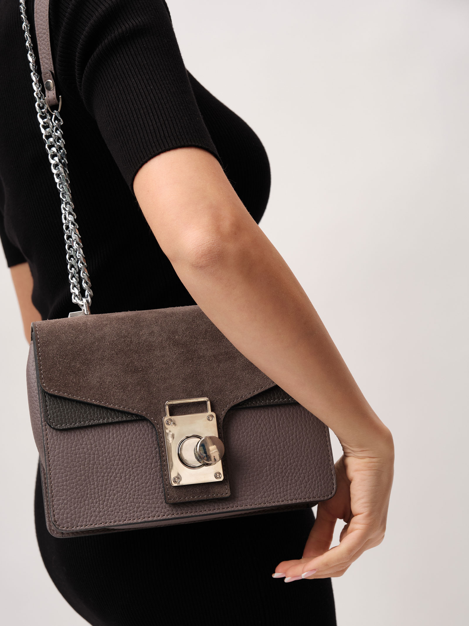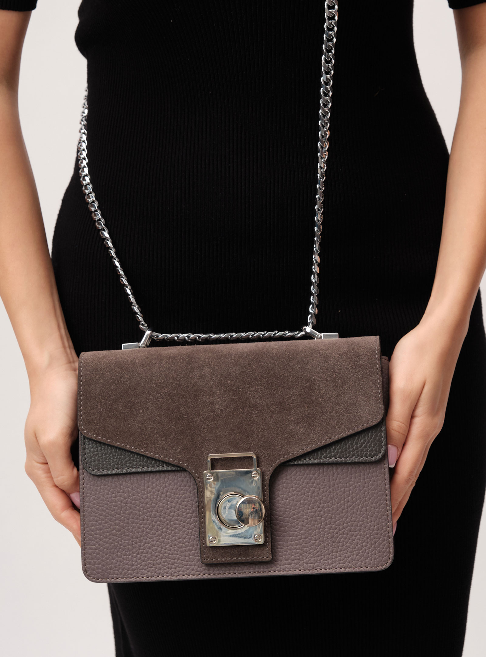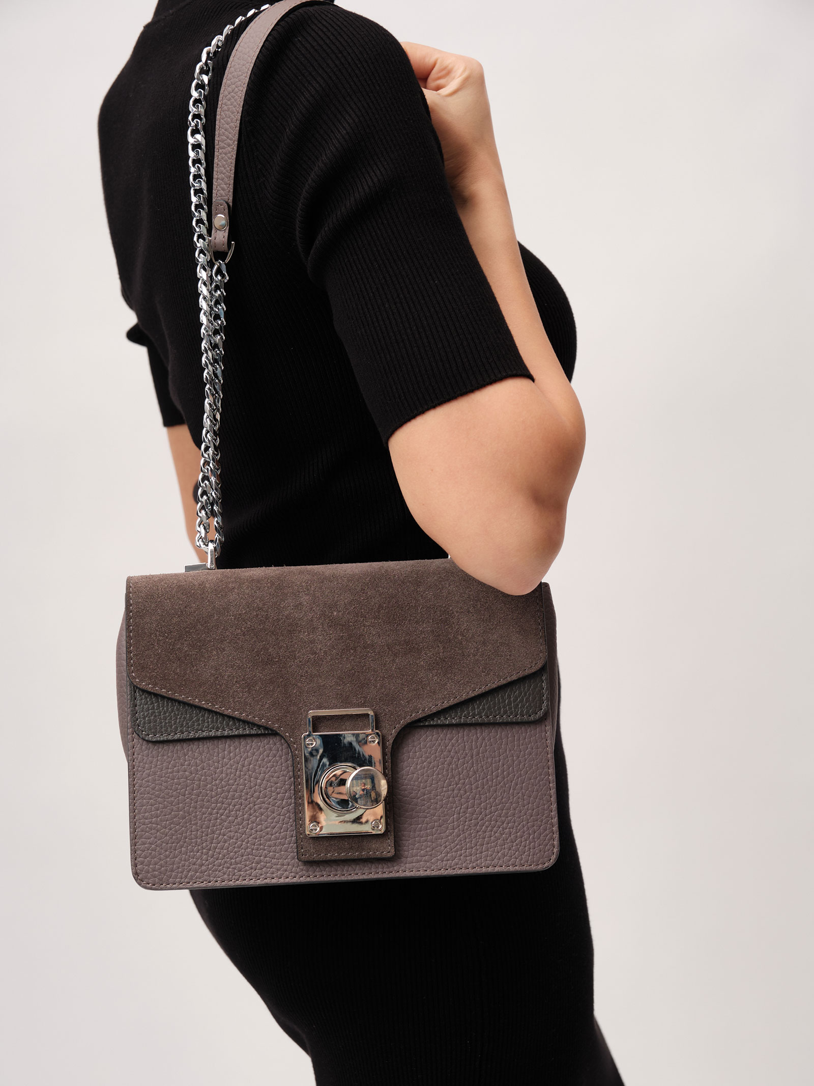 Детали: натуральная кожа, натуральная замша, несъемная регулируемая ручка-цепочка, 1 внутреннее отделение, 1 внутренний закрытый карман на молнии в рамке из натуральной кожи, застежка на клапан с внутренней отделкой из натуральной замши.