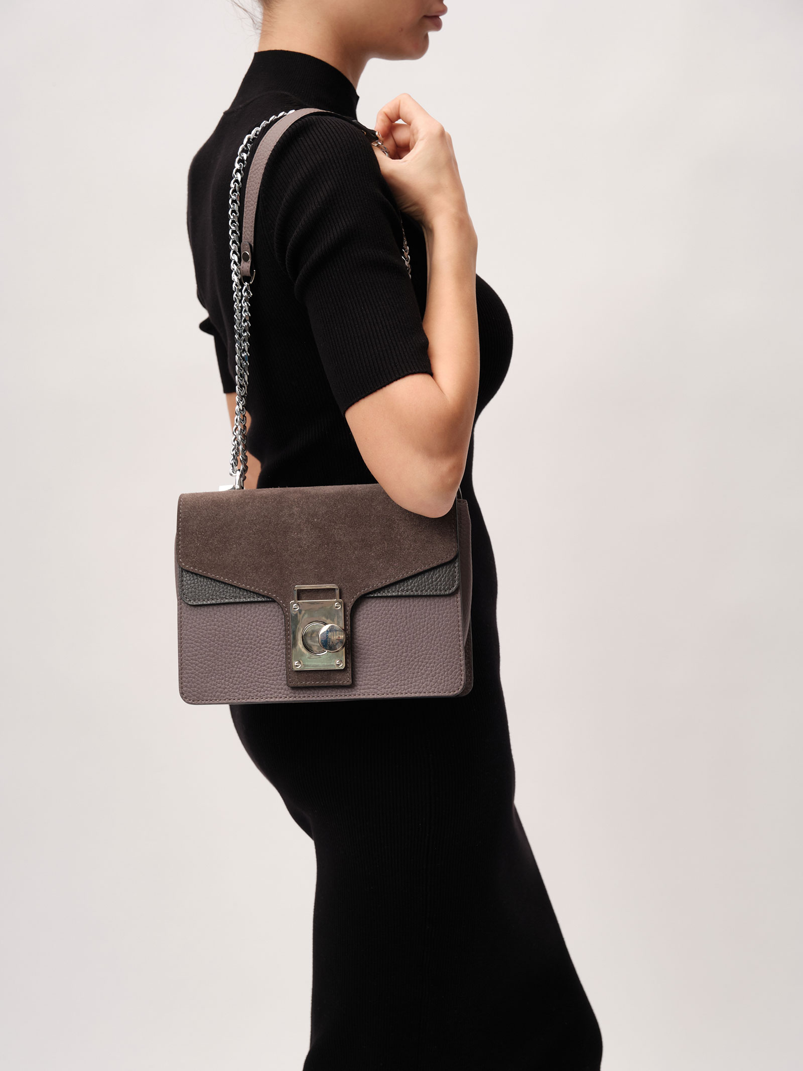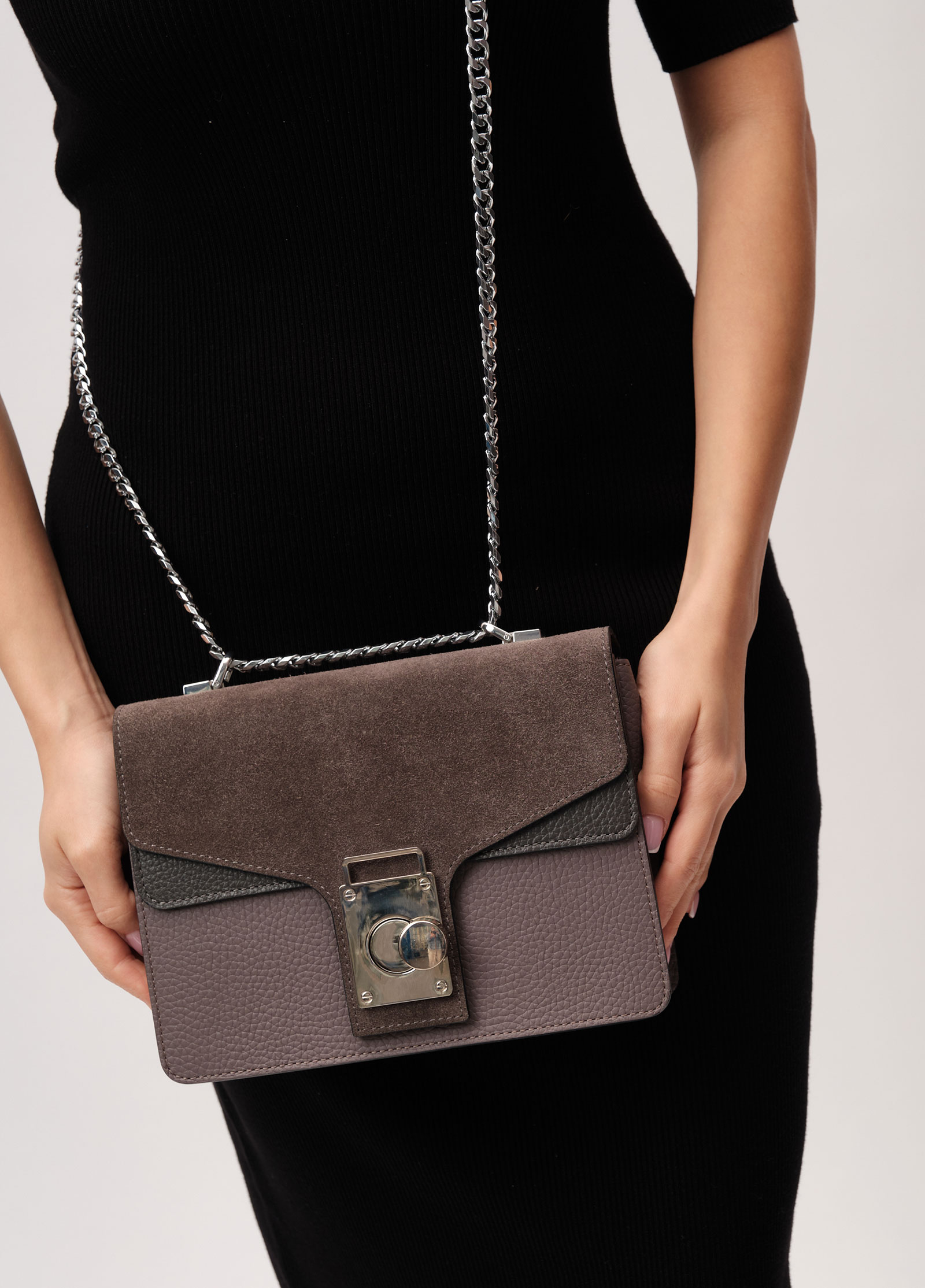 Женская кожаная сумка с ручкой-цепочкой Deboro 30310 серо-сливовый из натуральной кожи и замши.
