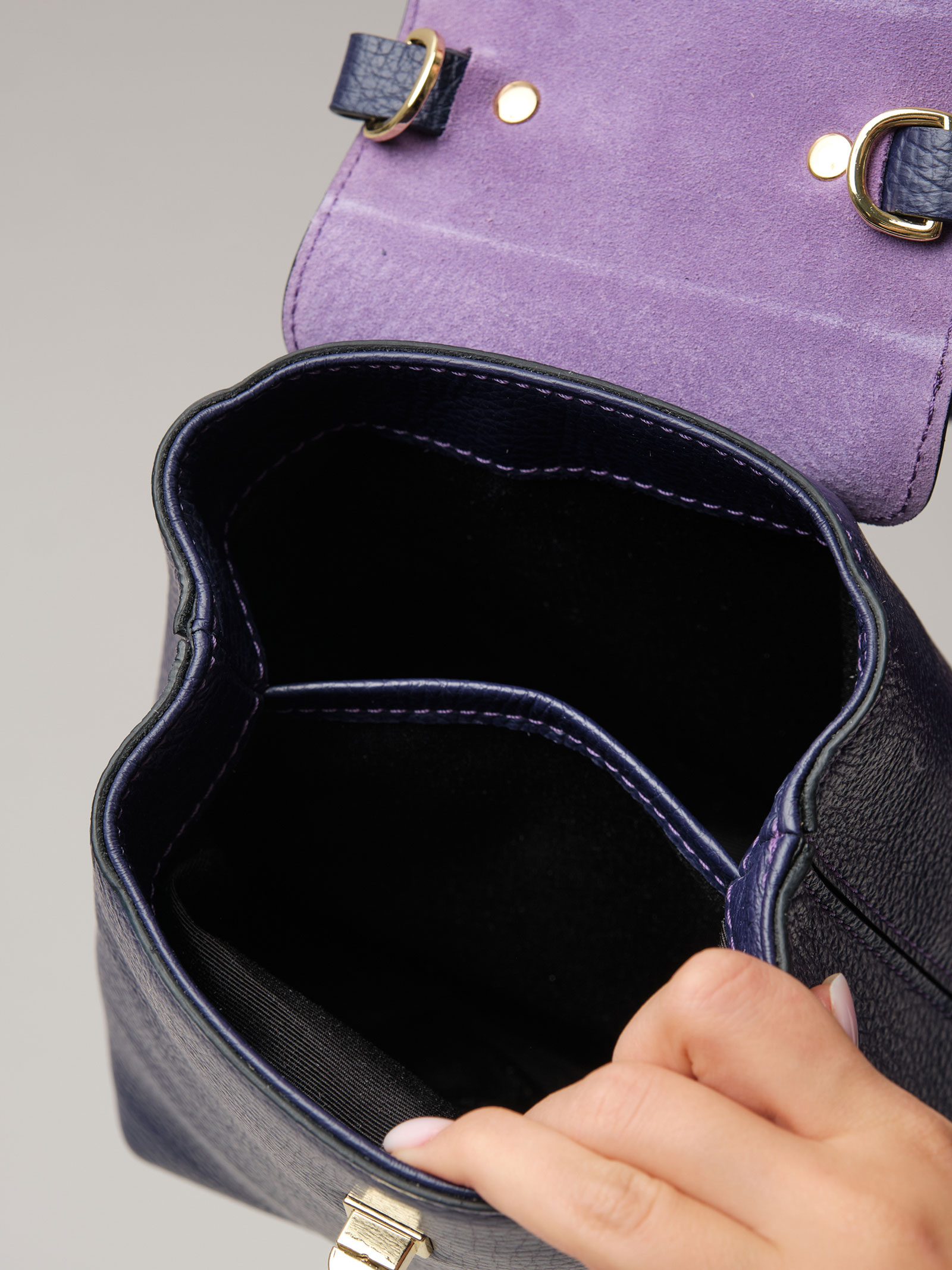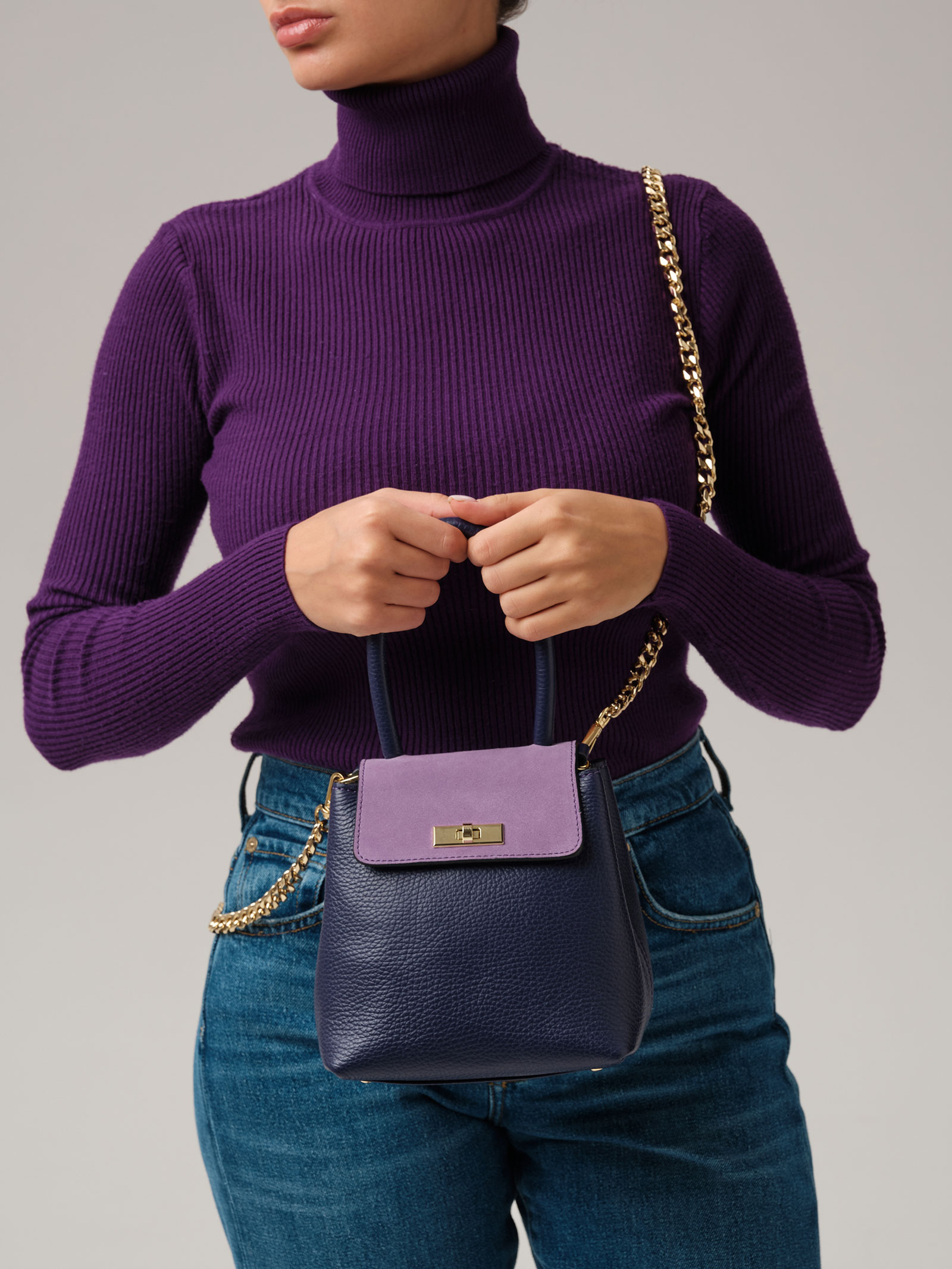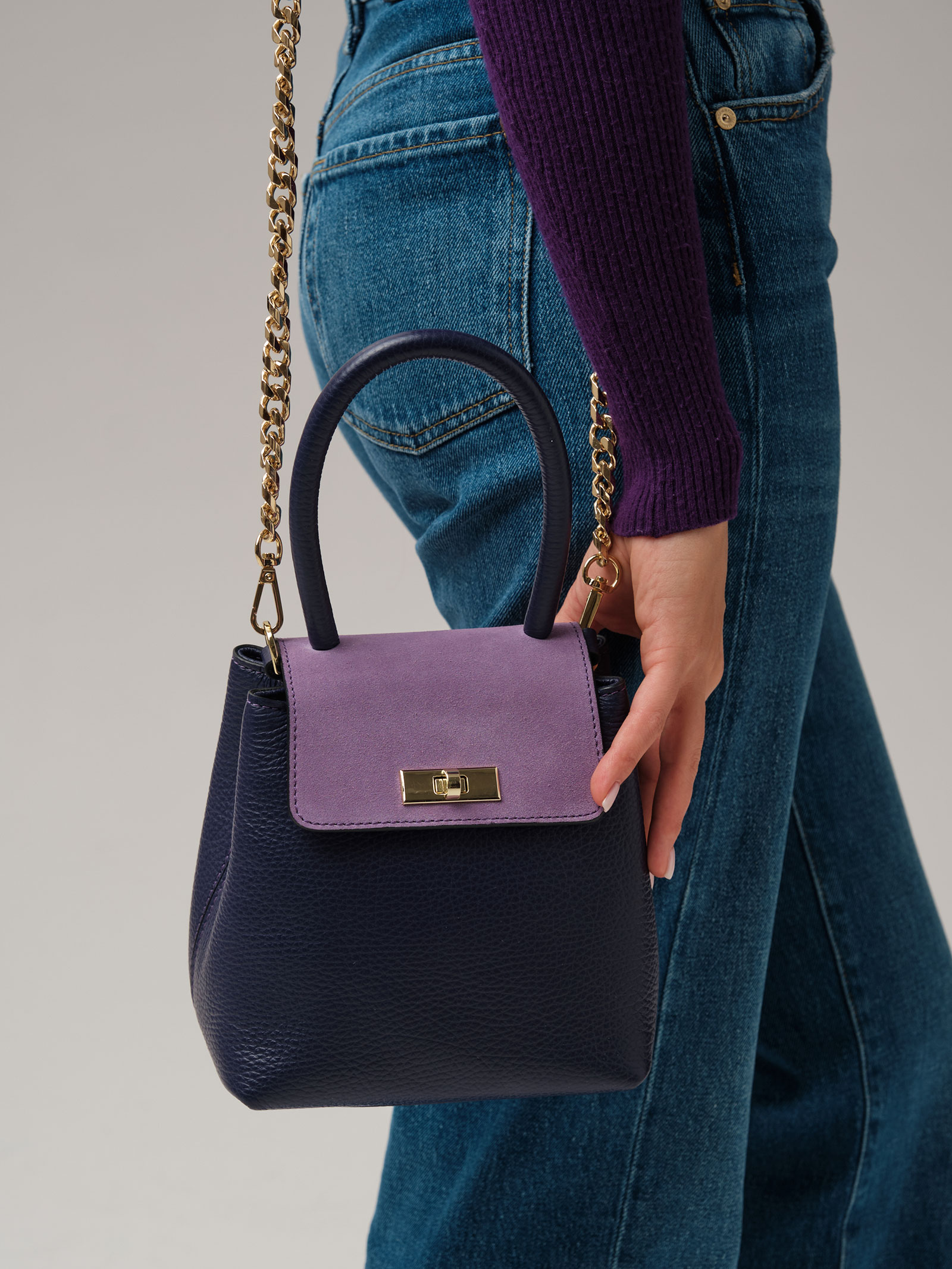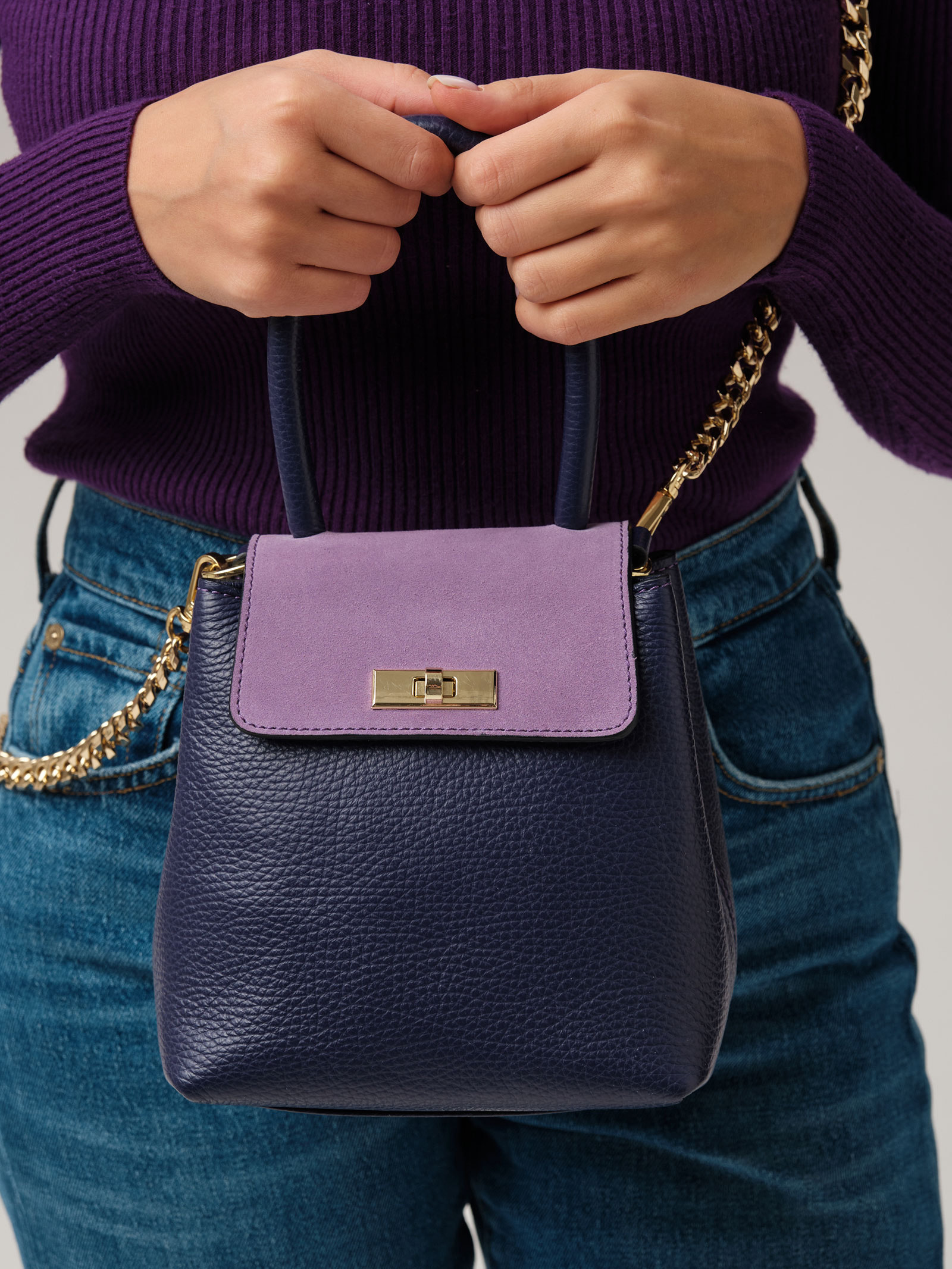 Детали: натуральная кожа, натуральная замша, съемная нерегулируемая ручка-цепочка с кожаной вставкой, 2 внутренних отделения на хлопковой водонепроницаемой подкладке, клапан из натуральной замши и застежкой на замок-вертушку, металлические ножки.