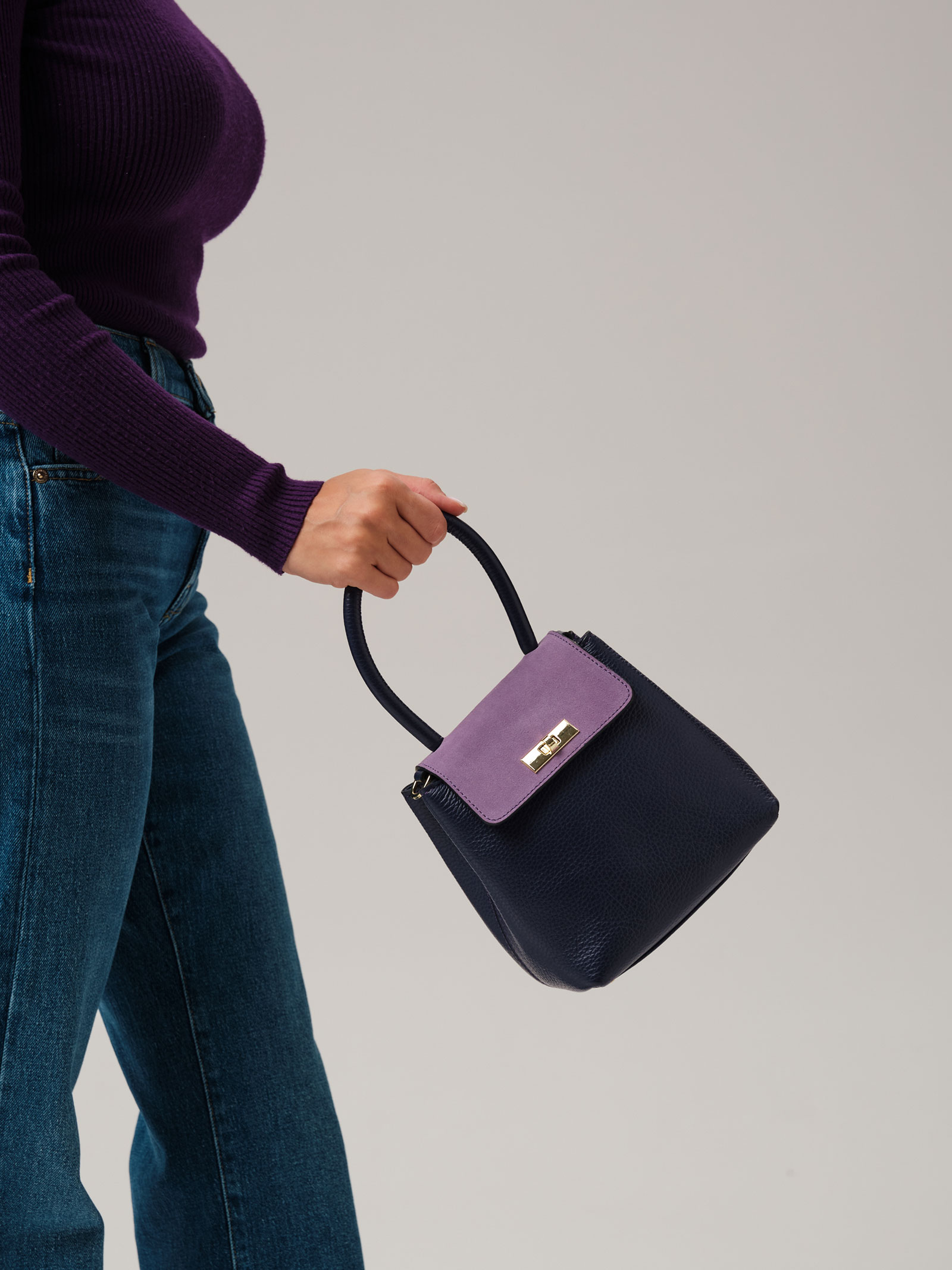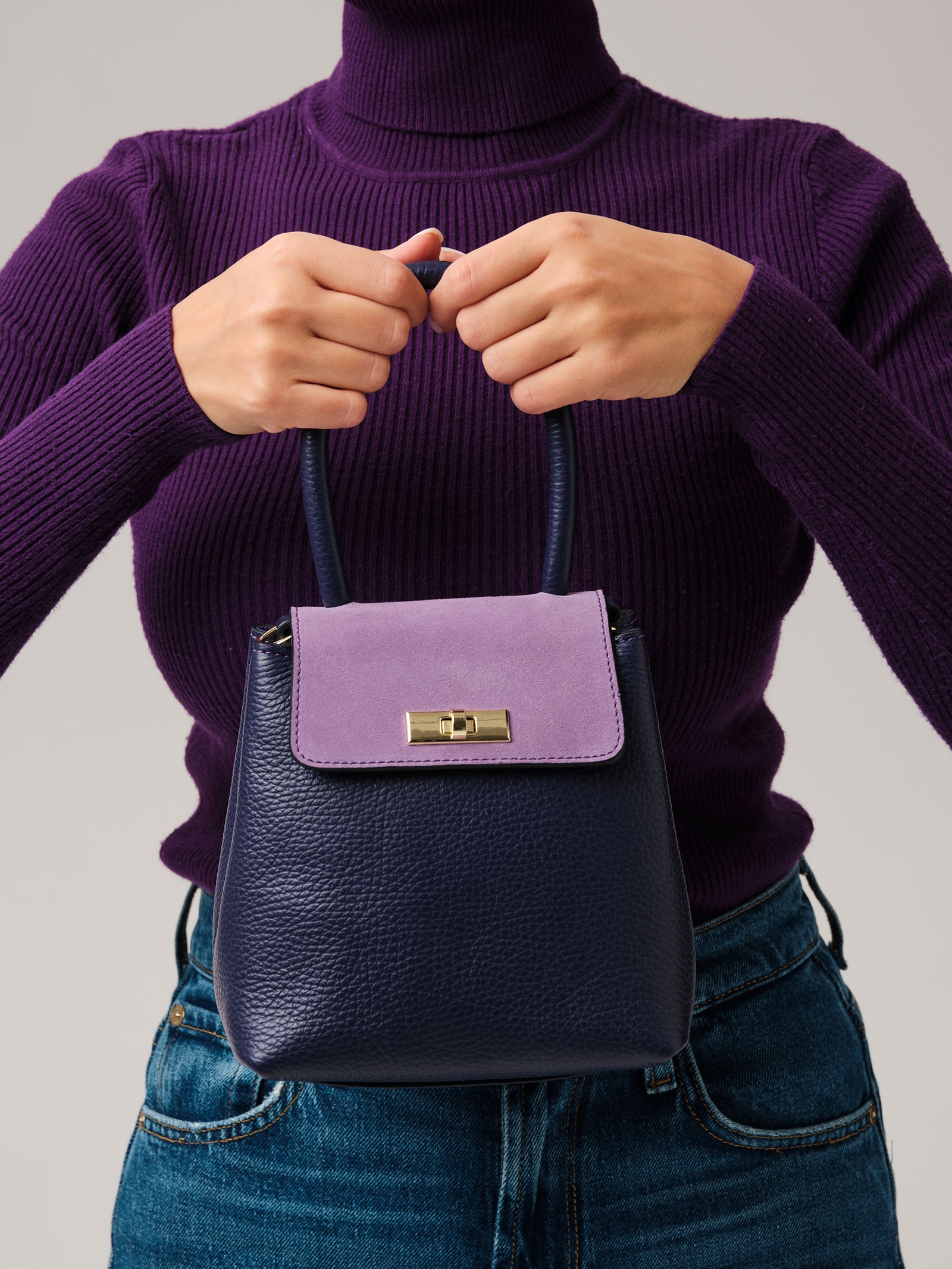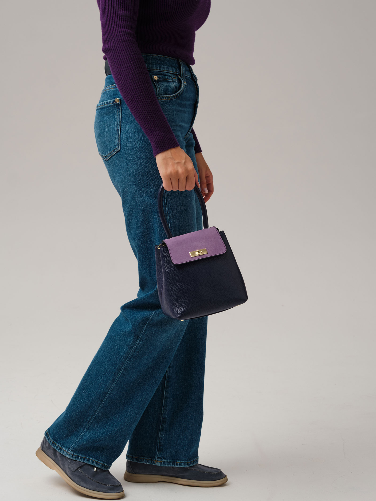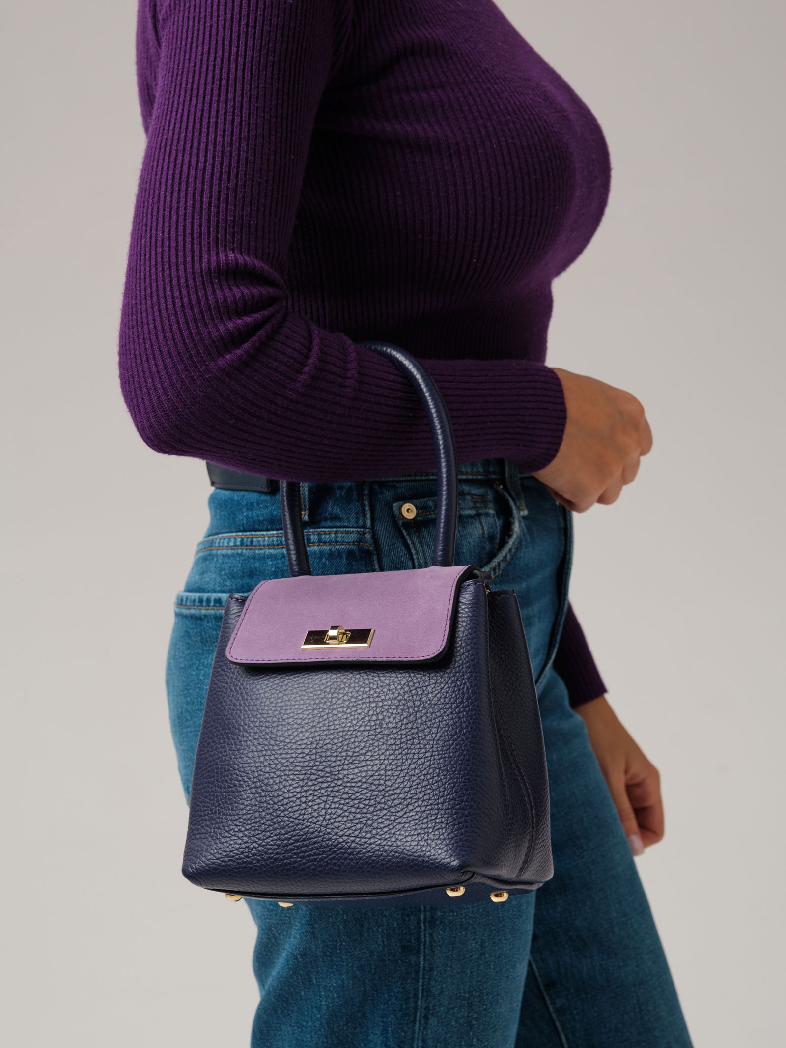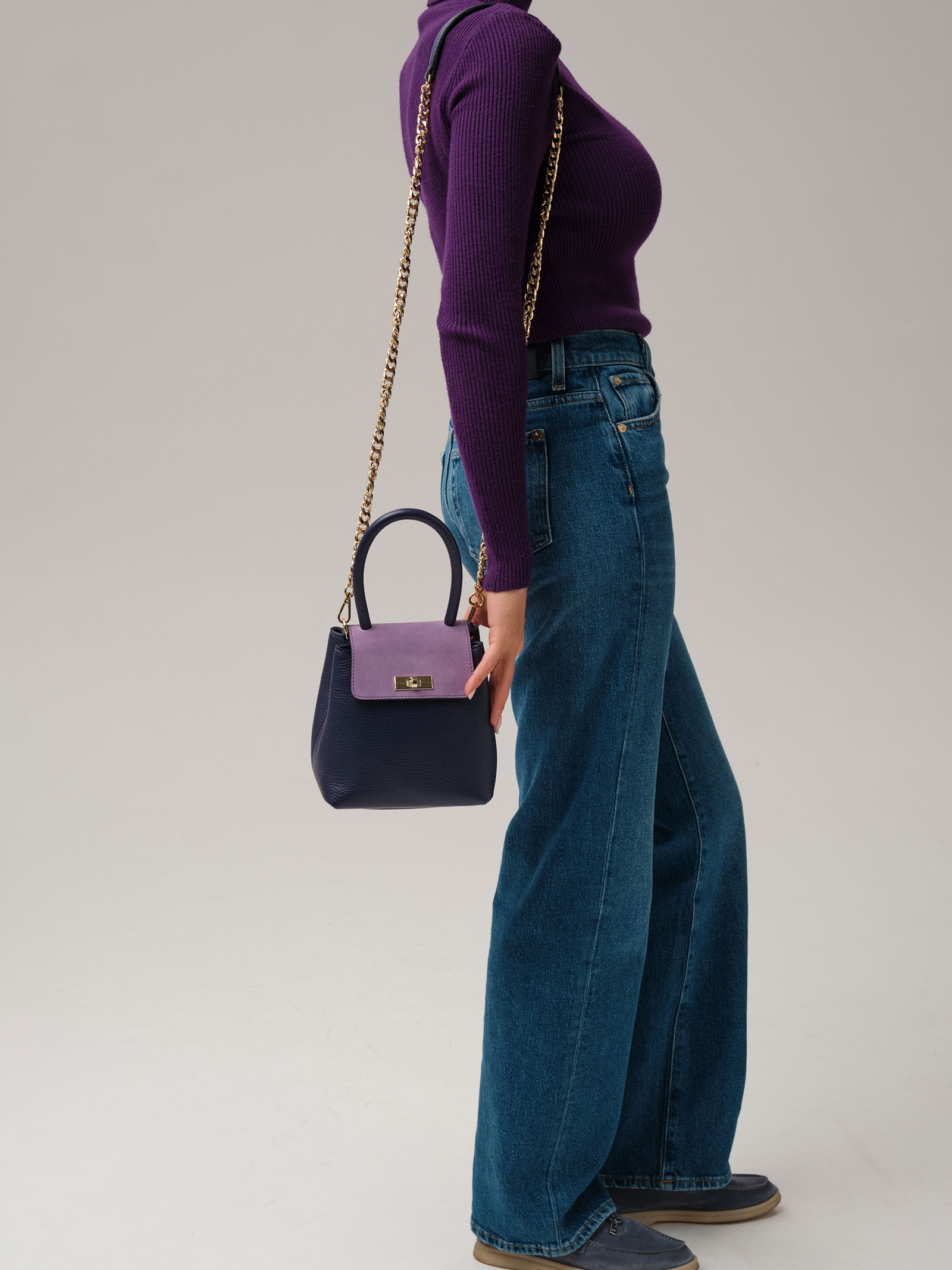 Детали: натуральная кожа, натуральная замша, съемная нерегулируемая ручка-цепочка с кожаной вставкой, 2 внутренних отделения на хлопковой водонепроницаемой подкладке, клапан из натуральной замши и застежкой на замок-вертушку, металлические ножки.