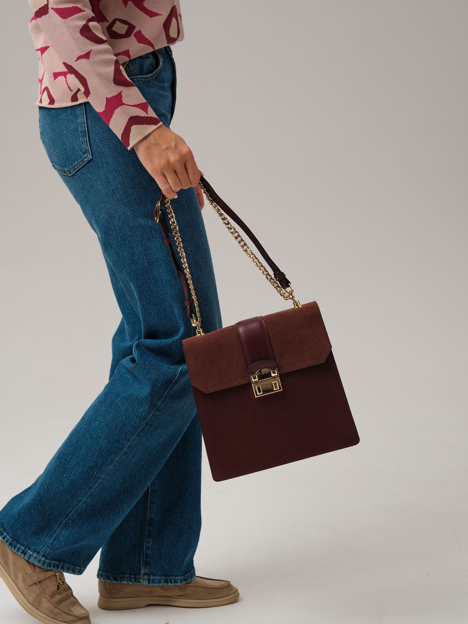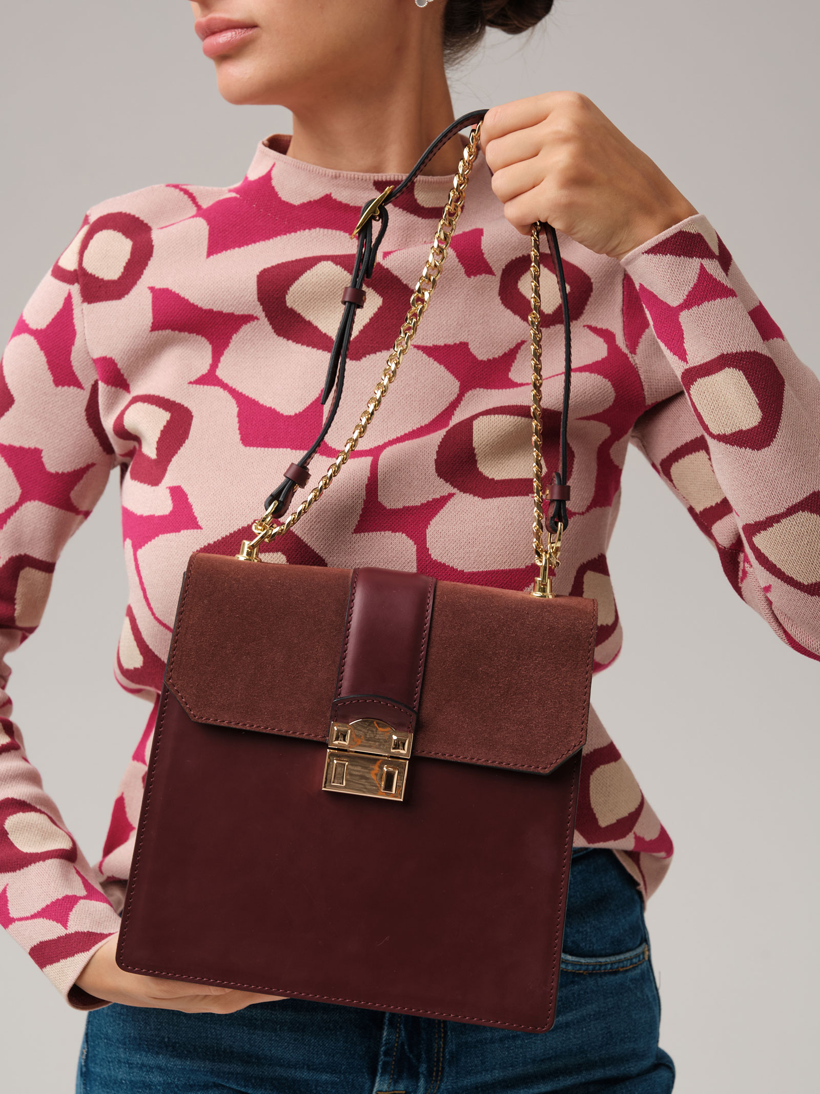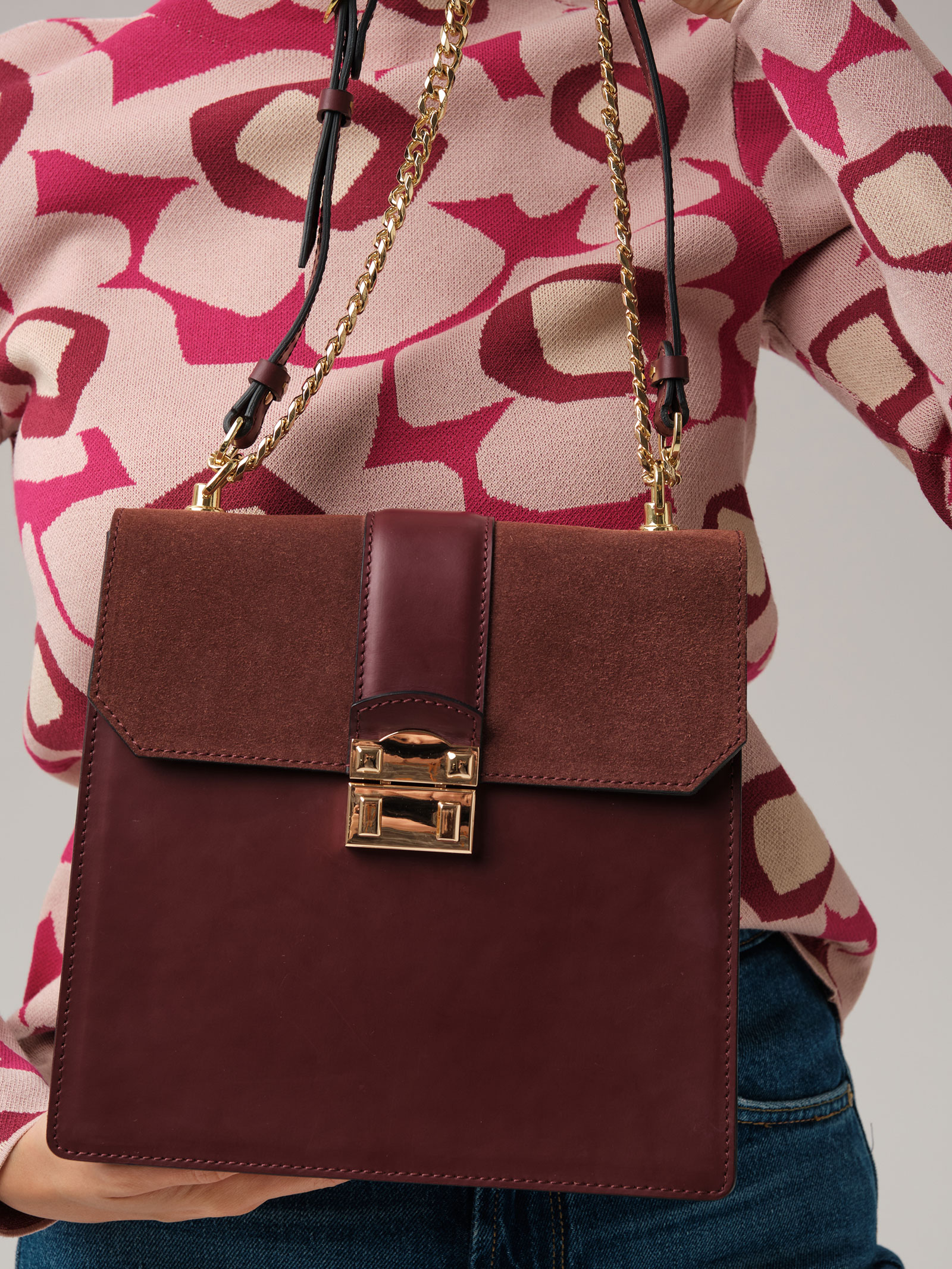 Детали: натуральная кожа, натуральная замша, несъемный регулируемый ремень из комбинации цепочки и кожи, 1 внутреннее отделение на хлопковой водонепроницаемой подкладке, 1 внутренний закрытый карман на молнии, клапан с внутренней отделкой из натуральной замши, застежка на замок-вертушку.