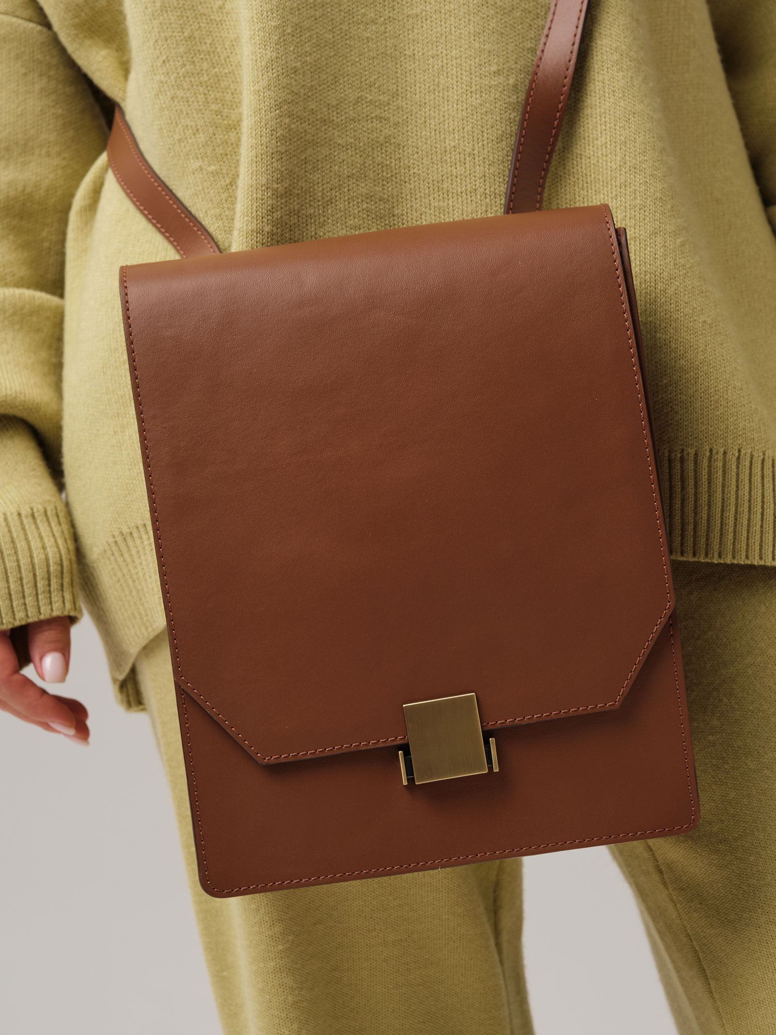 Детали: натуральная кожа, несъемный регулируемый плечевой ремень, 1 внутреннее отделение на хлопковой водонепроницаемой подкладке, 1 внутренний закрытый карман на молнии, клапан с внутренней отделкой из натуральной замши и замком-вертушкой.