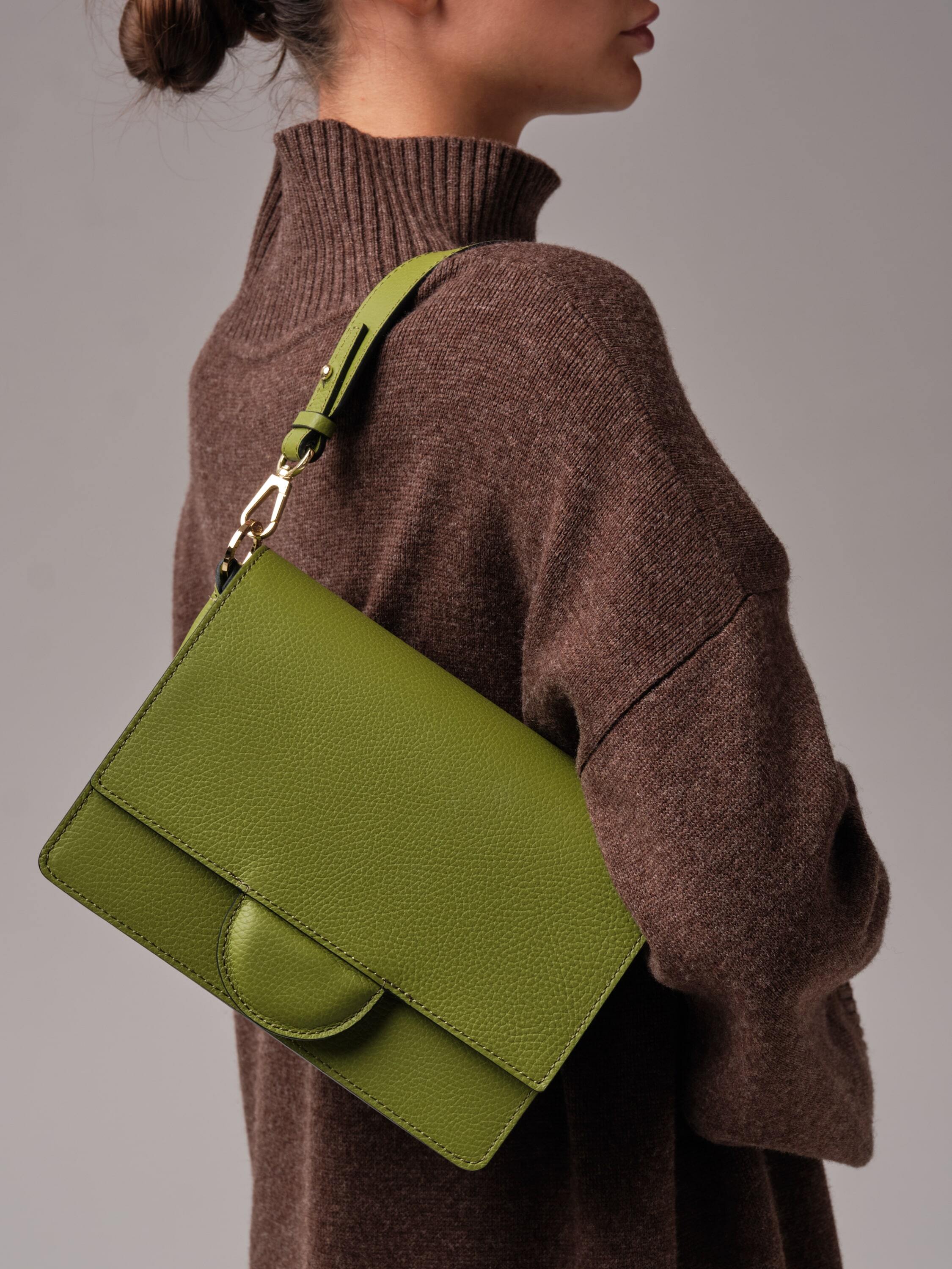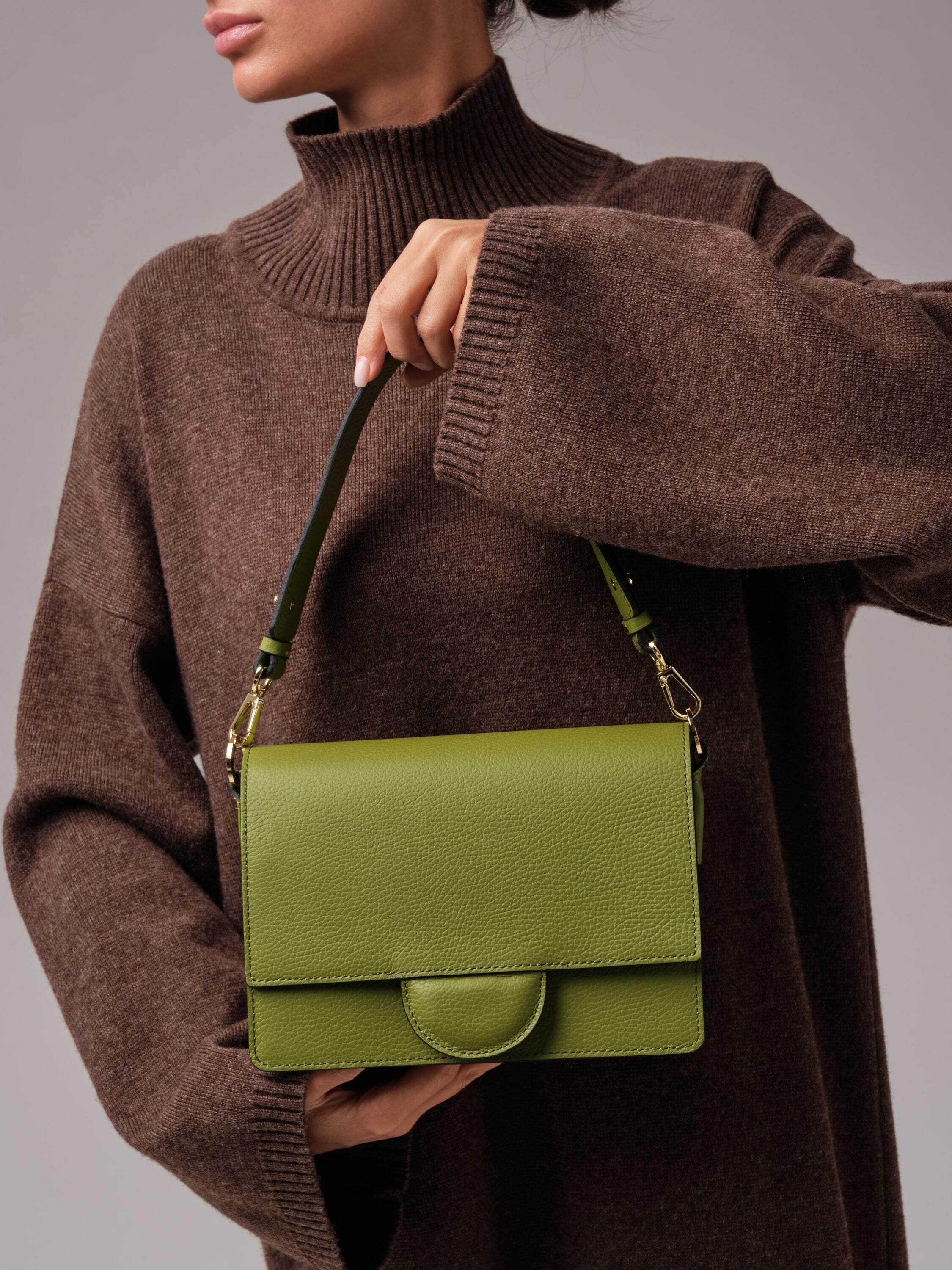 :Женская сумка через плечо из натуральной кожи в актуальном цвете Зеленый бамбук. Эта элегантная кросс-боди модель станет превосходным дополнением вашего гардероба и подойдет как для повседневных прогулок, так и для особых случаев. Сумка на плечо гарантирует комфорт и удобство, а её средний размер позволяет с легкостью разместить все необходимые вещи.