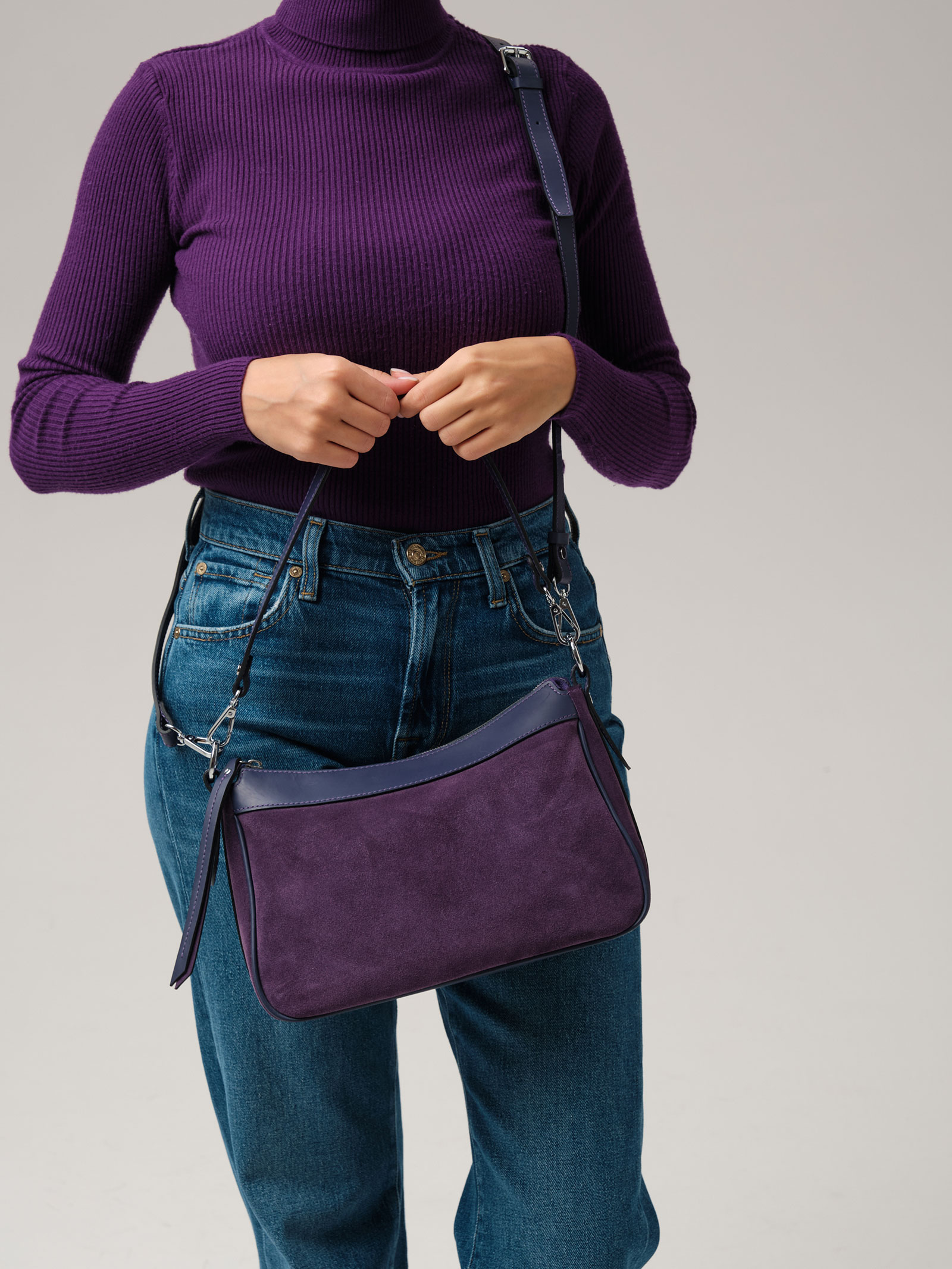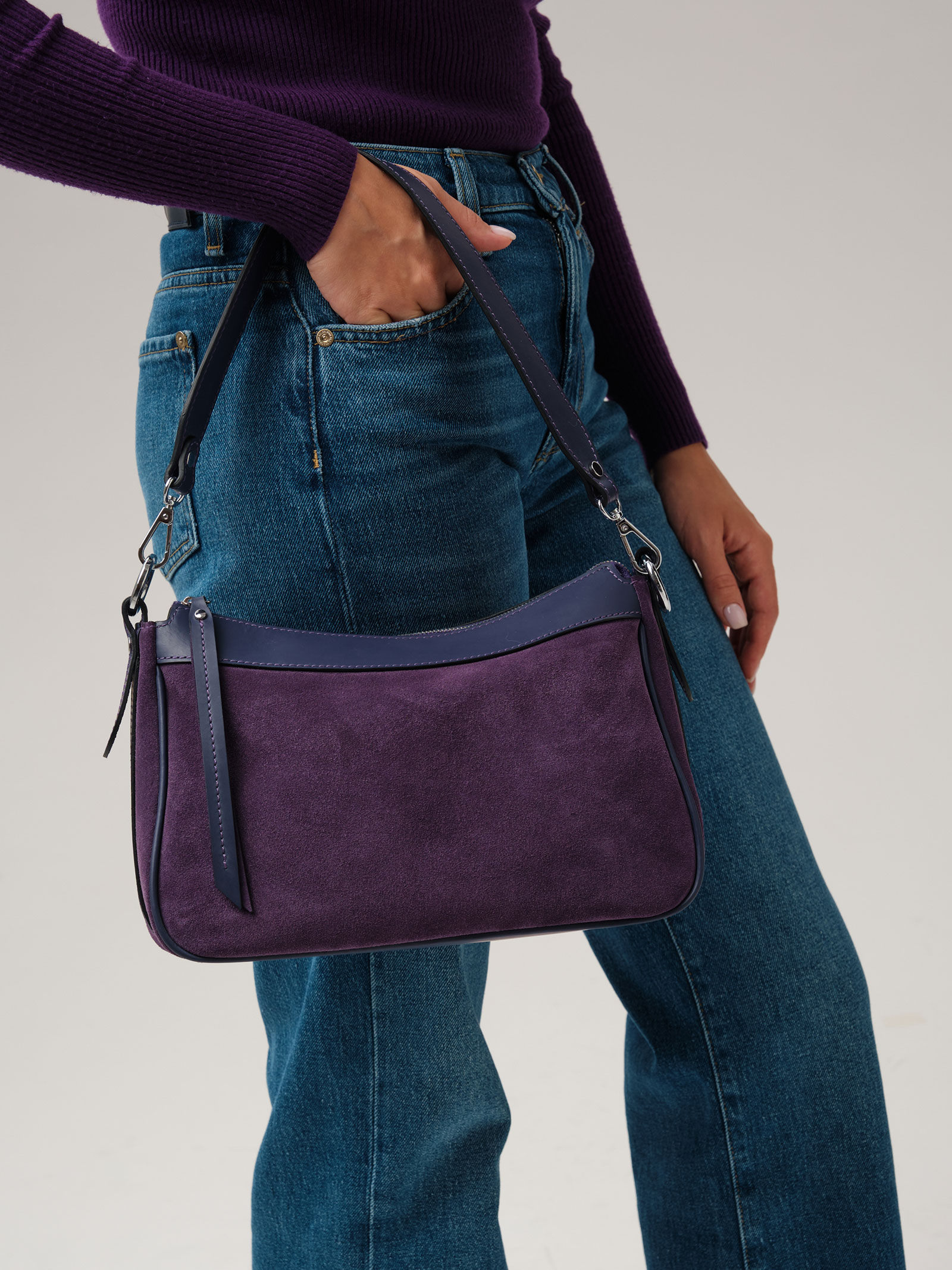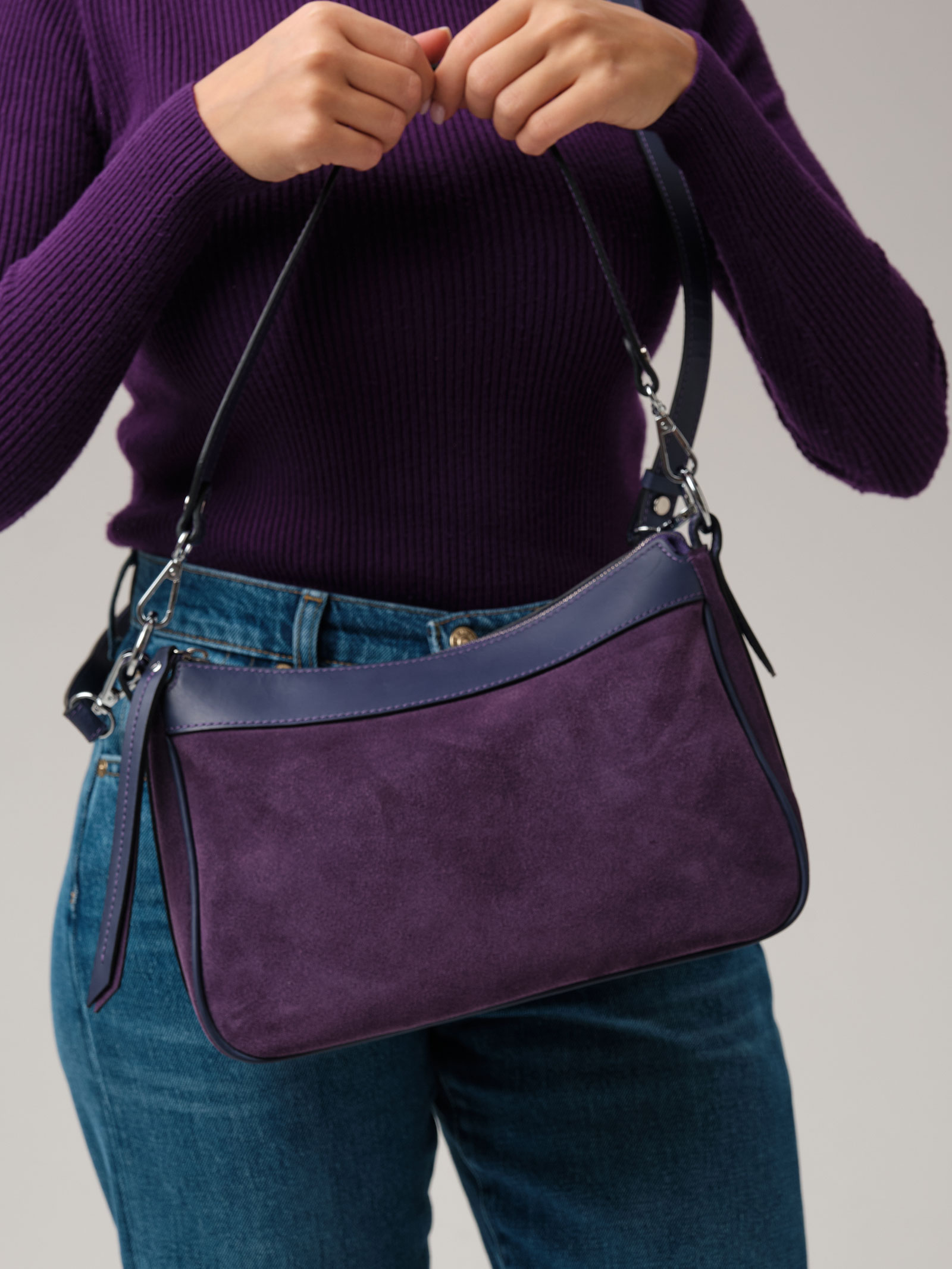 Детали: натуральная кожа, натуральная замша, 2 съемных ремня в комплекте - нерегулируемый короткий ремень, регулируемый длинный ремень, застежка на металлическую молнию с пуллером из натуральной кожи, 1 внутреннее отделение на хлопковой водонепроницаемой подкладке, 1 внутренний закрытый карман на молнии, металлические ножки.