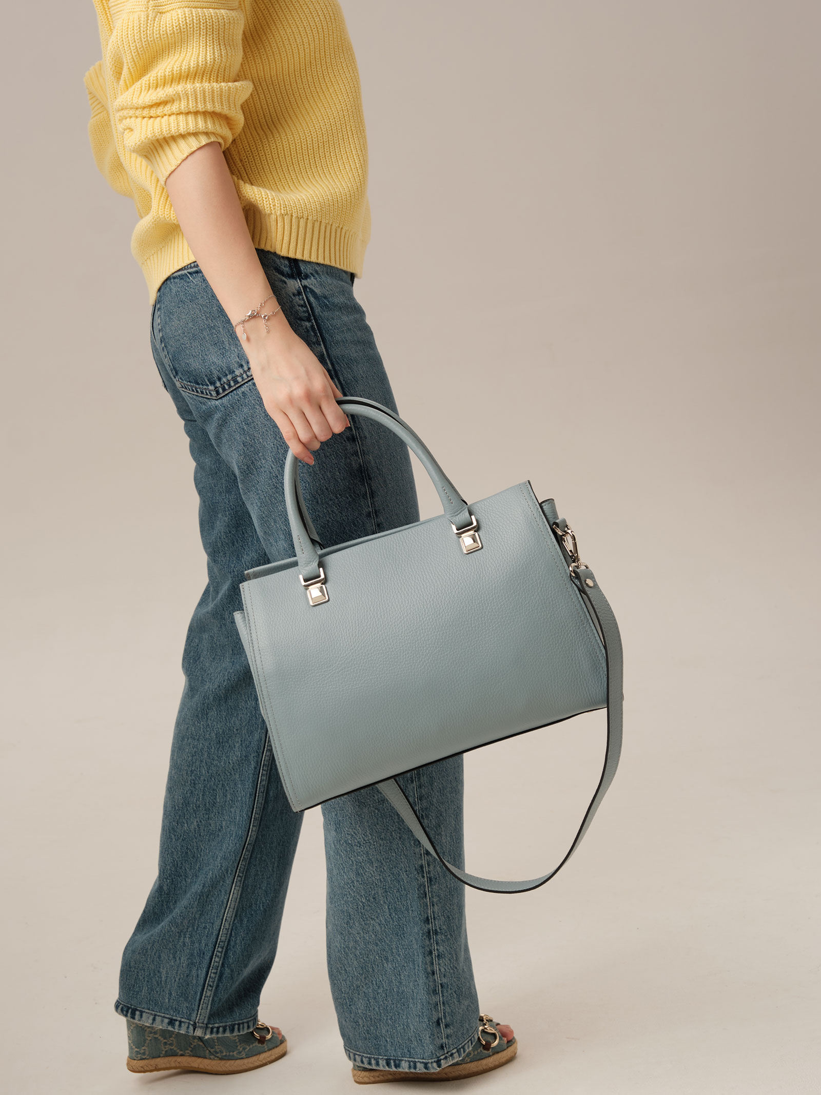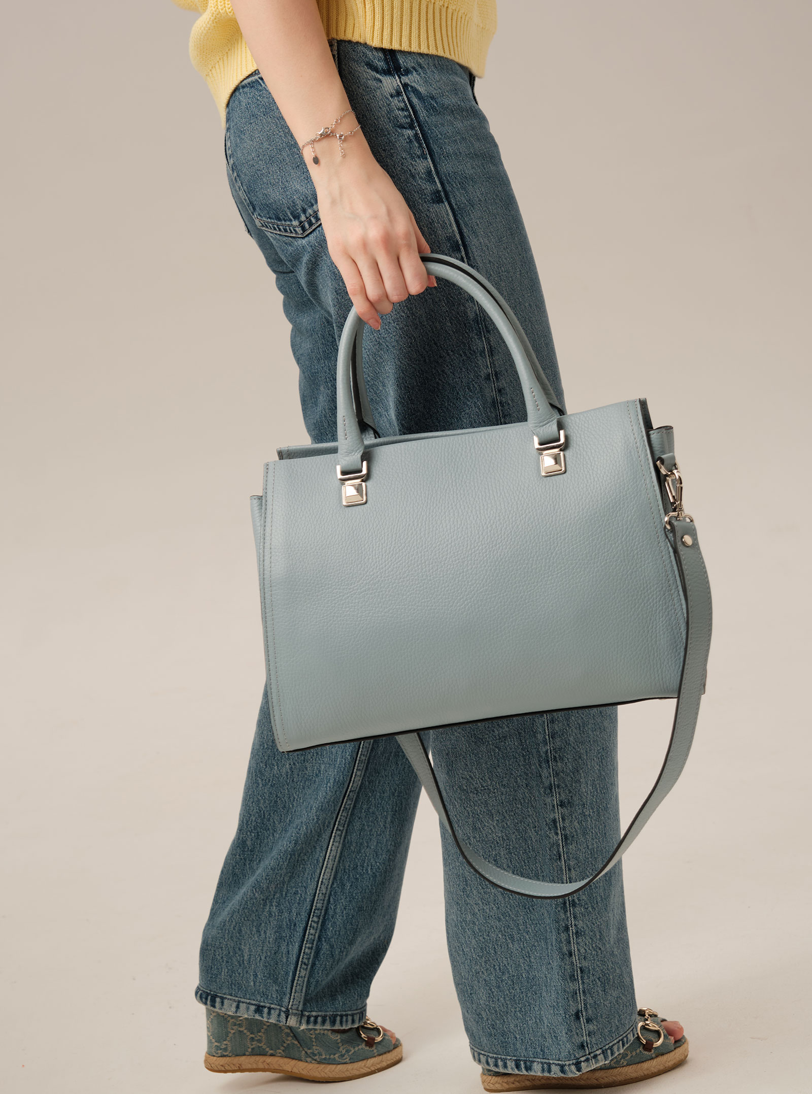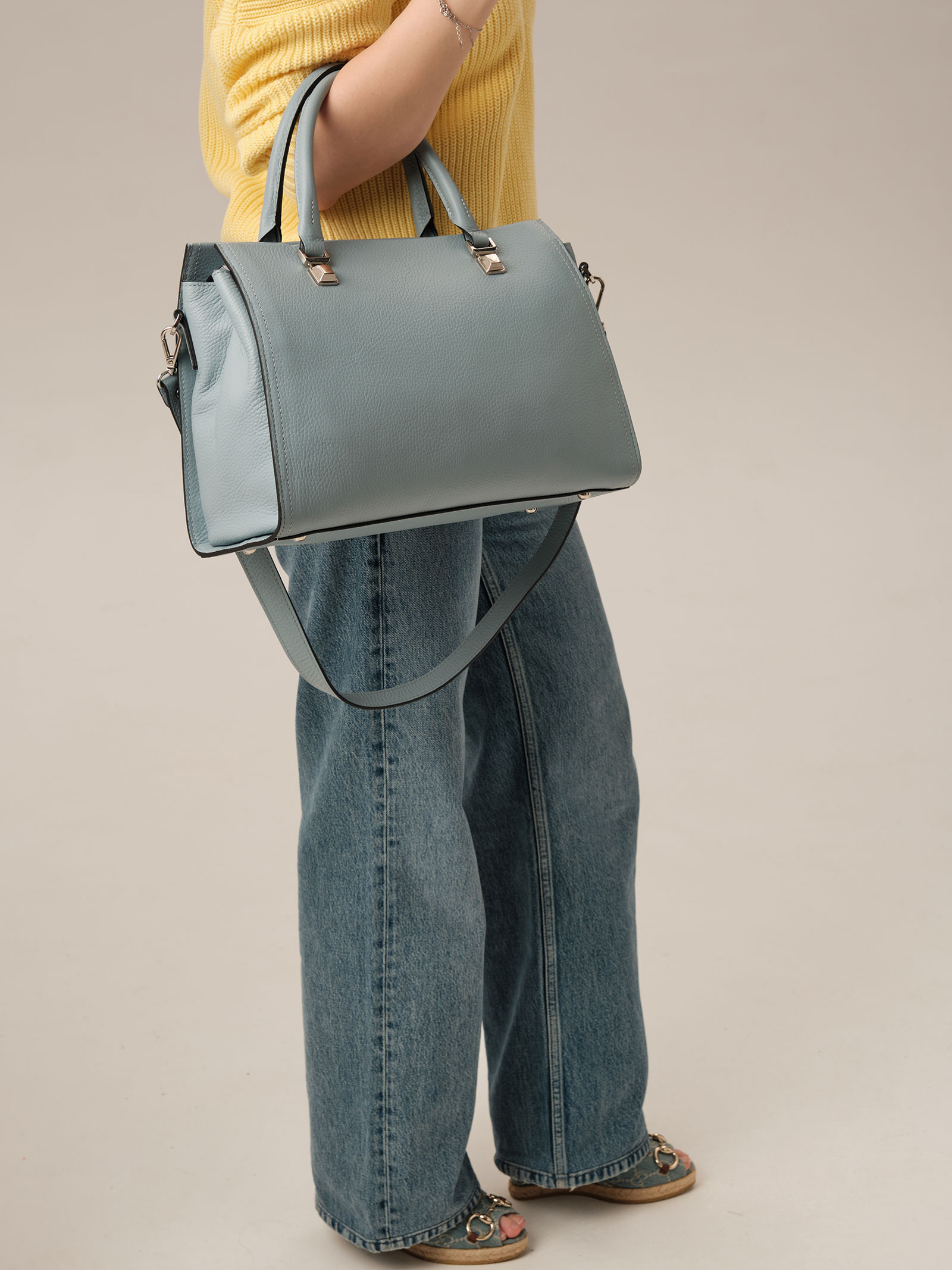 Детали: натуральная кожа, широкий съемный нерегулируемый плечевой ремень, 2 внутренних отделения, хлопковая водонепроницаемая подкладка, застежка на металлическую молнию с кожаным пуллером, 1 внутренний закрытый карман на молнии в рамке из натуральной кожи, 2 внутренних открытых кармана, 2 ручки, металлические ножки.