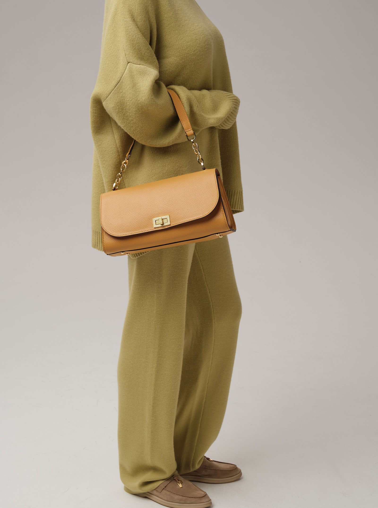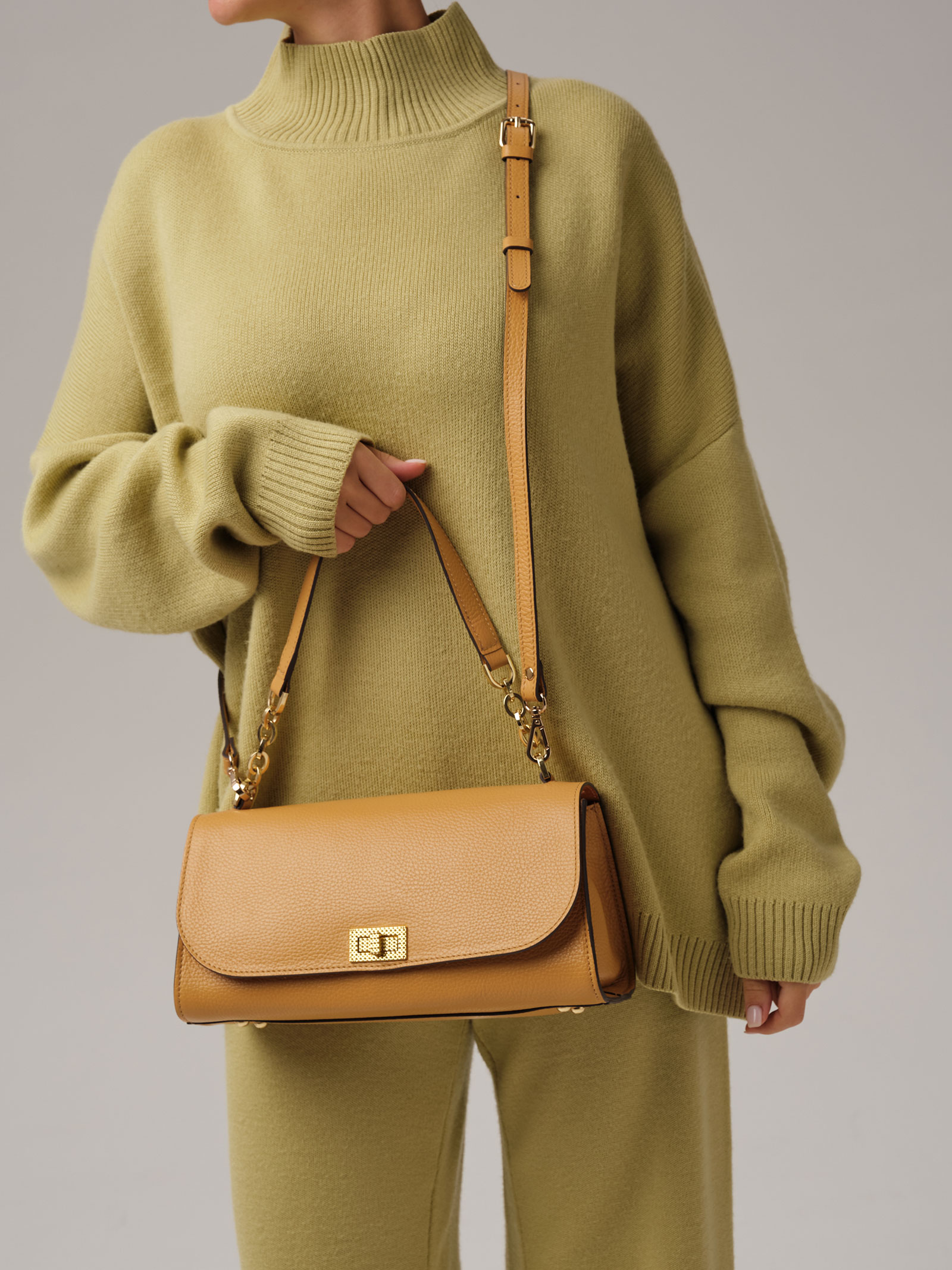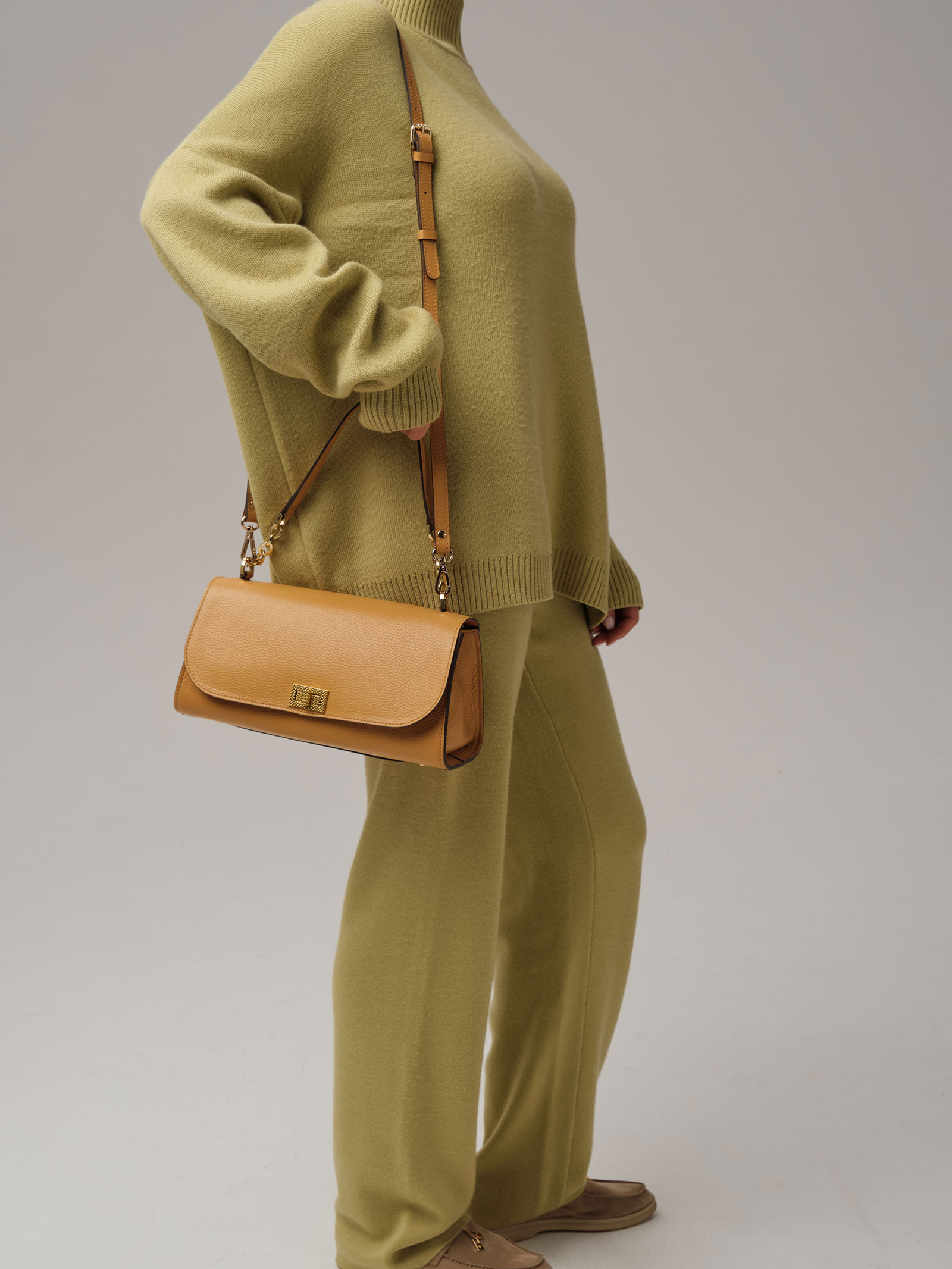 Детали: натуральная кожа, несъемная нерегулируемая ручка, съемный регулируемый плечевой ремень, 1 внутреннее отделение на хлопковой водонепроницаемой подкладке, 1 внутренний закрытый карман на молнии, клапан с внутренней отделкой из натуральной замши и замком-вертушкой, металлические ножки.
