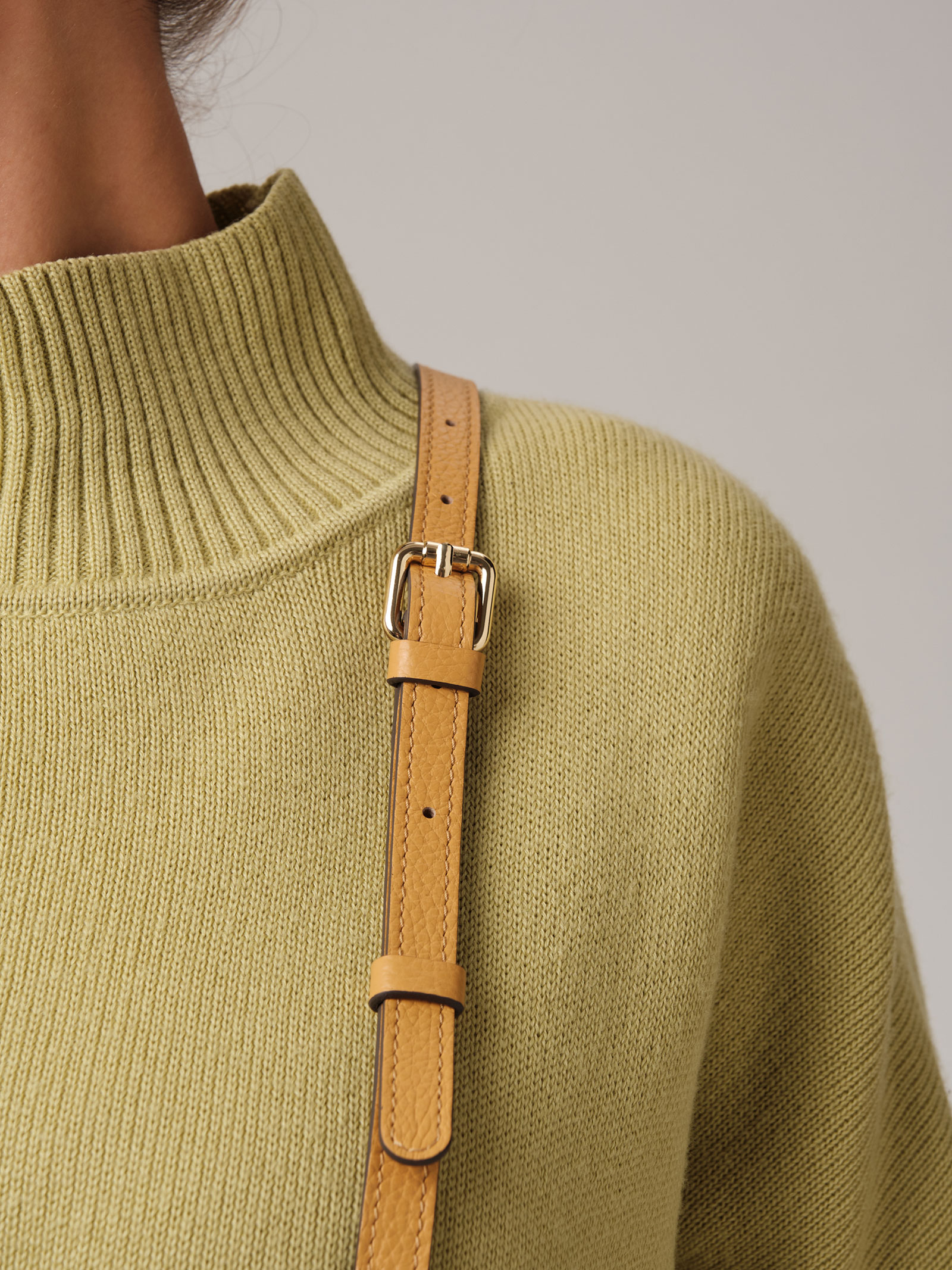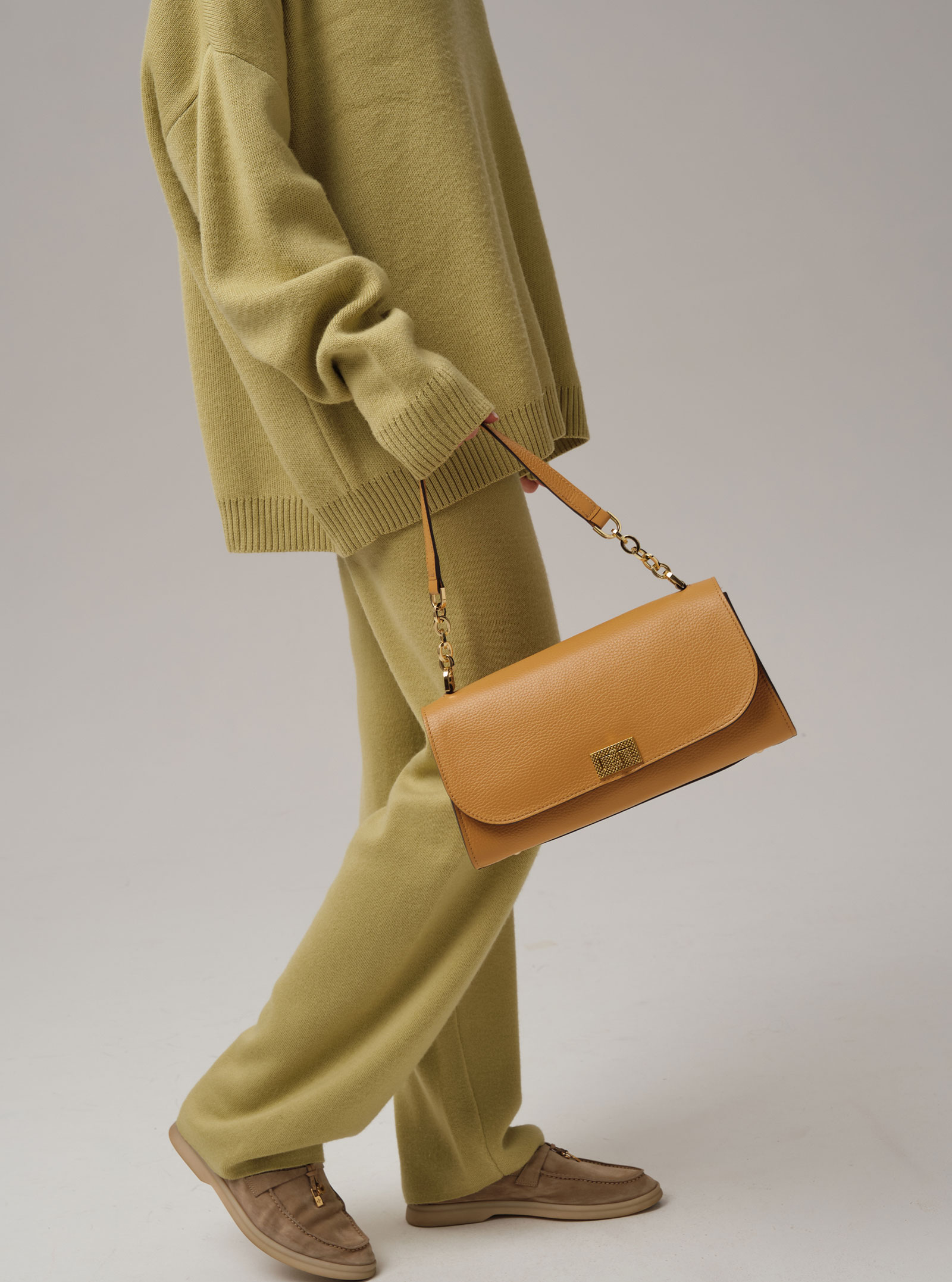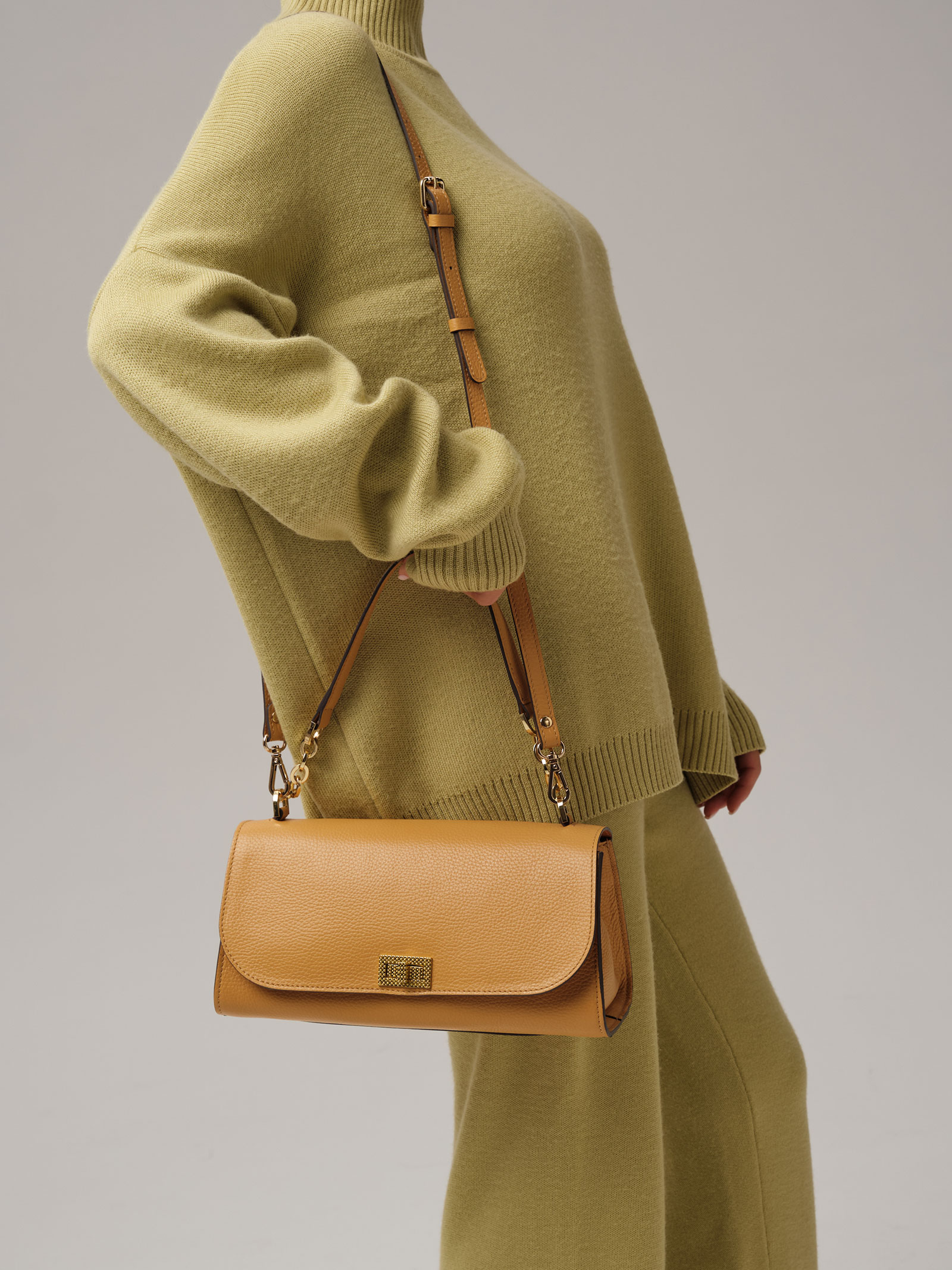 Детали: натуральная кожа, несъемная нерегулируемая ручка, съемный регулируемый плечевой ремень, 1 внутреннее отделение на хлопковой водонепроницаемой подкладке, 1 внутренний закрытый карман на молнии, клапан с внутренней отделкой из натуральной замши и замком-вертушкой, металлические ножки.