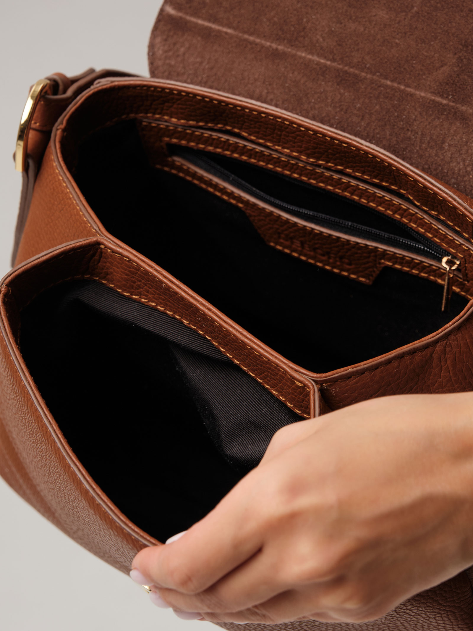 Детали: натуральная кожа, клапан на магните с внутренней отделкой из натуральной замши, 2 внутренних отделения на хлопковой водонепроницаемой подкладке, 1 внутренний закрытый карман на молнии, несъемный нерегулируемый короткий ремень, съемный регулируемый длинный ремень.