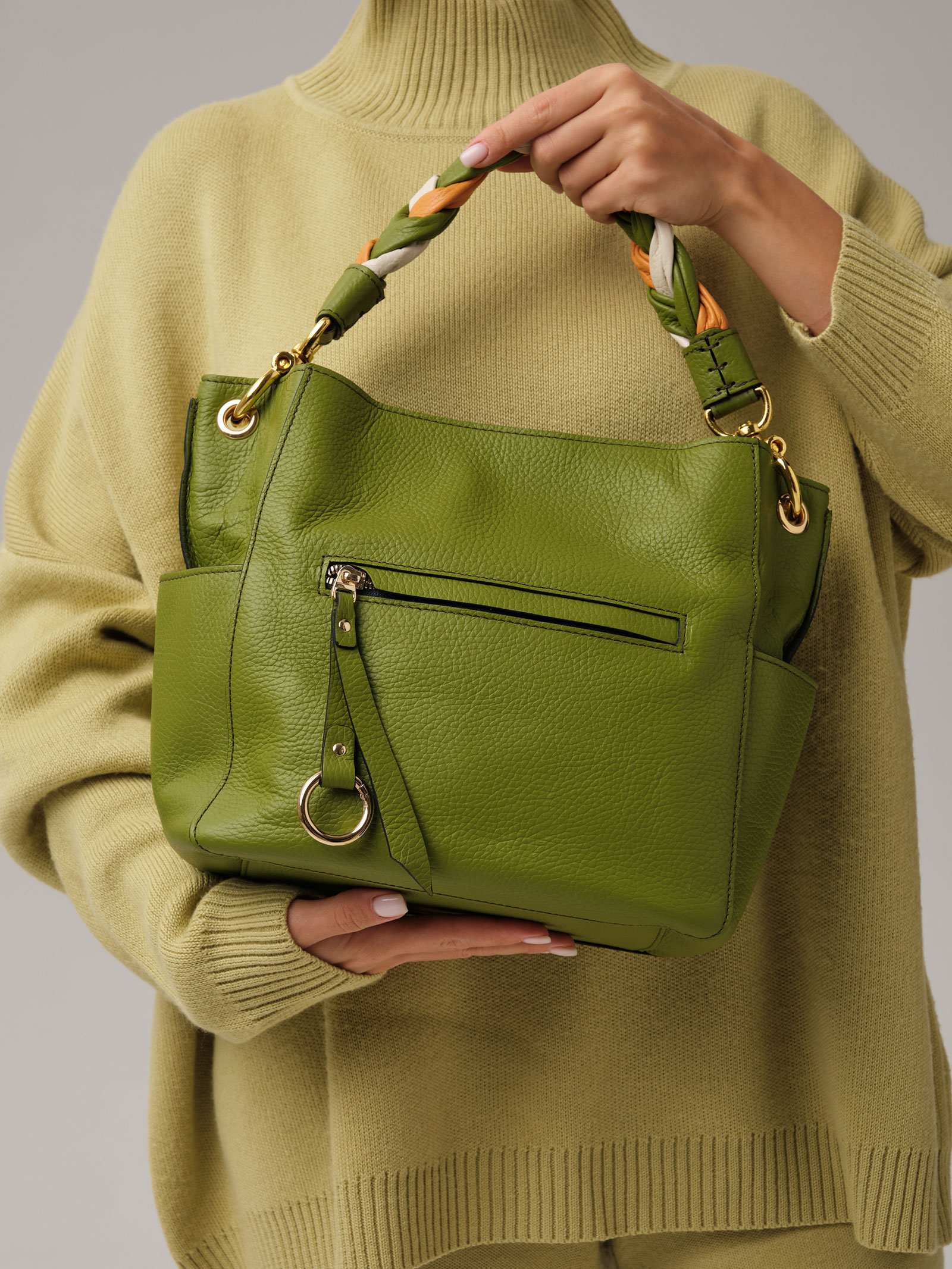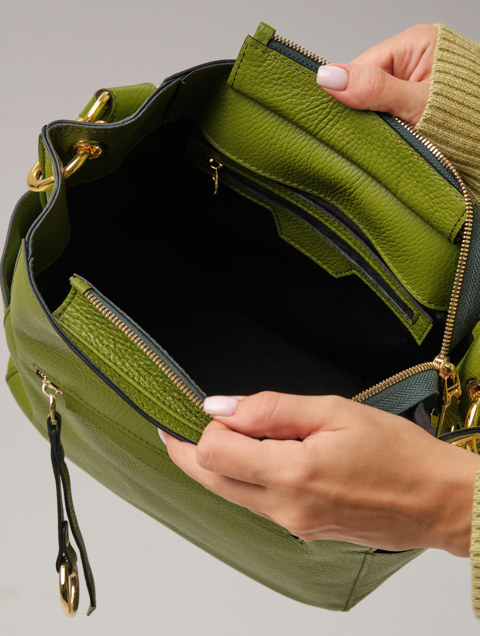 Детали: натуральная кожа, несъемная ручка на карабинах, съемный регулируемый плечевой ремень, 1 внутреннее отделение на хлопковой водонепроницаемой подкладке, 1 внутренний закрытый карман на молнии, 1 внутренний открытый карман, застежка на металлическую молнию, 2 внешних открытых кармана, 1 внешний закрытый карман на металлической молнии и кожаном пуллере с кольцом для крепления на задней стенке.