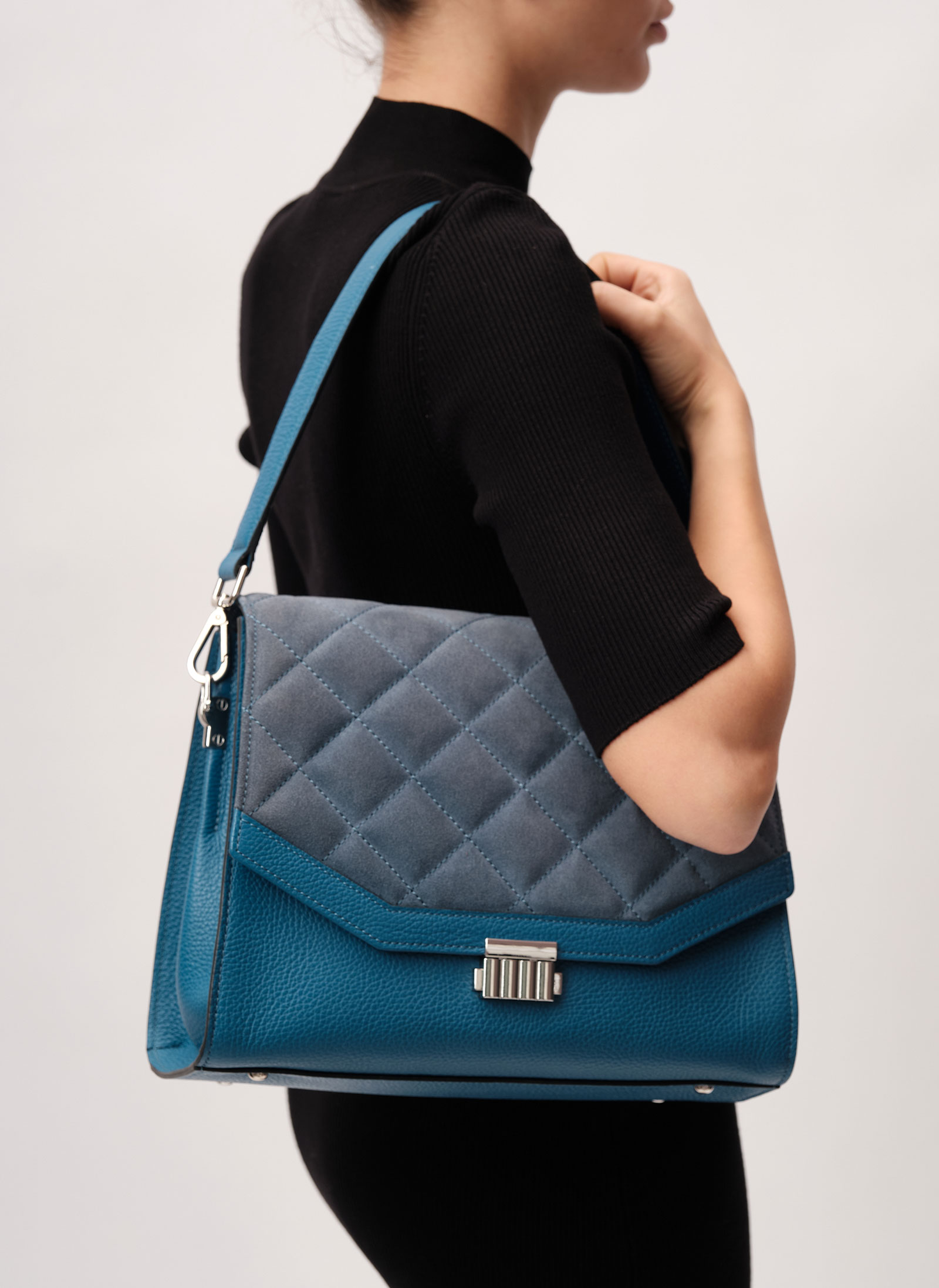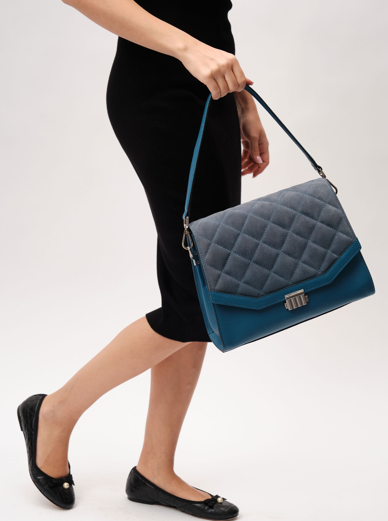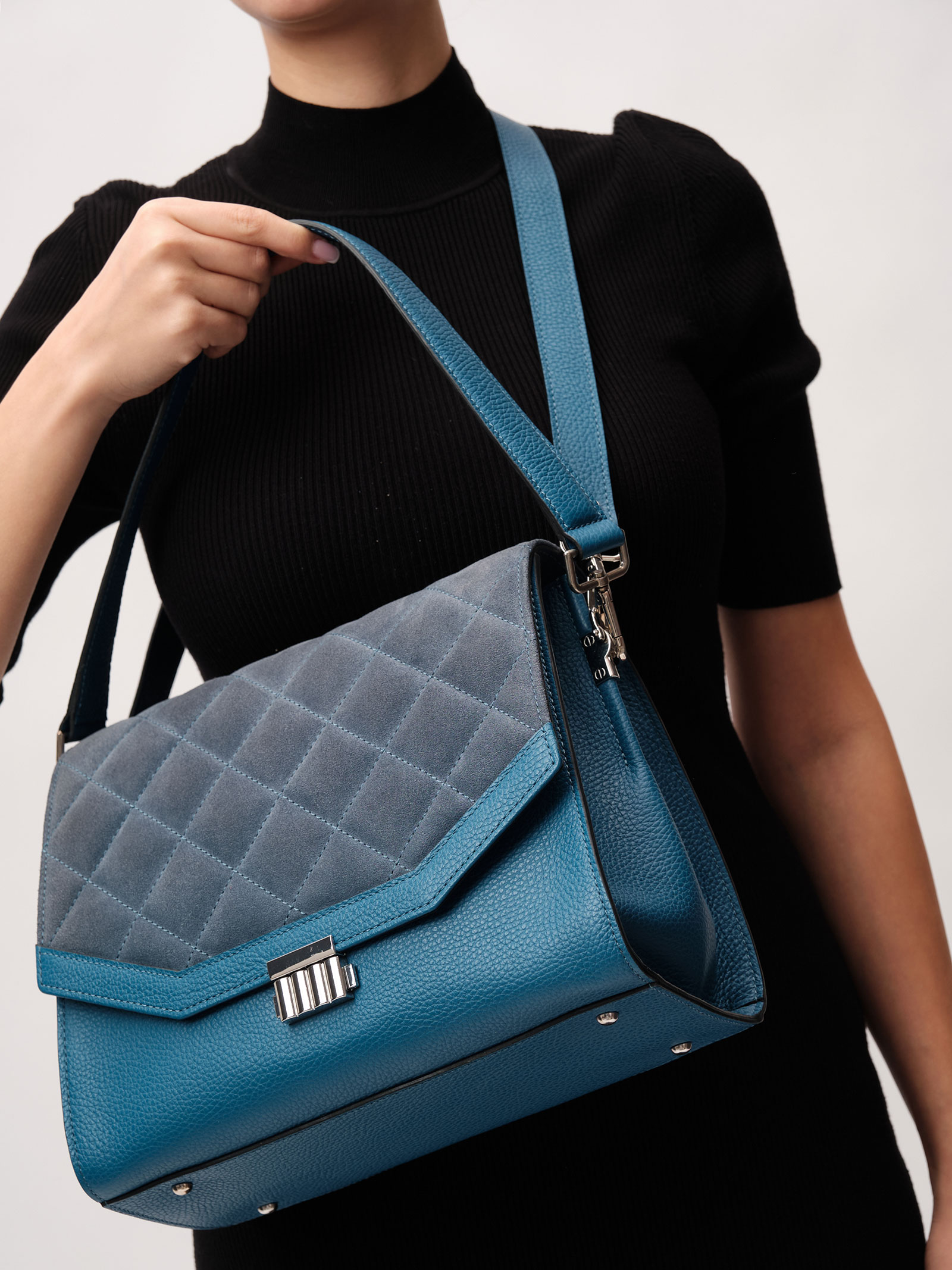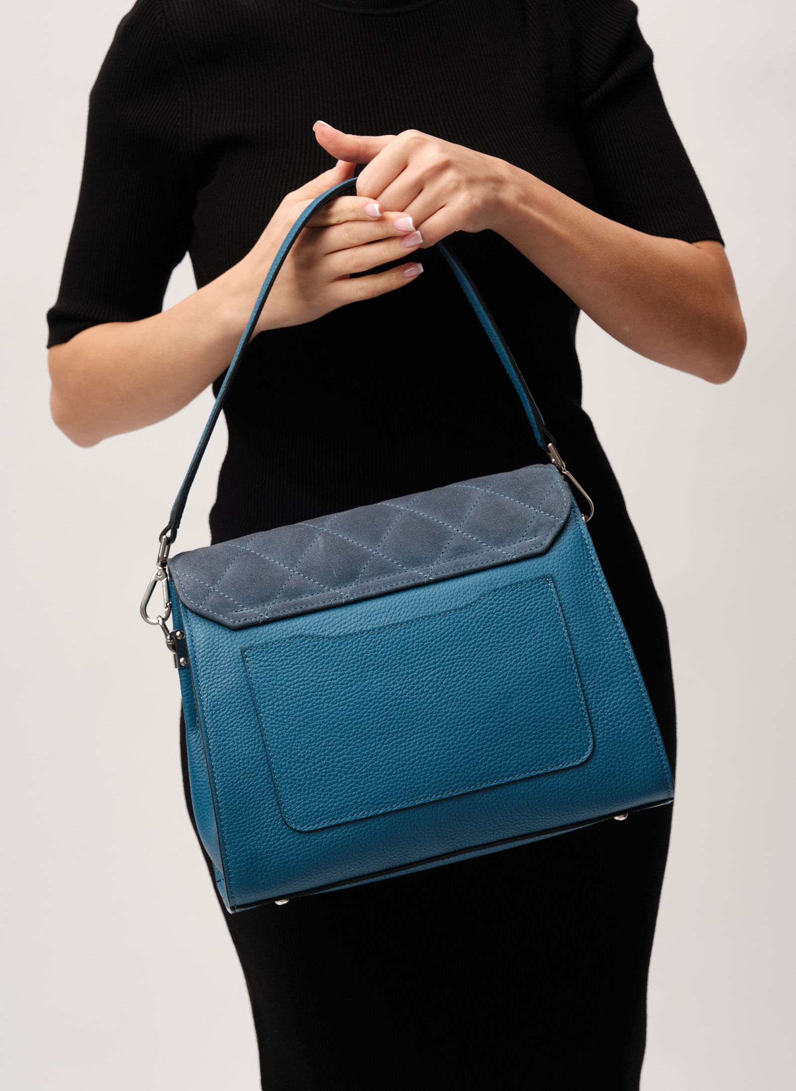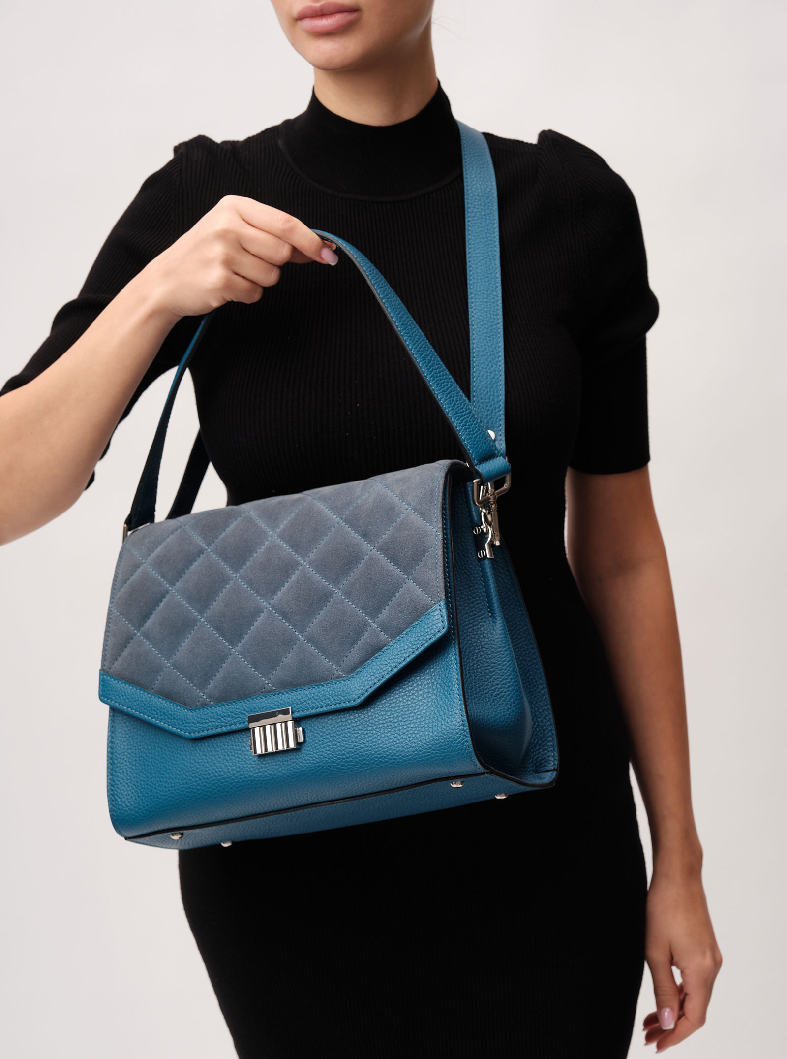 Детали: натуральная кожа, натуральная замша, съемная ручка, съемный плечевой ремень, 2 внутренних отделения, 1 внутренний закрытый карман, 1 внутренний открытый карман, хлопковая водонепроницаемая подкладка, застежка на клапан с внутренней отделкой из натуральной замши на замок-зажим, 1 внешний накладной карман, металлические ножки,.