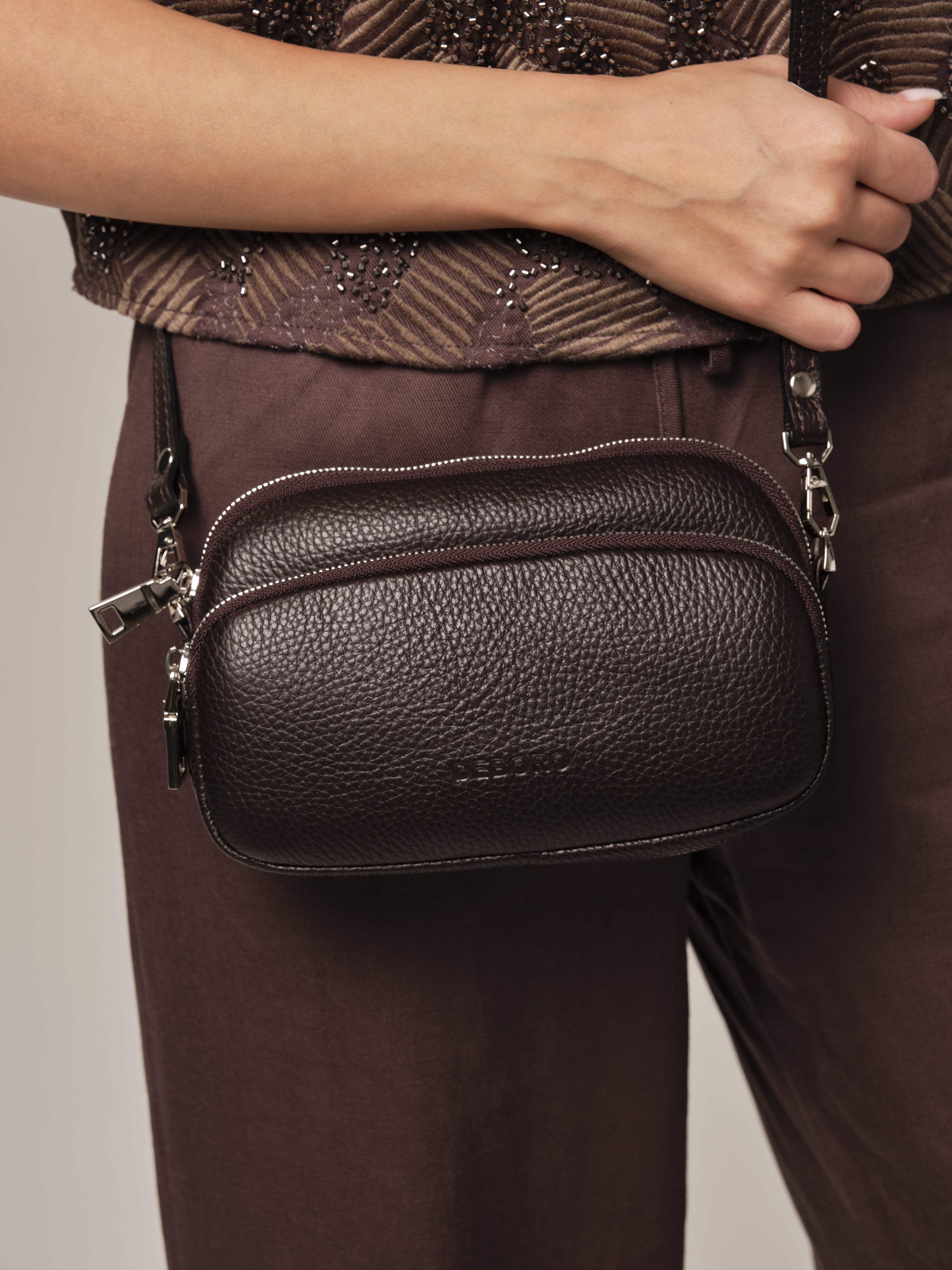 Компактная, лаконичная и очень практичная сумка Deboro арт. 30851 из плотной зернистой кожи глубокого тёмно-коричневого оттенка. Фактура материала придаёт изделию дорогое и современное звучание, а также делает его устойчивым к повседневной носке.