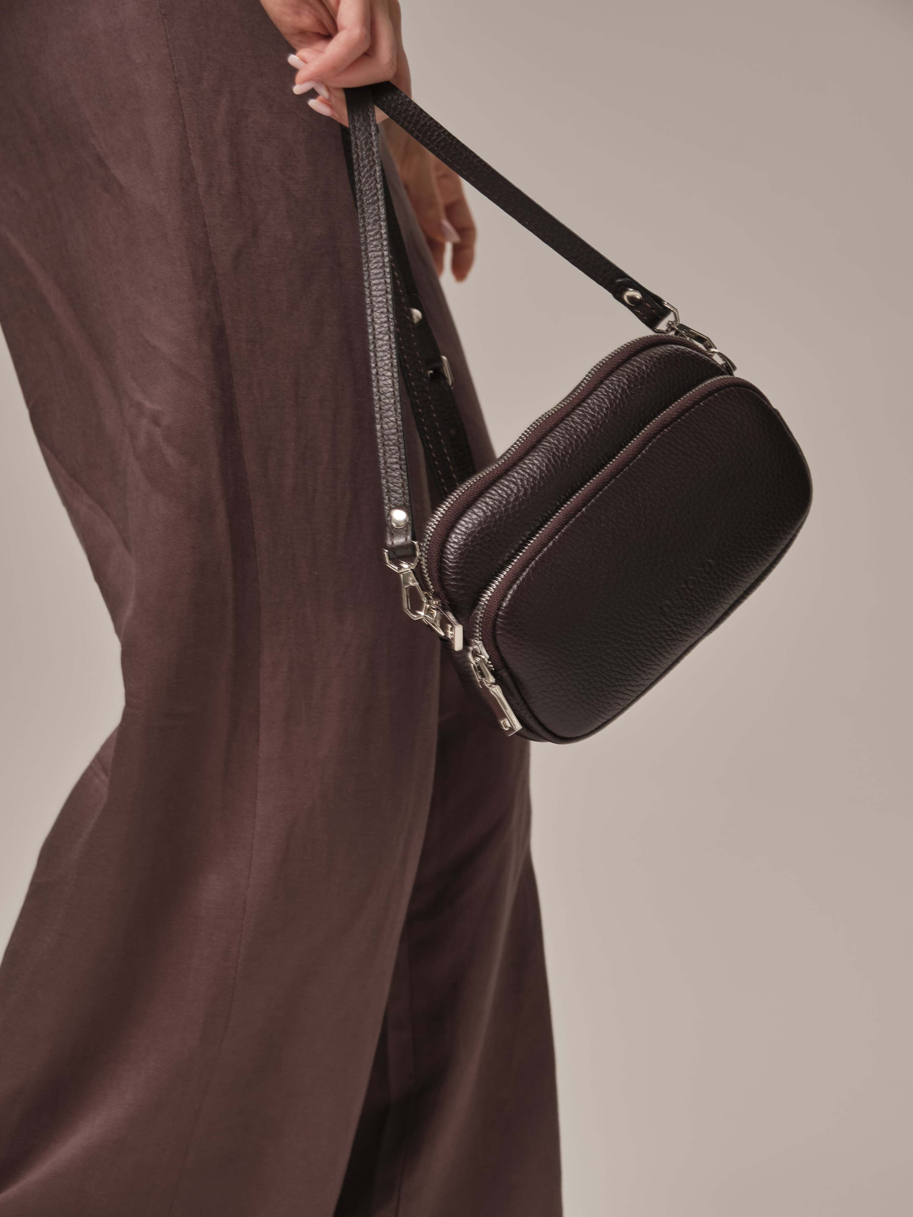 Внутреннее отделение и внешний карман закрываются на молнию и имеют удобный формат для ежедневных нужд - достаточно места для телефона, ключей, документов и других мелочей. Регулируемый ремень позволяет носить сумку на плече или как кросс-боди, обеспечивая комфорт в движении. Без ремня сумку можно носить как клатч.