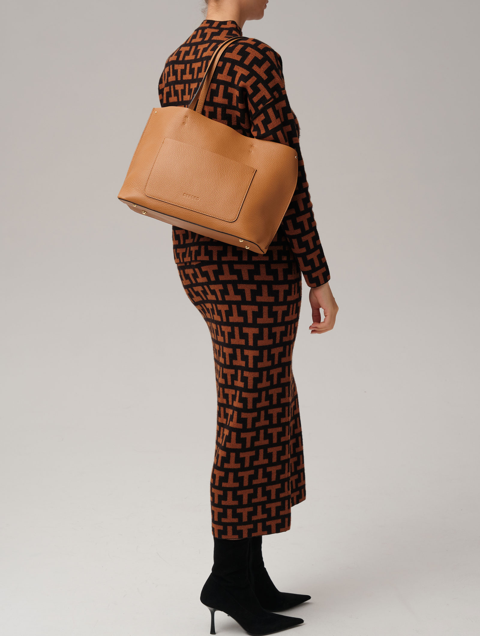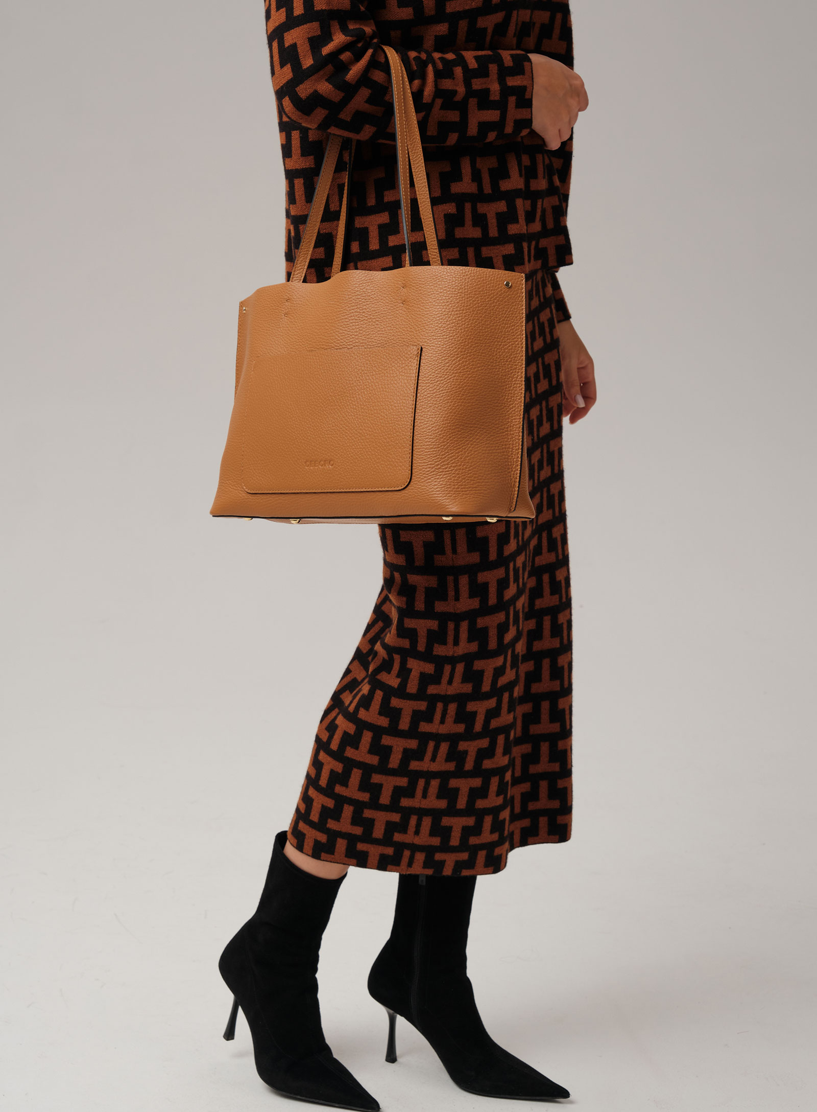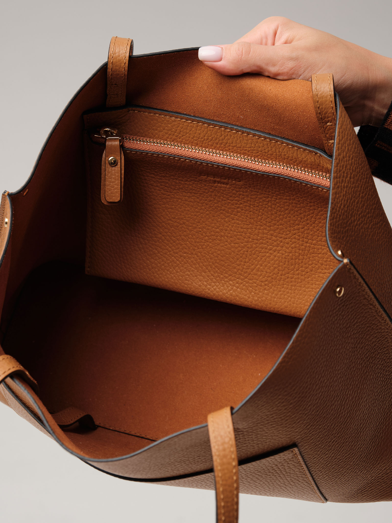 Детали: натуральная кожа, 1 внутреннее отделение с подкладкой из алькантары, 1 внутренний закрытый карман на молнии из натуральной кожи, 1 внешний накладной открытый карман, металлические ножки.