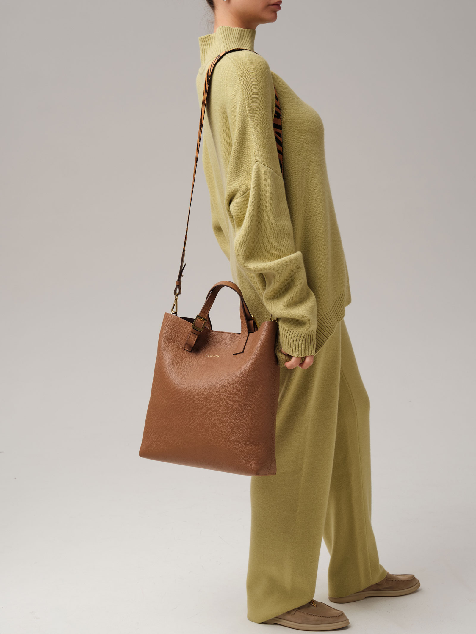 Детали: натуральная кожа, несъемные ручки, съемный длинный текстильный ремень с кожаной отделкой на карабинах, 1 внутреннее отделение с подкладкой из алькантары, 1 внутренний закрытый карман на молнии, 1 внутренний открытый карман, застежка на магниты, обтянутые натуральной кожей.