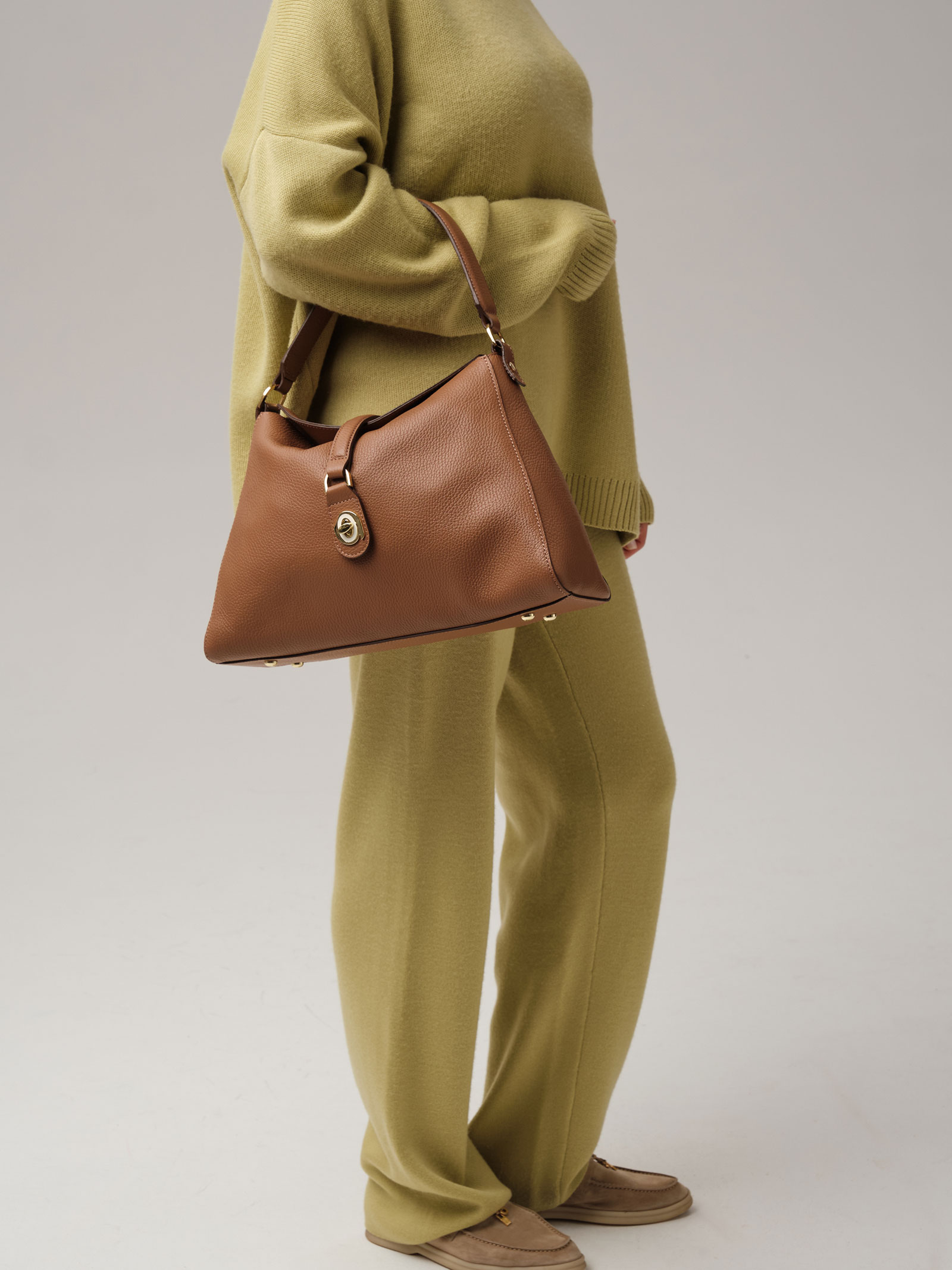 Детали: натуральная кожа, съемный регулируемый плечевой ремень, несъемная ручка на плечо, 1 внутреннее отделение на хлопковой водонепроницаемой подкладке, 1 внутренний закрытый карман на молнии, клапан закрывается на кожаный ремешок с замком-вертушкой, металлические ножки.