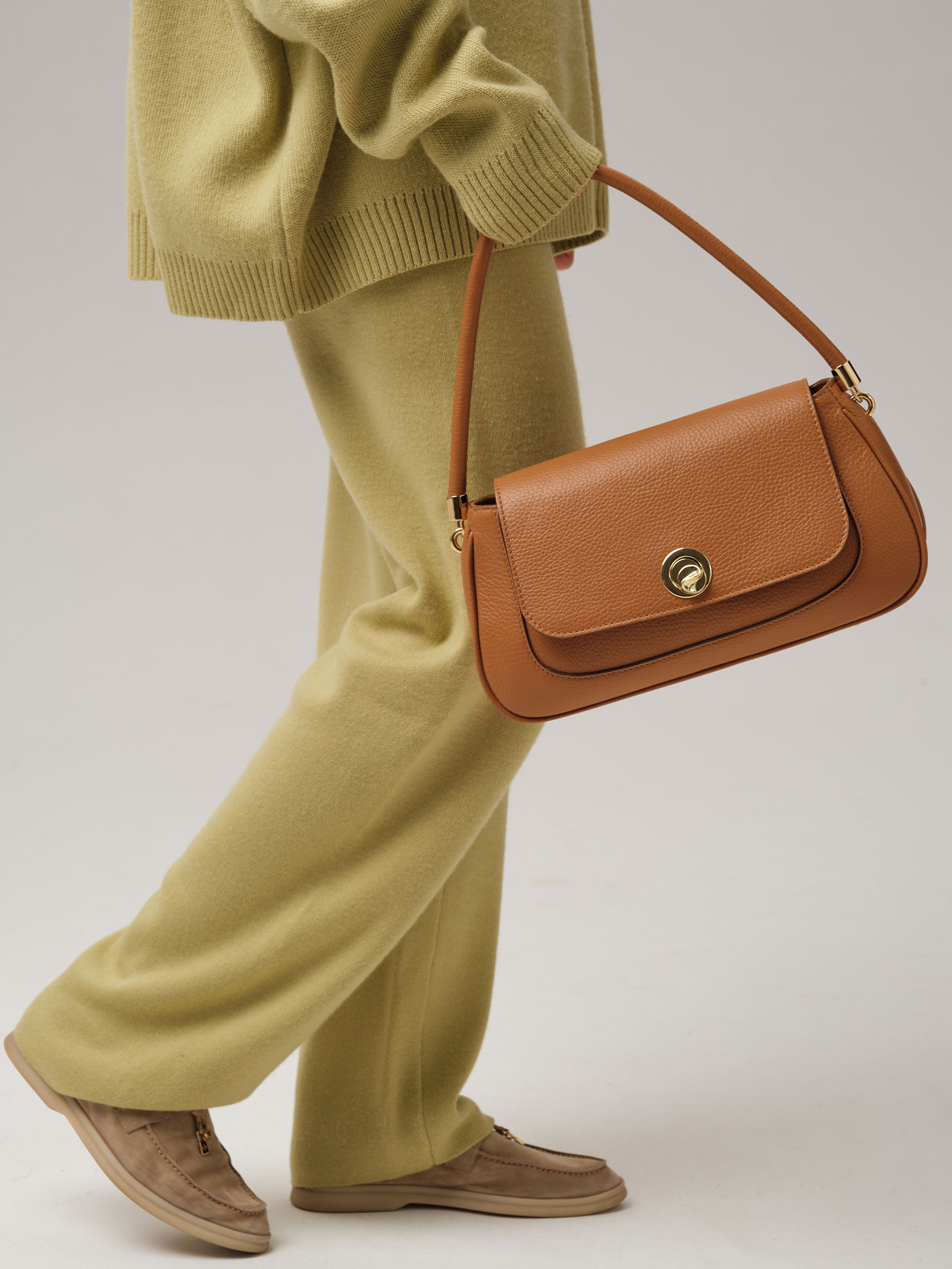 Детали: натуральная кожа, несъемная нерегулируемая ручка, 1 внутреннее отделение на хлопковой водонепроницаемой подкладке, 1 внутренний закрытый карман на молнии, клапан с внутренней отделкой из натуральной замши и замком-вертушкой, металлические ножки.