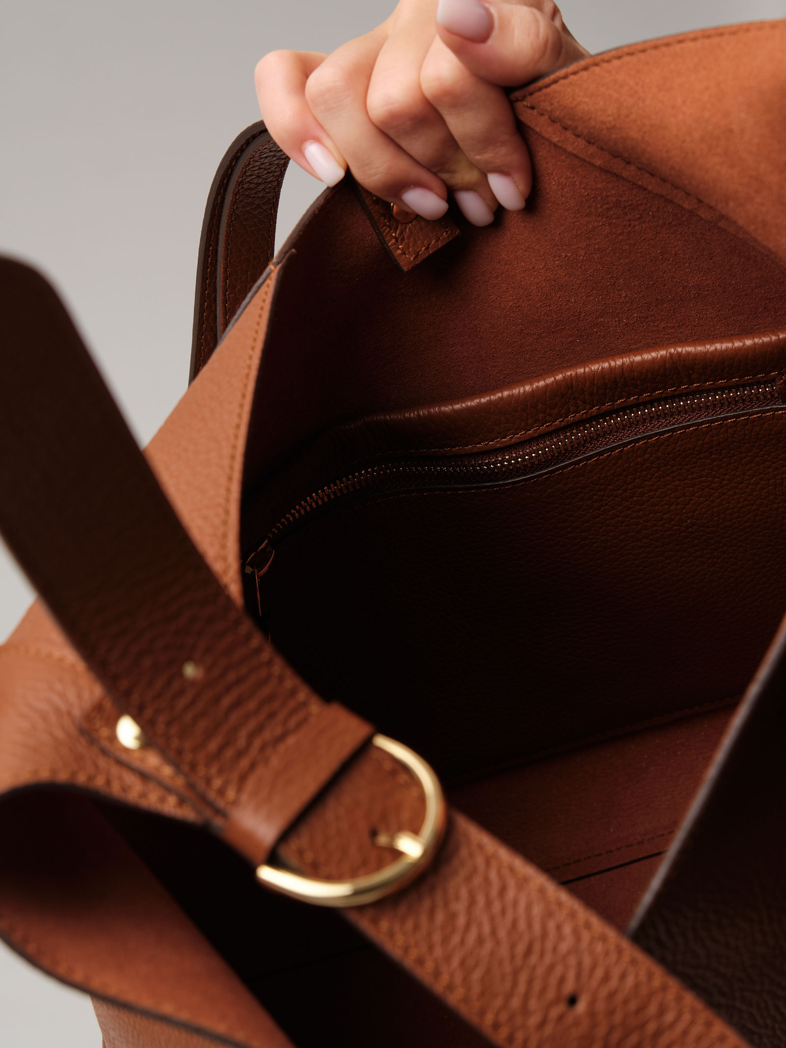 Детали: натуральная кожа, 1 внутреннее отделение с подкладкой из алькантары, 1 внутренний закрытый карман на молнии из натуральной кожи, 1 внутренний открытый карман, несъемный регулируемый плечевой ремень.