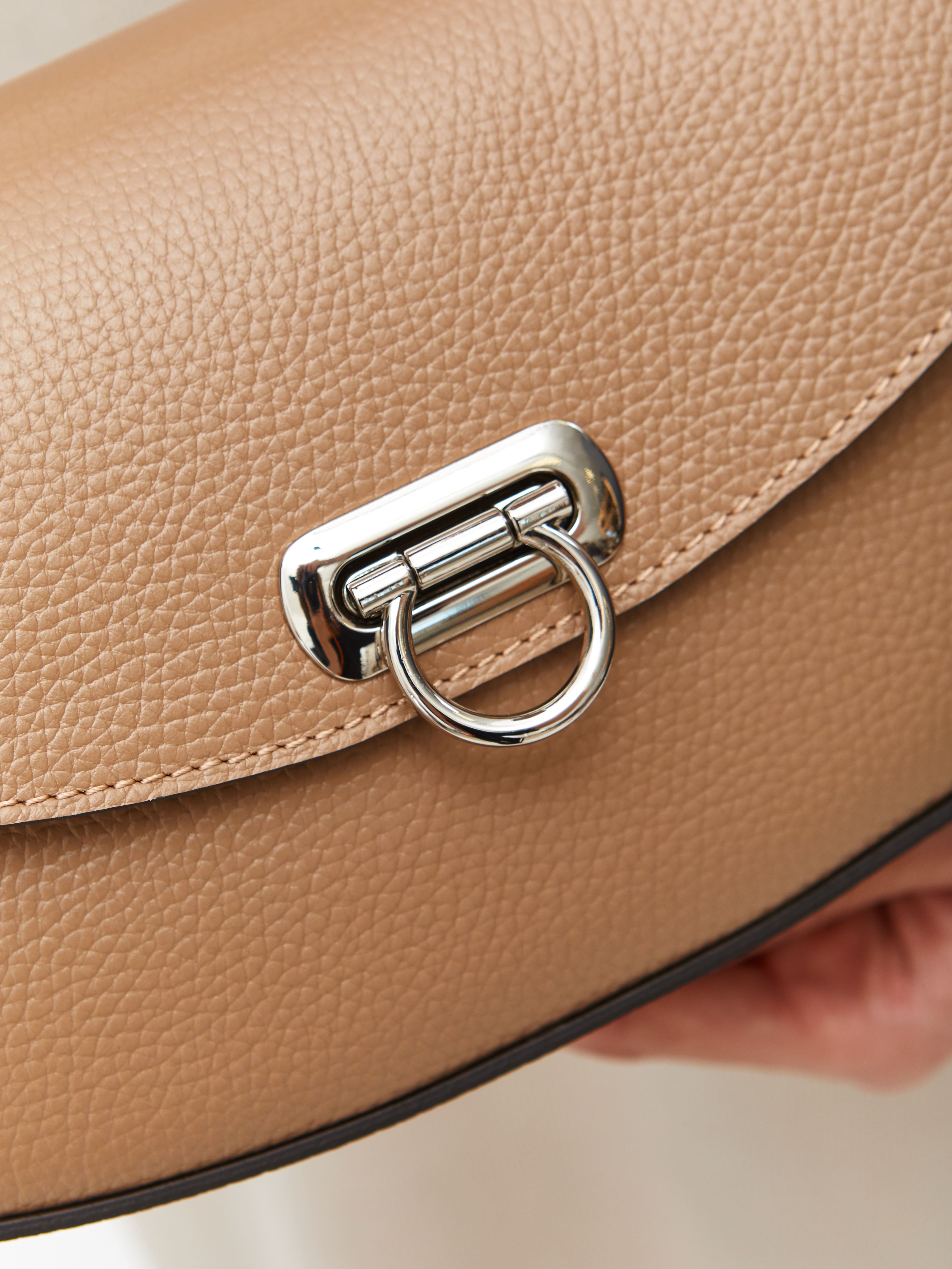 Модель выполнена из качественной, плотной, мягкой на ощупь зернистой кожи, которая держит форму и выглядит дорого. Фурнитура в теплом оттенке из латунного золота, аккуратная, прочная и идеально сочетается с цветом.