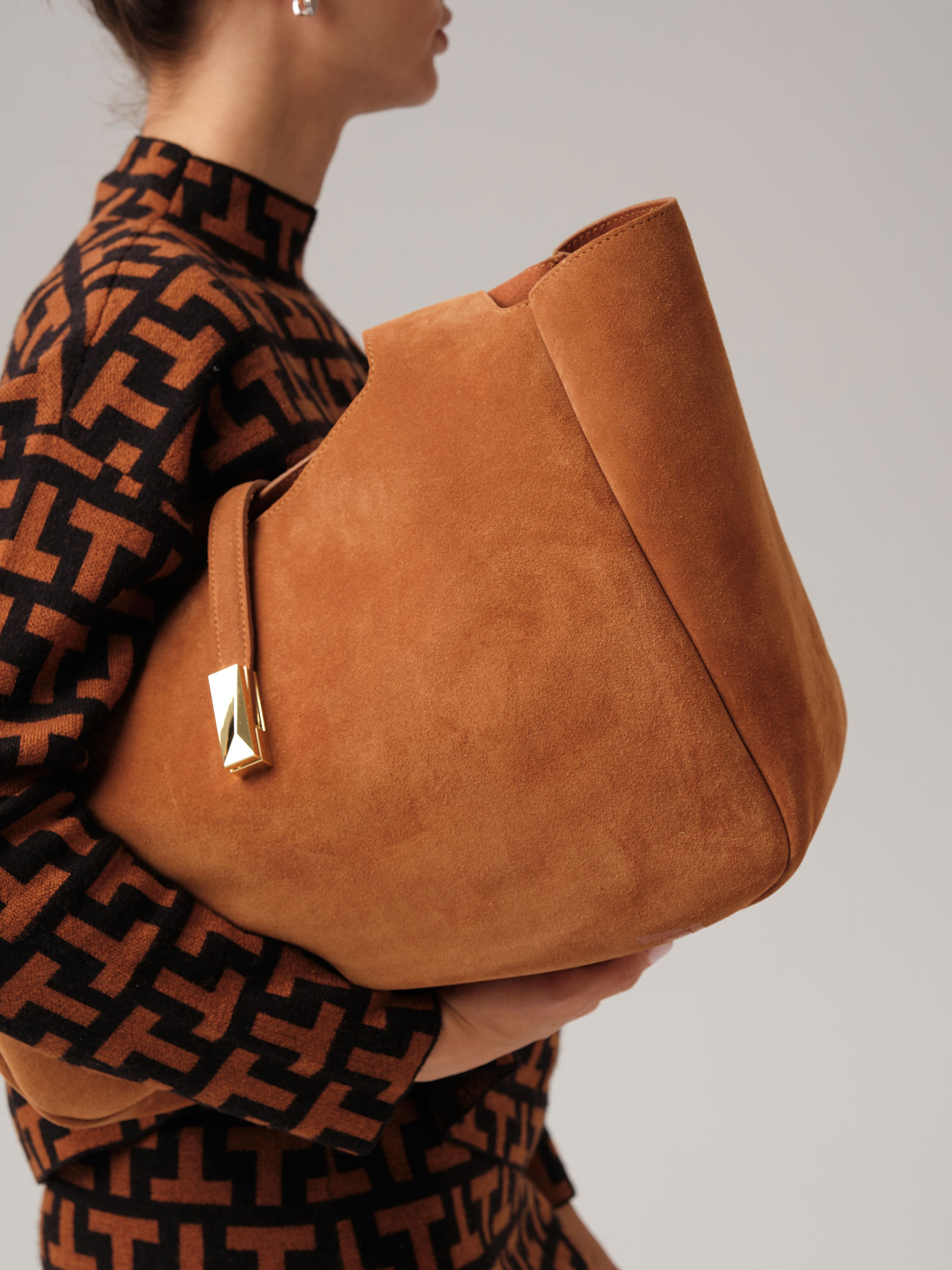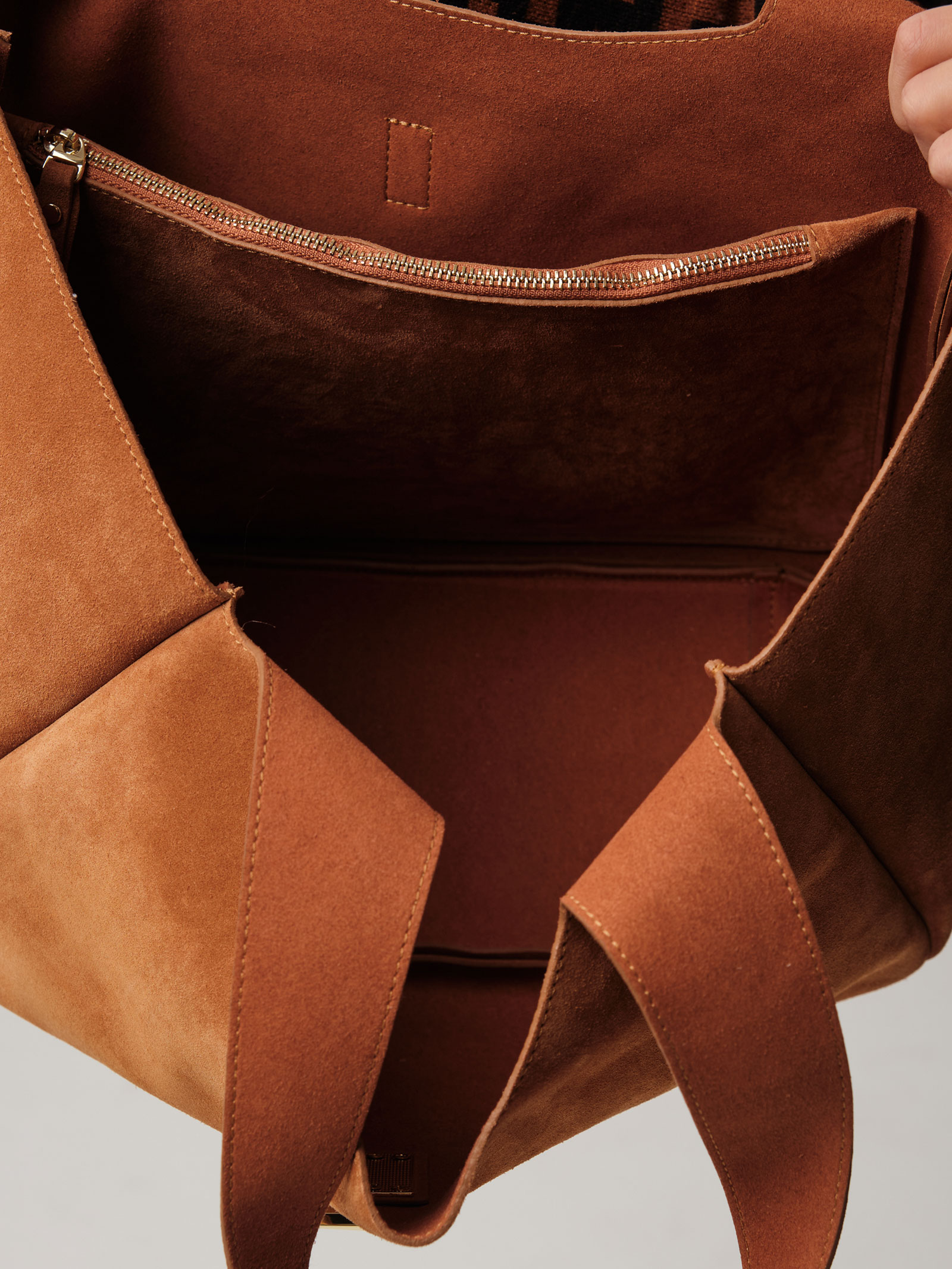 Детали: натуральная замша, 1 внутреннее отделение с подкладкой из алькантары, застежка на ремешок с замком-вертушкой, 1 внутренний закрытый карман на молнии, 1 внутренний открытый карман.