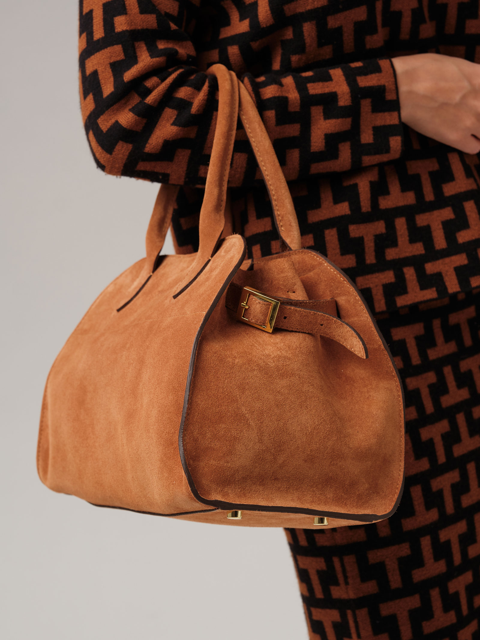Детали: натуральная замша, 2 ручки, боковая регулировка ширины сумки на ремешках, 1 внутреннее отделение с подкладкой из алькантары, 1 внутренний закрытый карман на молнии, застежка на магнит, съемный регулируемый плечевой ремень, металлические ножки.