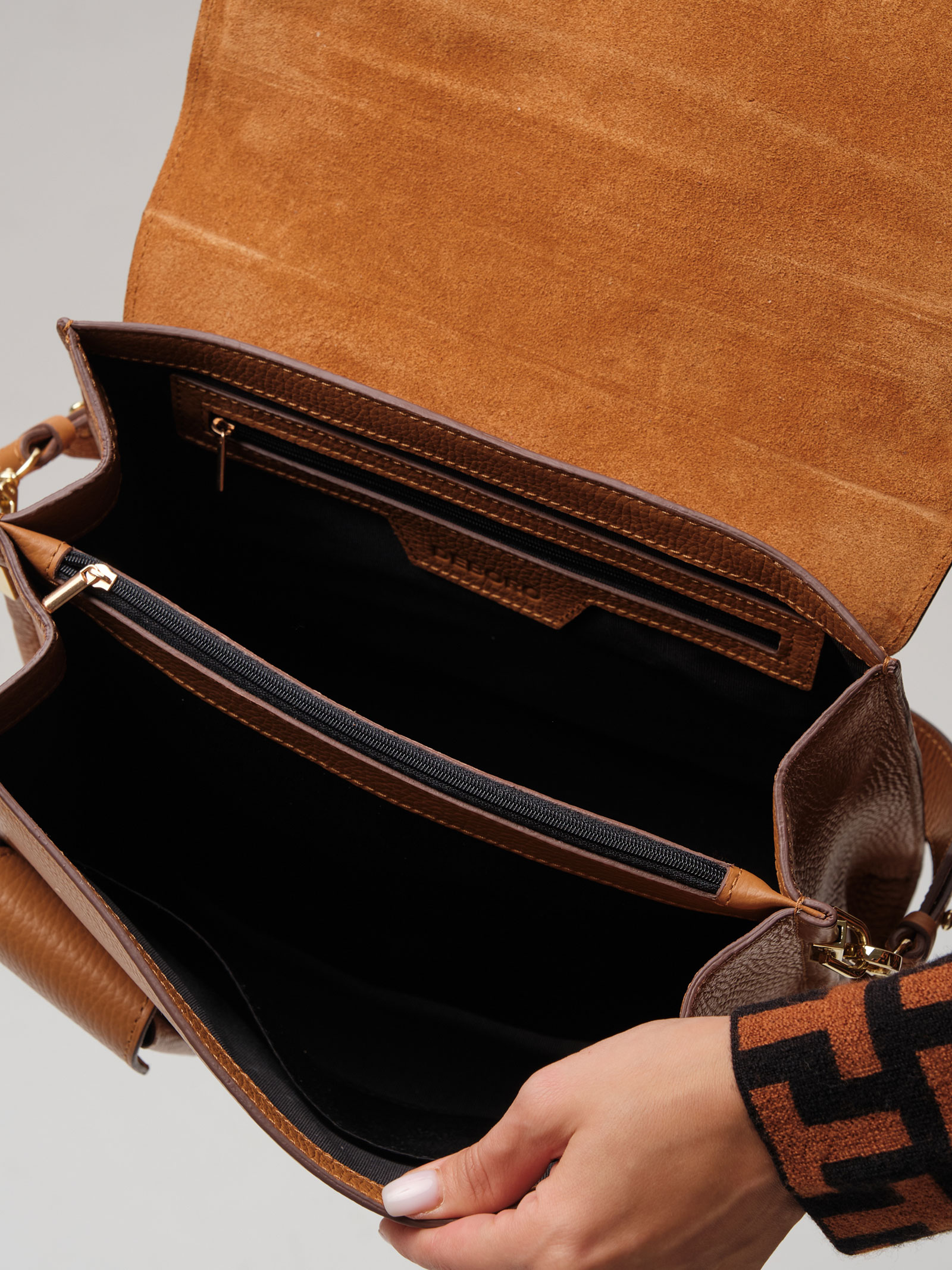 Д етали: натуральная кожа, клапан на замке-вертушке с внутренней отделкой из натуральной замши, 2 внутренних отделения на хлопковой водонепроницаемой подкладке, средник на молнии, 1 внутренний закрытый карман на молнии, 1 внутренний открытый карман, 1 внешний закрытый карман на кнопке, съемный регулируемый плечевой ремень, съемная короткая ручка.