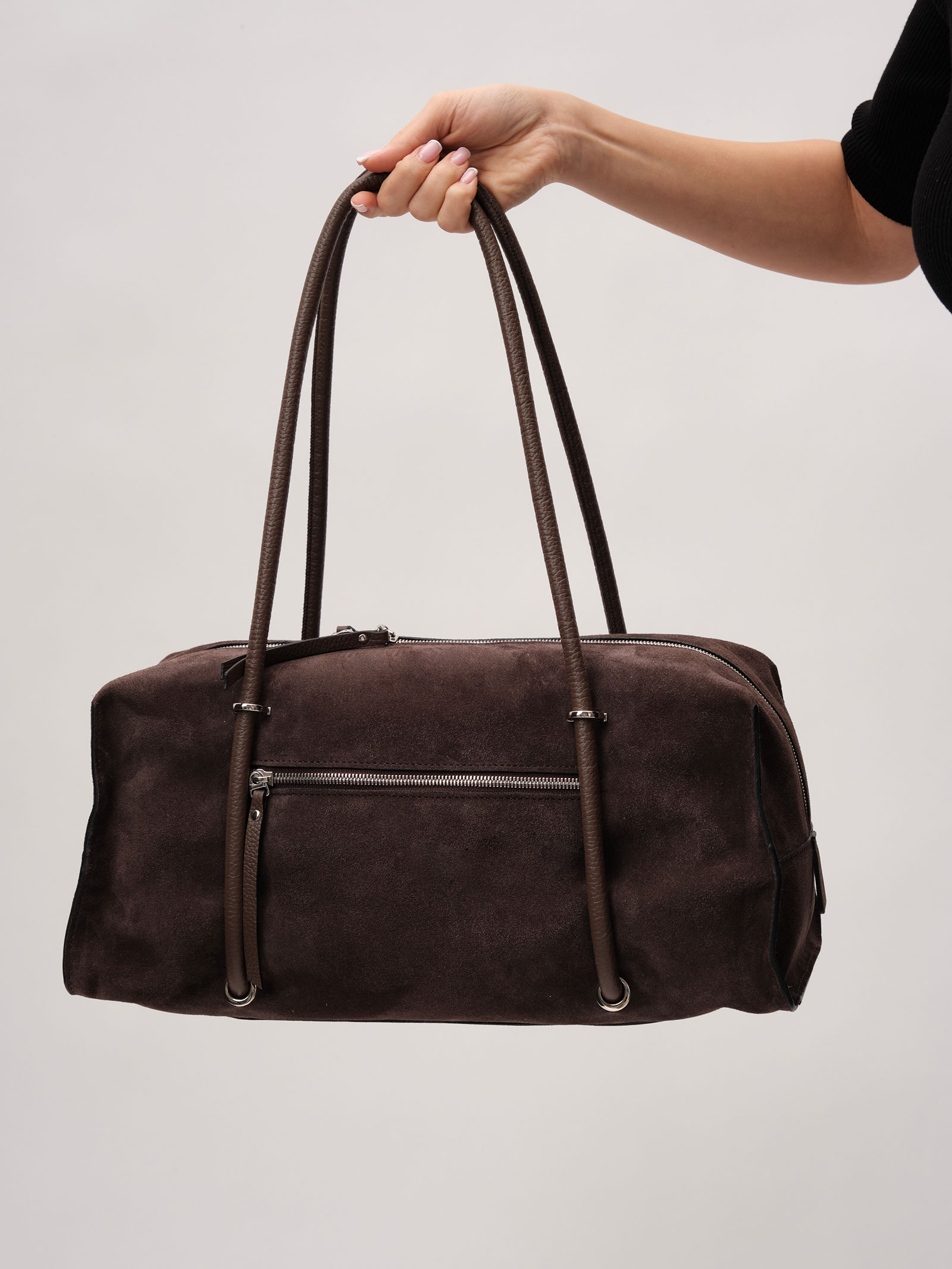Детали: натуральная замша, натуральная кожа, кожаные ручки, 1 отделение на металлической молнии с 2 бегунками и кожаным пуллером, хлопковая водонепроницаемая подкладка, 1 внутренний закрытый карман на молнии.