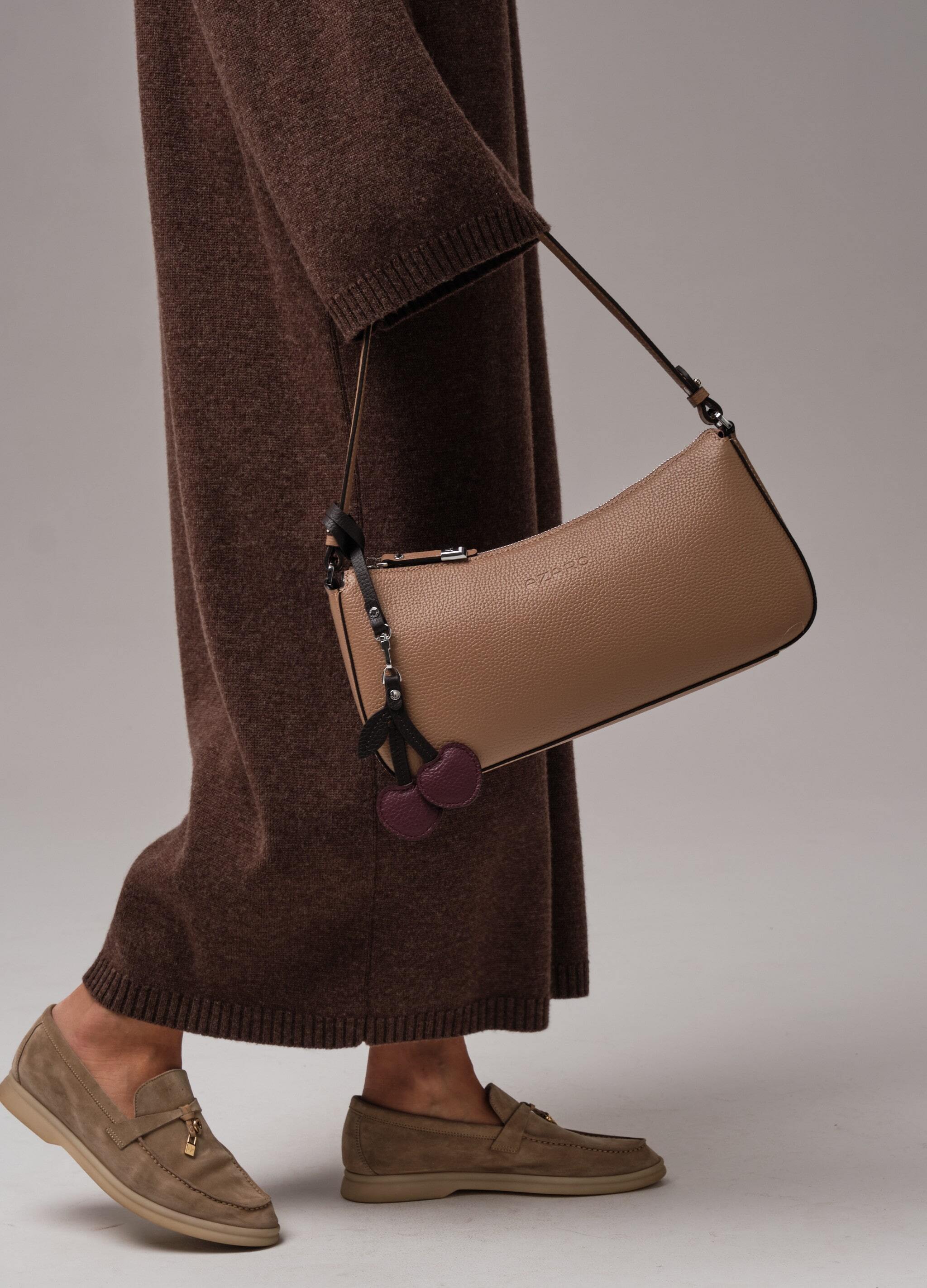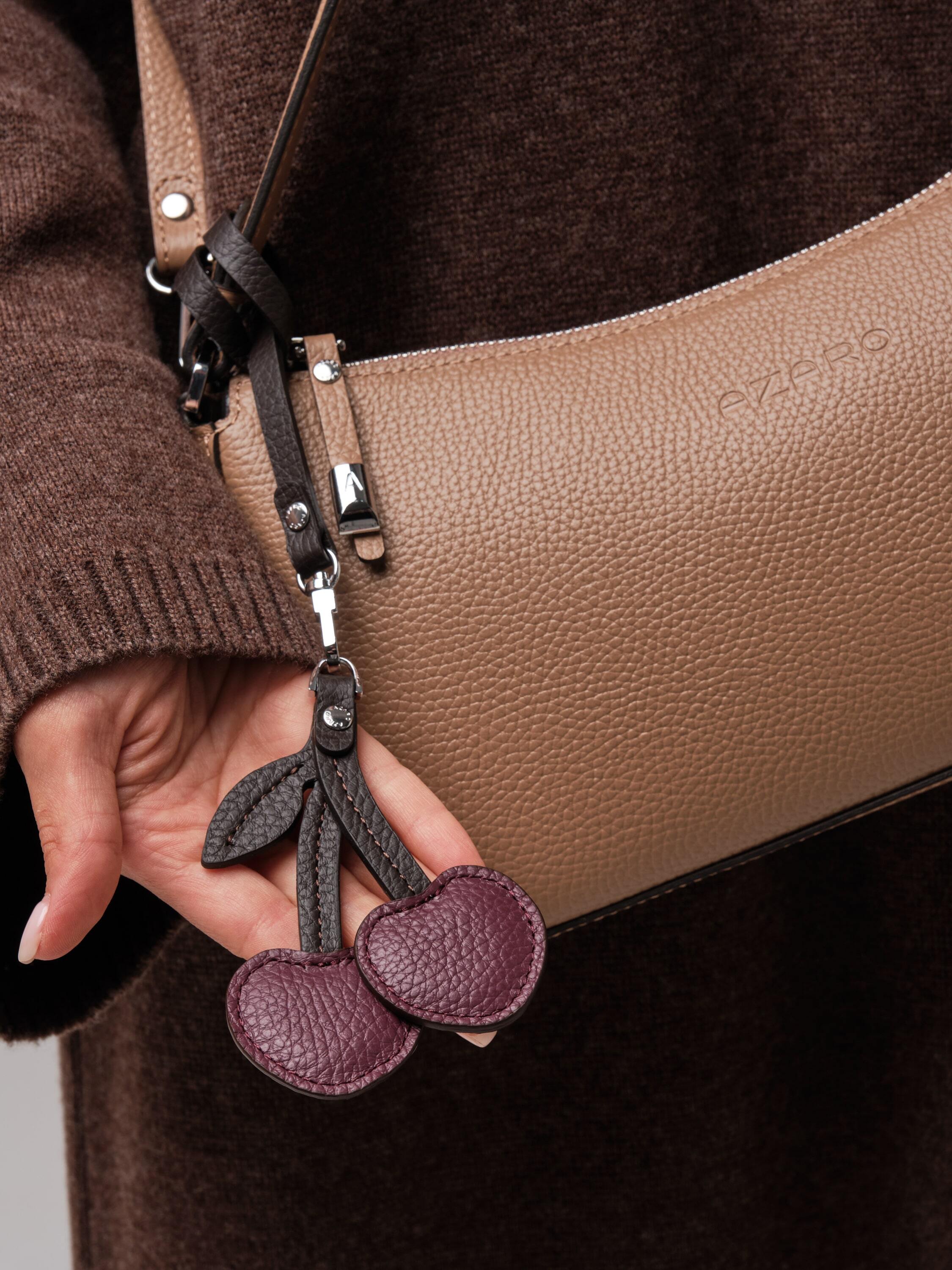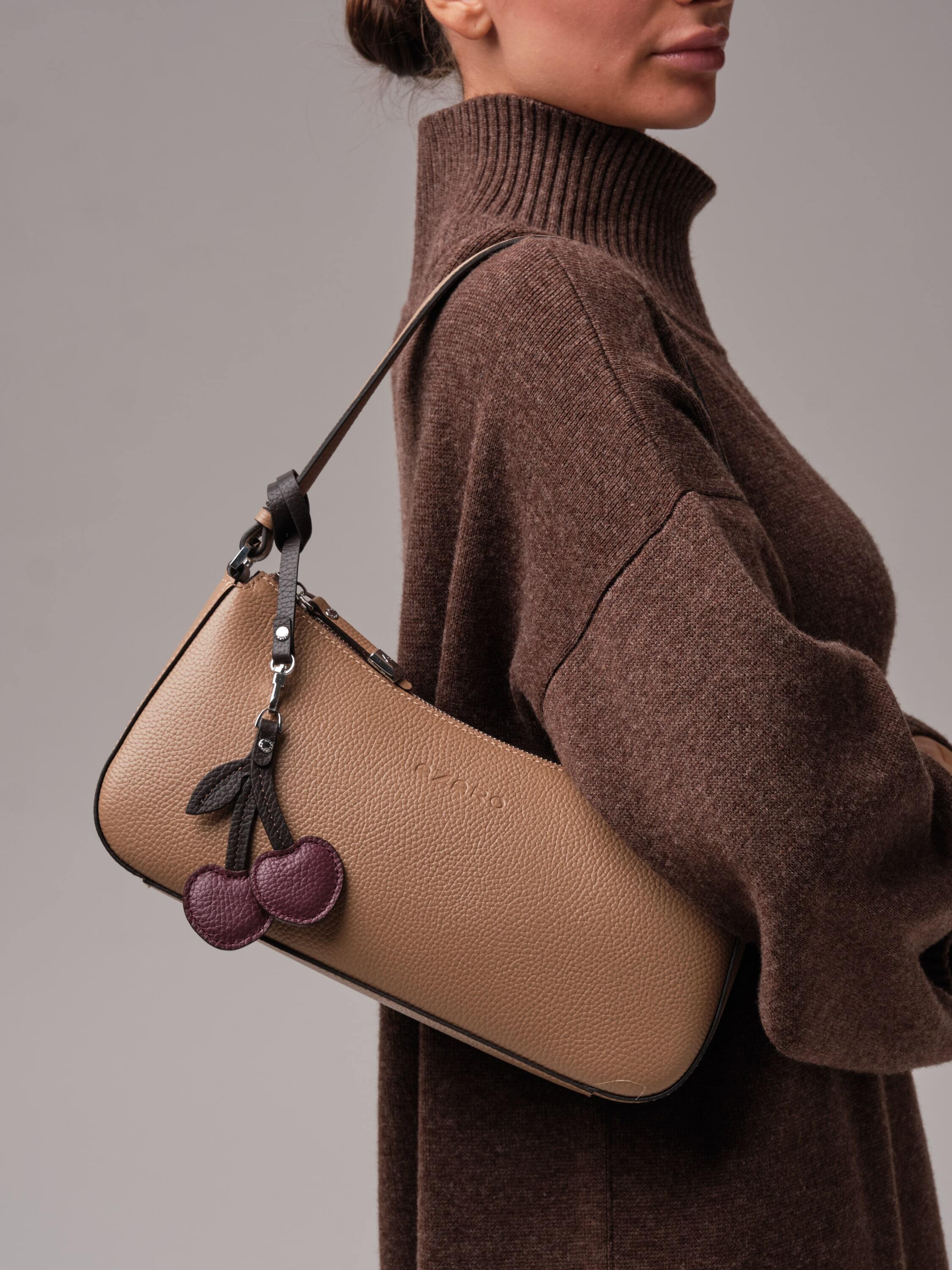 Особая деталь - кожаный подвес в виде вишенок. Он добавляет аксессуару лёгкий флирт, тонкую ноту игривости, превращая строгую форму в нечто более живое, характерное, запоминающееся.