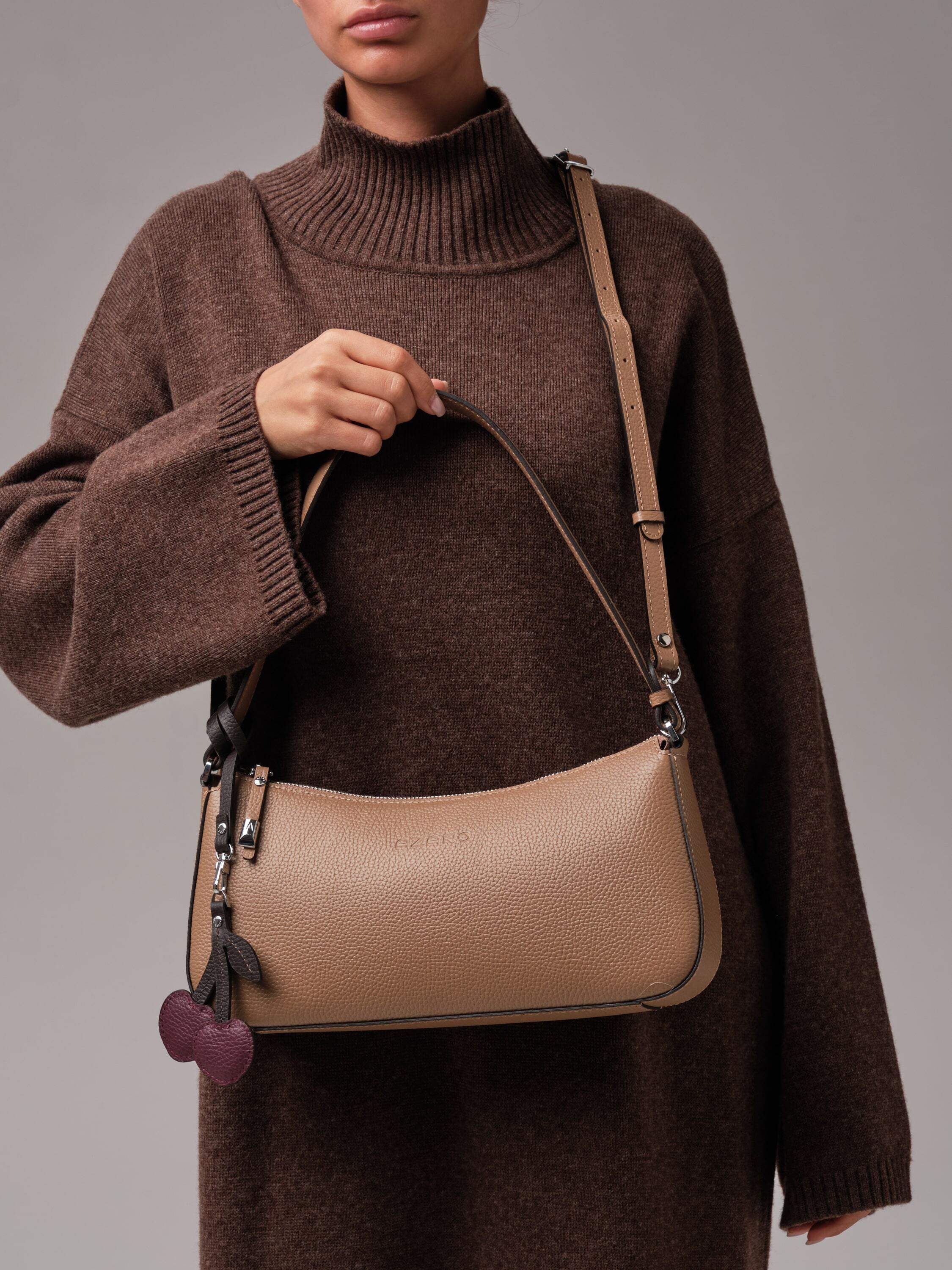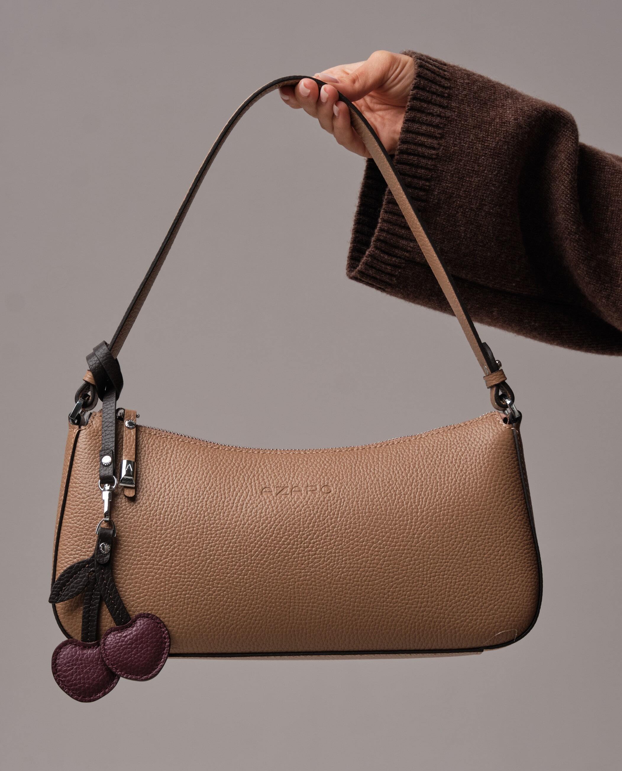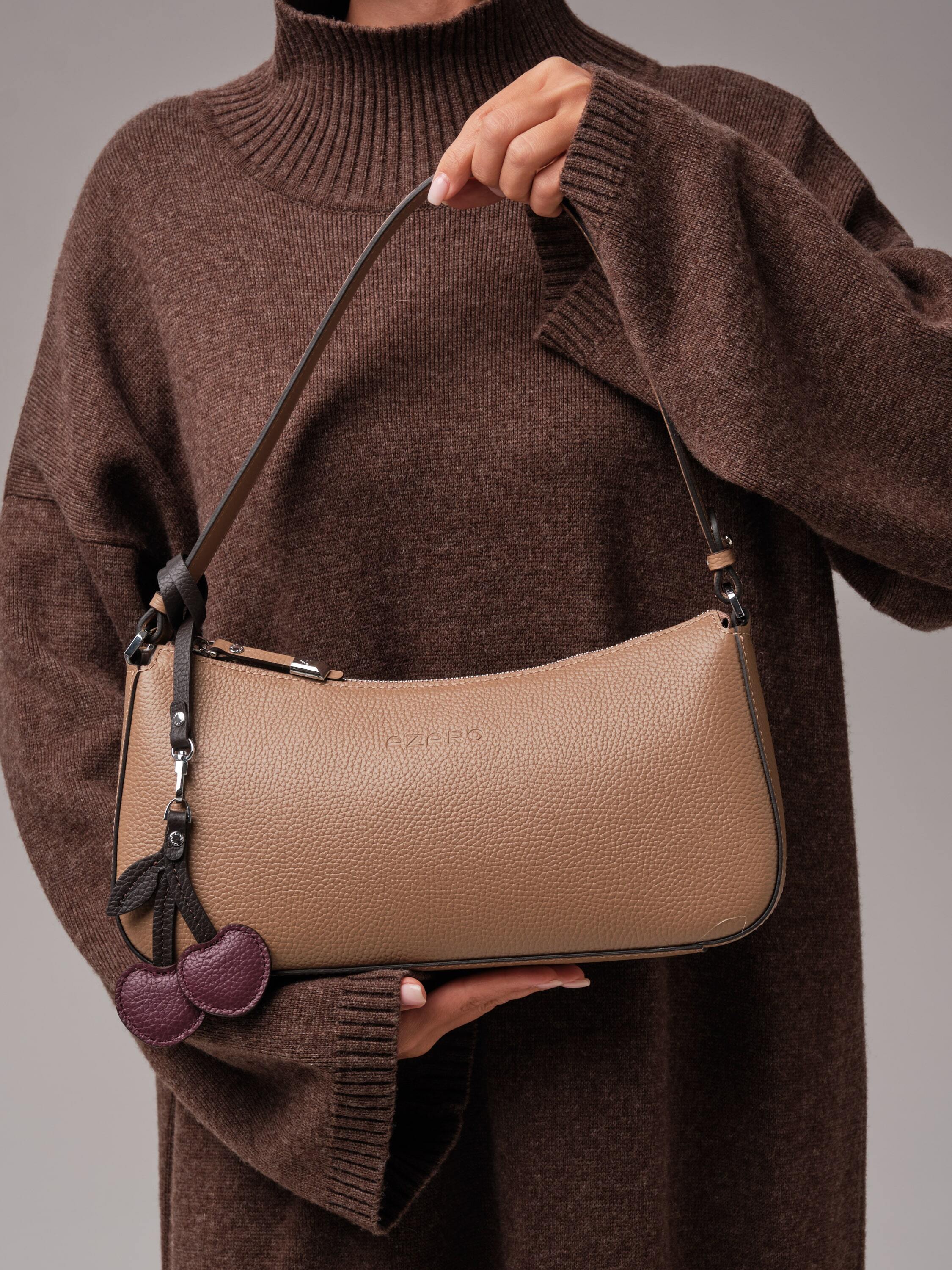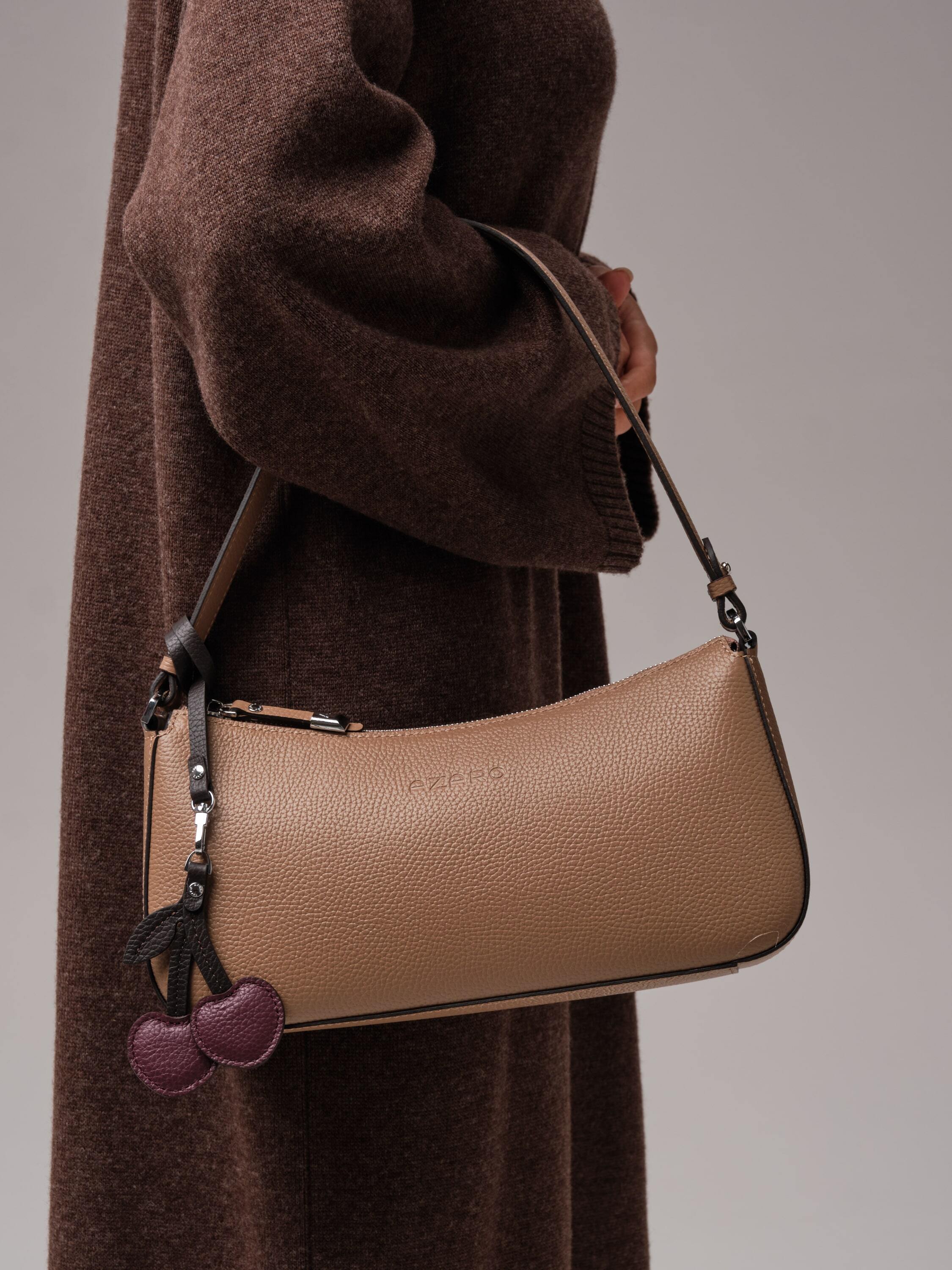 Особая деталь - кожаный подвес в виде вишенок. Он добавляет аксессуару лёгкий флирт, тонкую ноту игривости, превращая строгую форму в нечто более живое, характерное, запоминающееся.