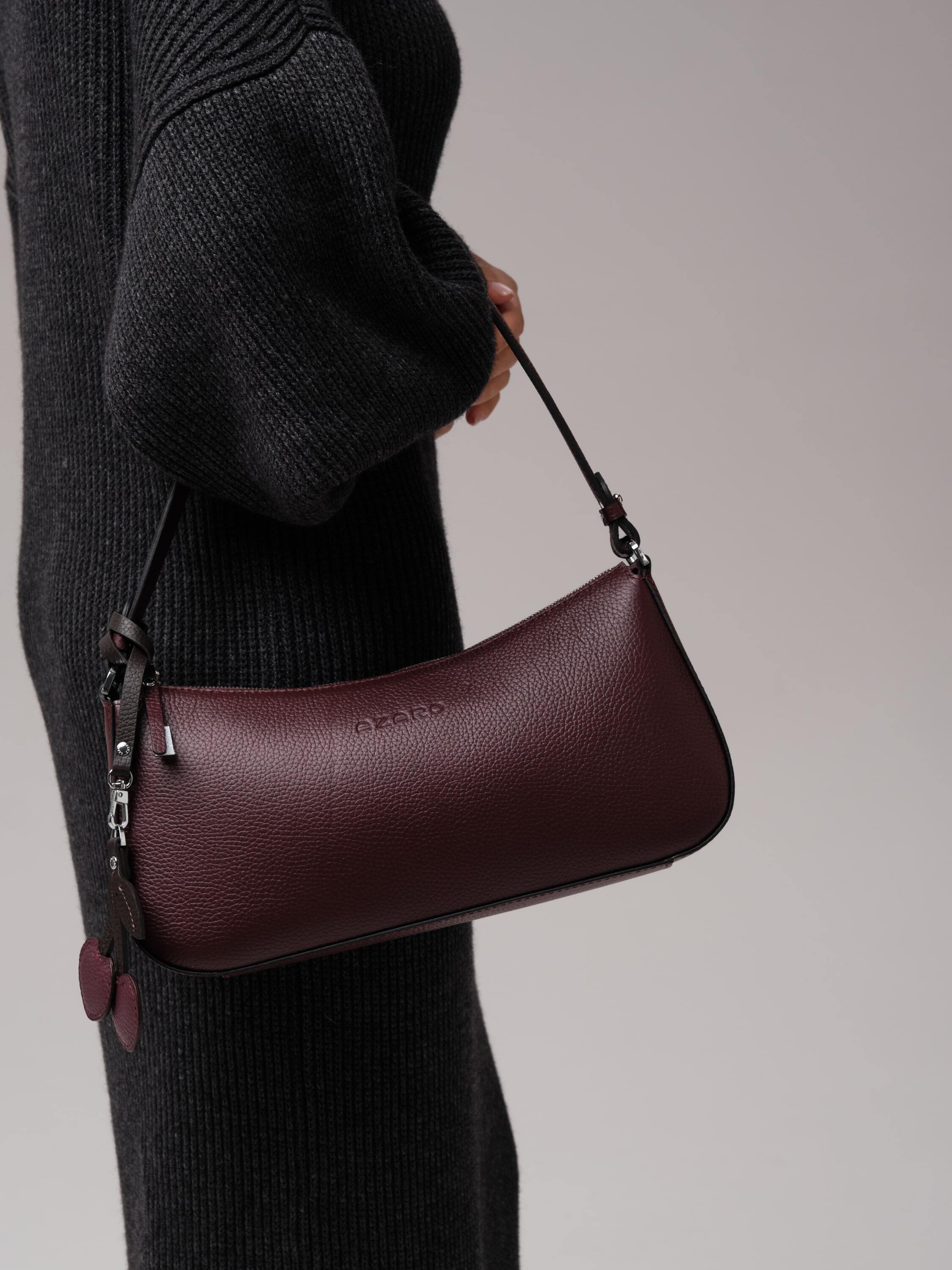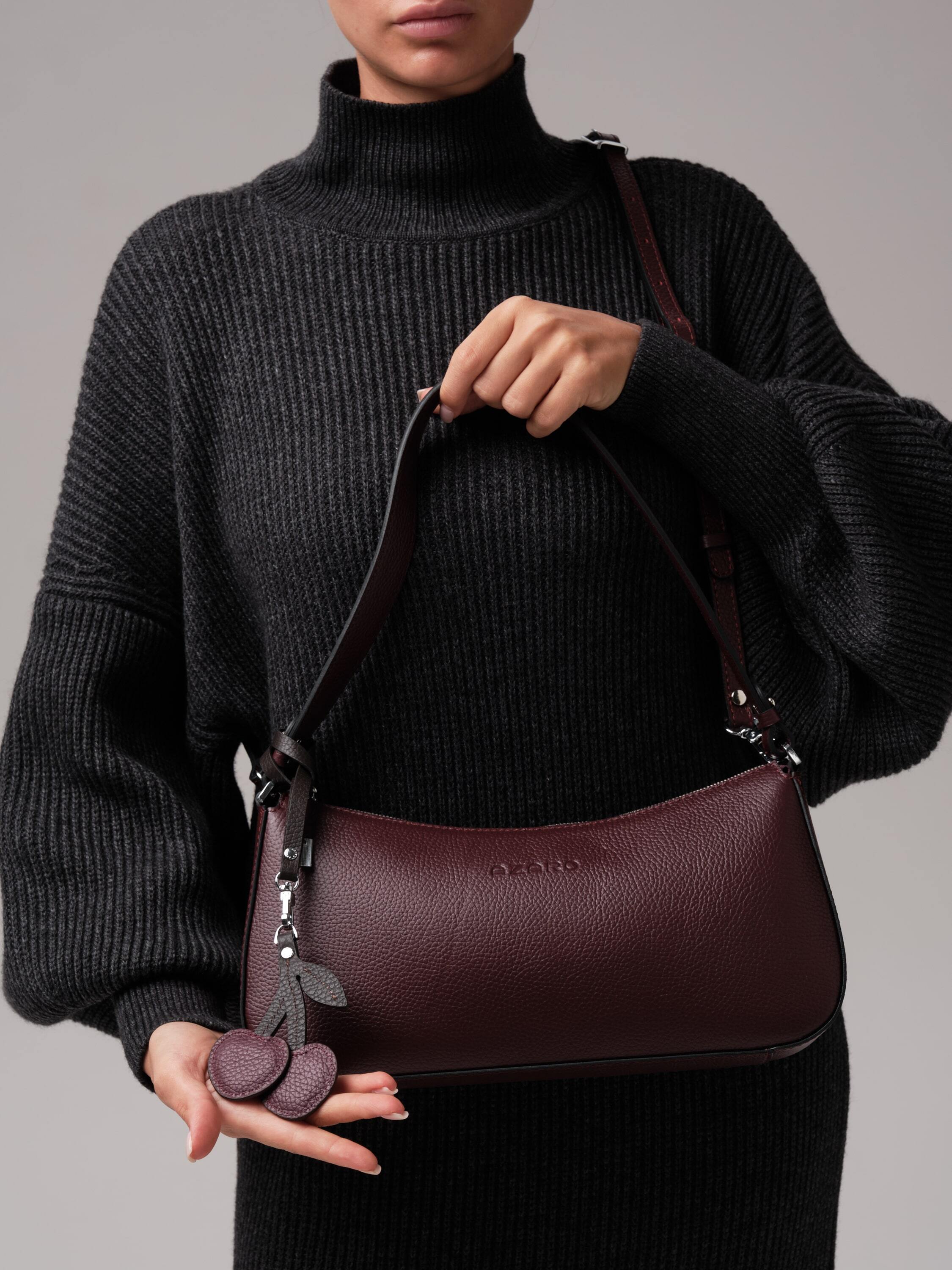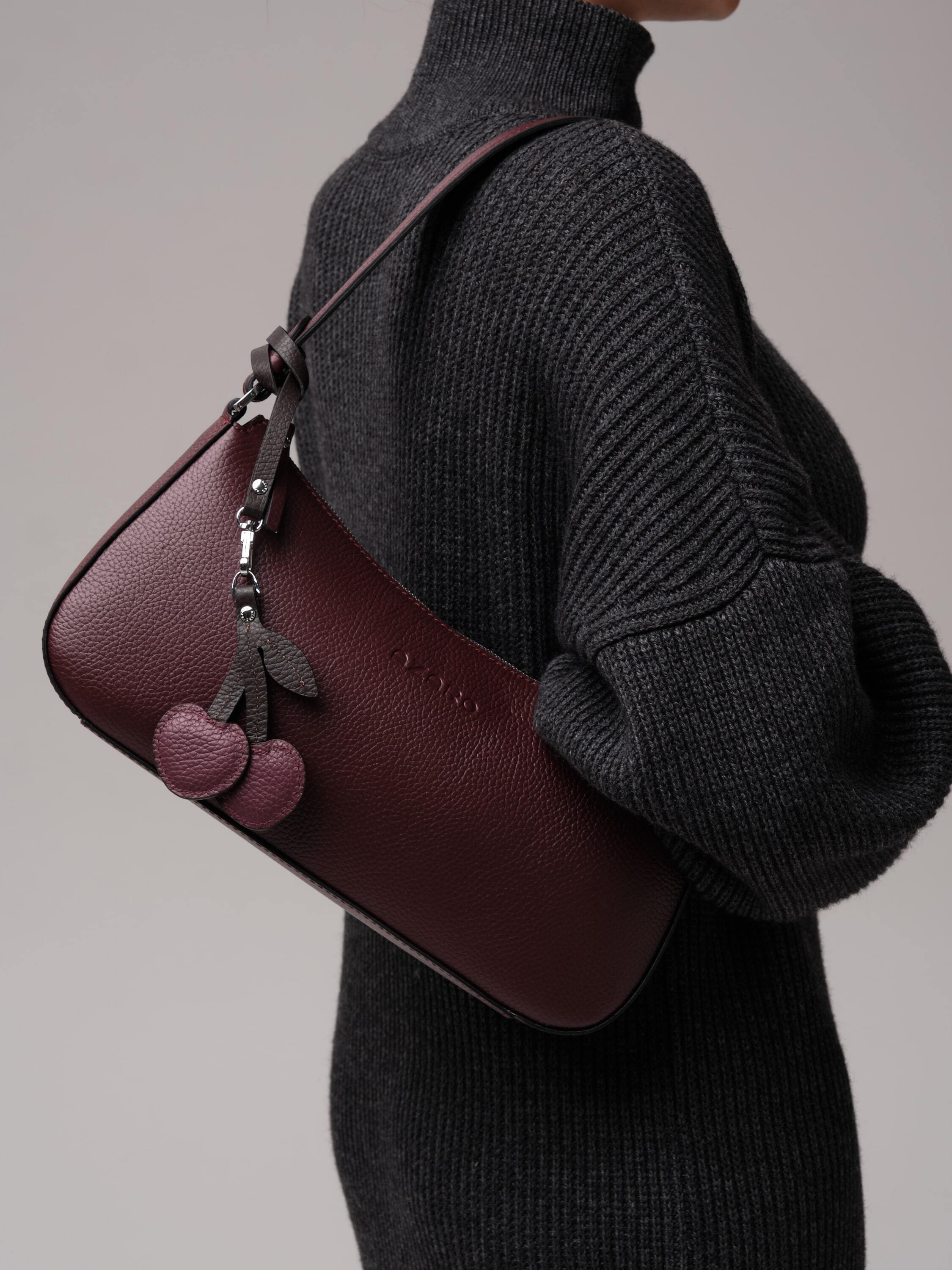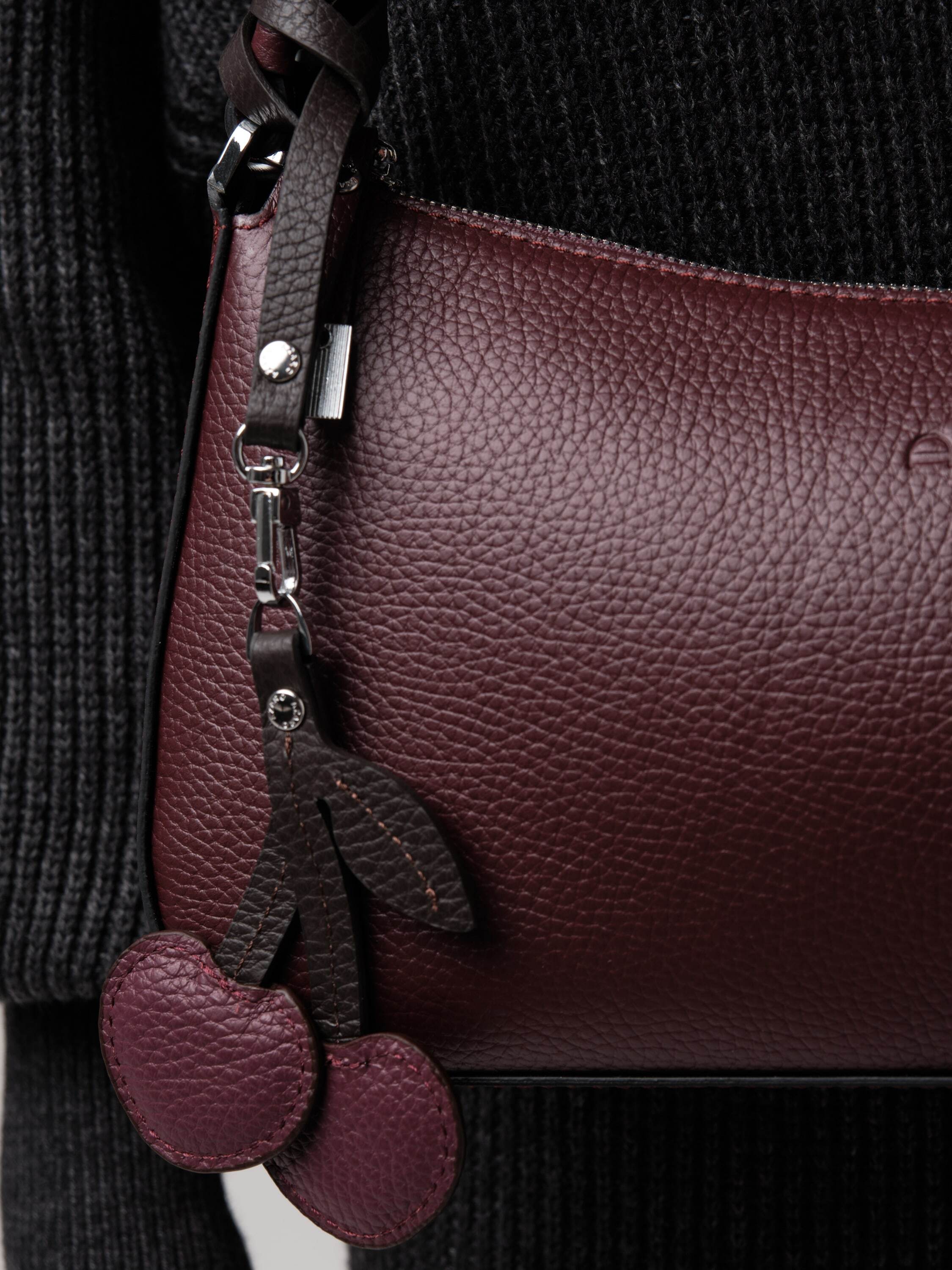 Особая деталь - кожаный подвес в виде вишенок. Он добавляет аксессуару лёгкий флирт, тонкую ноту игривости, превращая строгую форму в нечто более живое, характерное, запоминающееся.