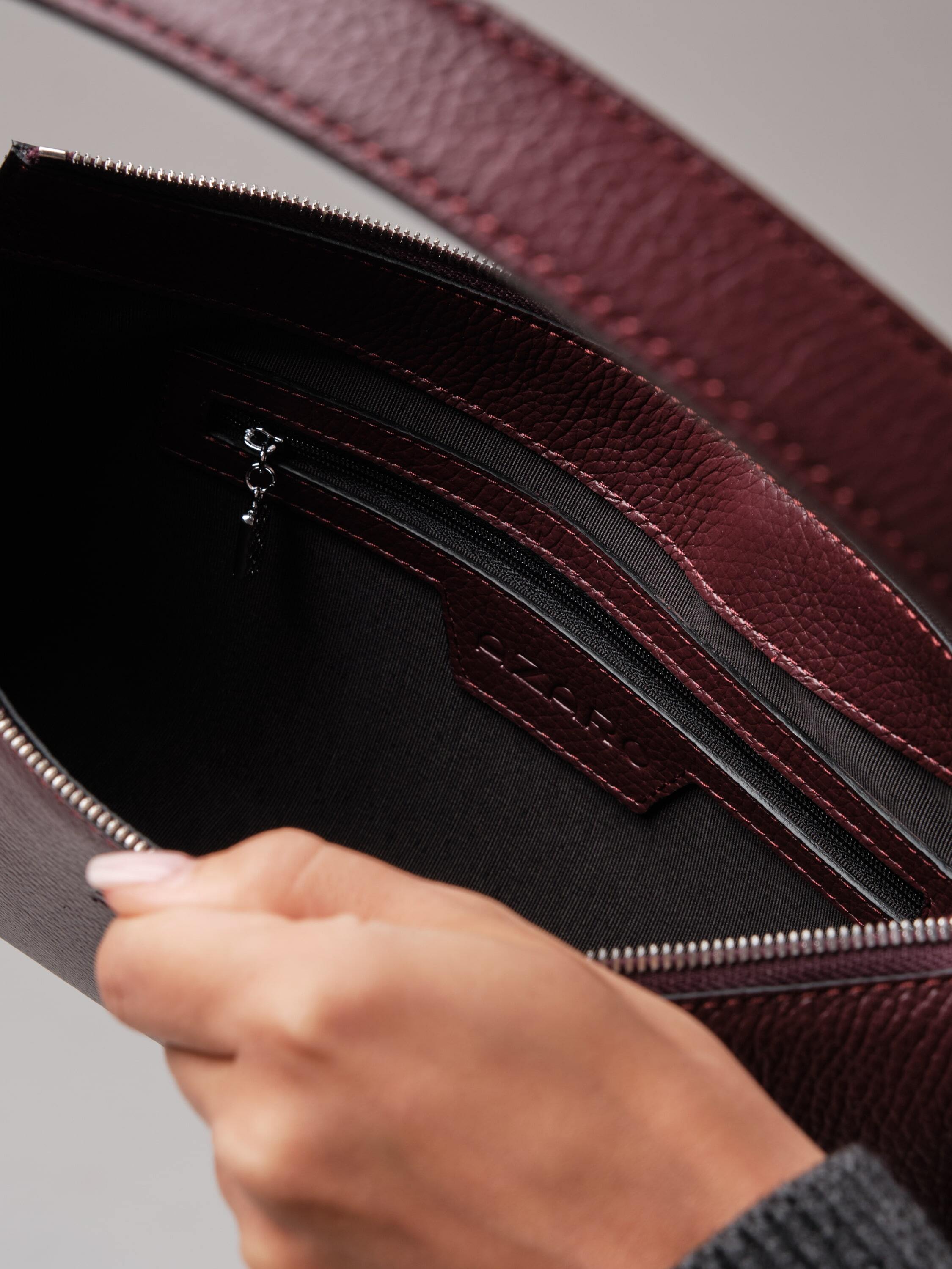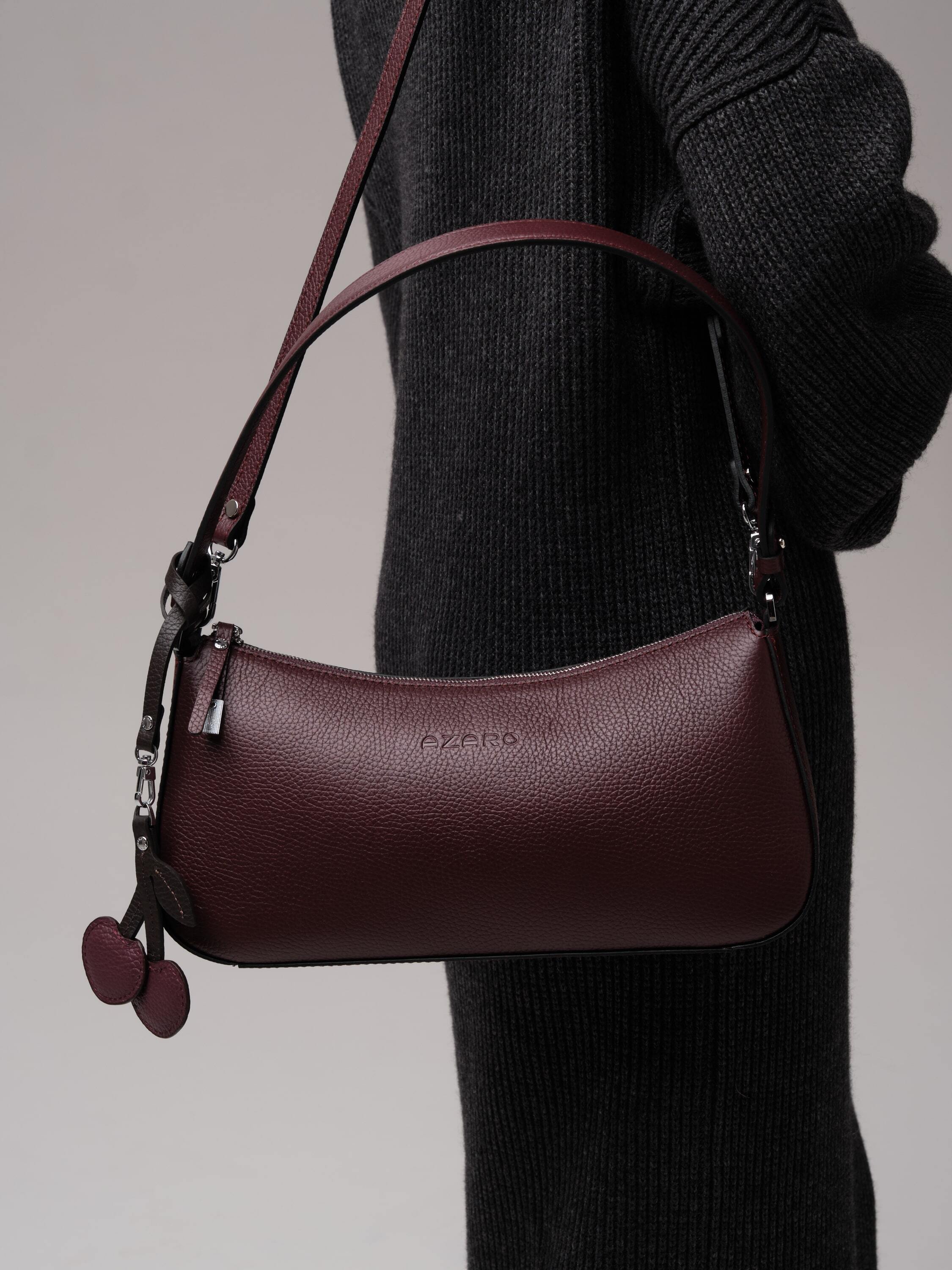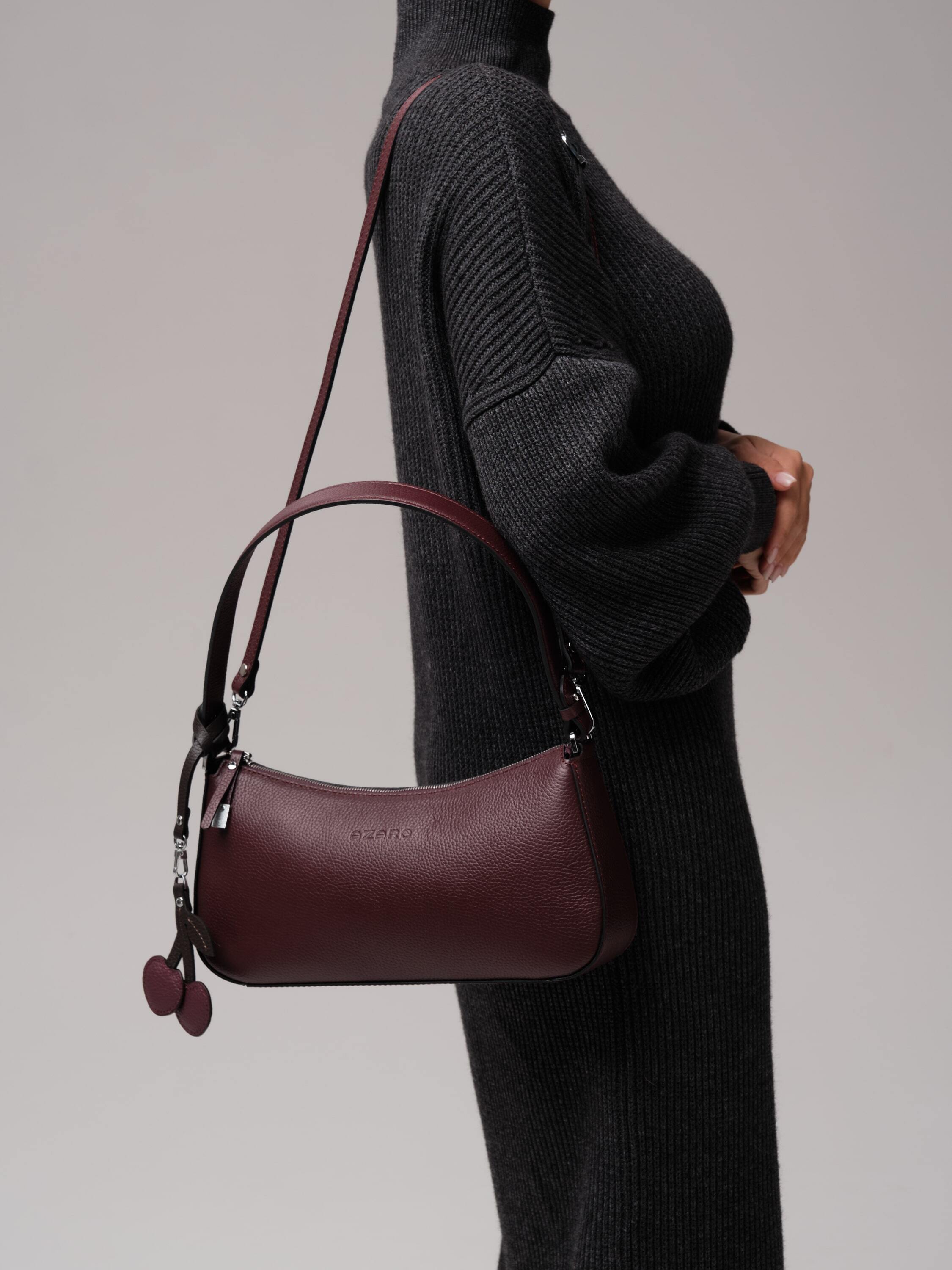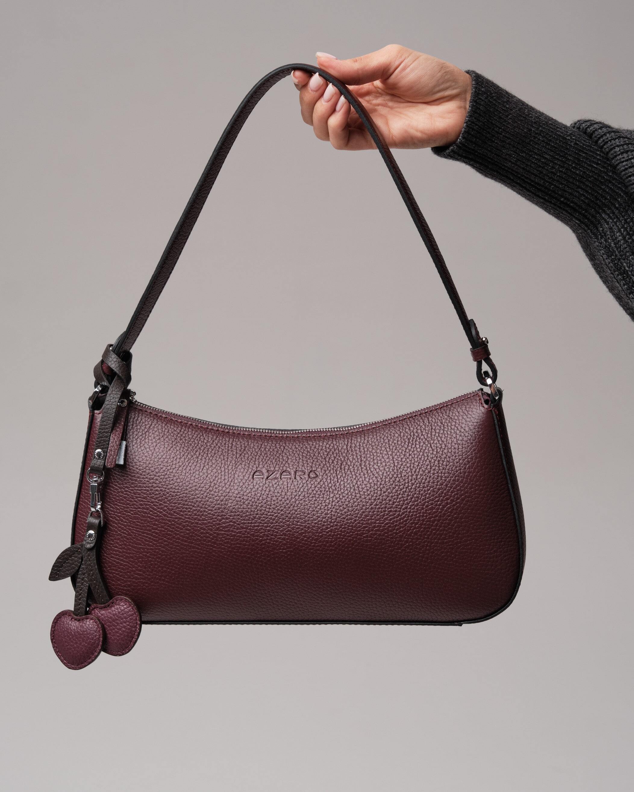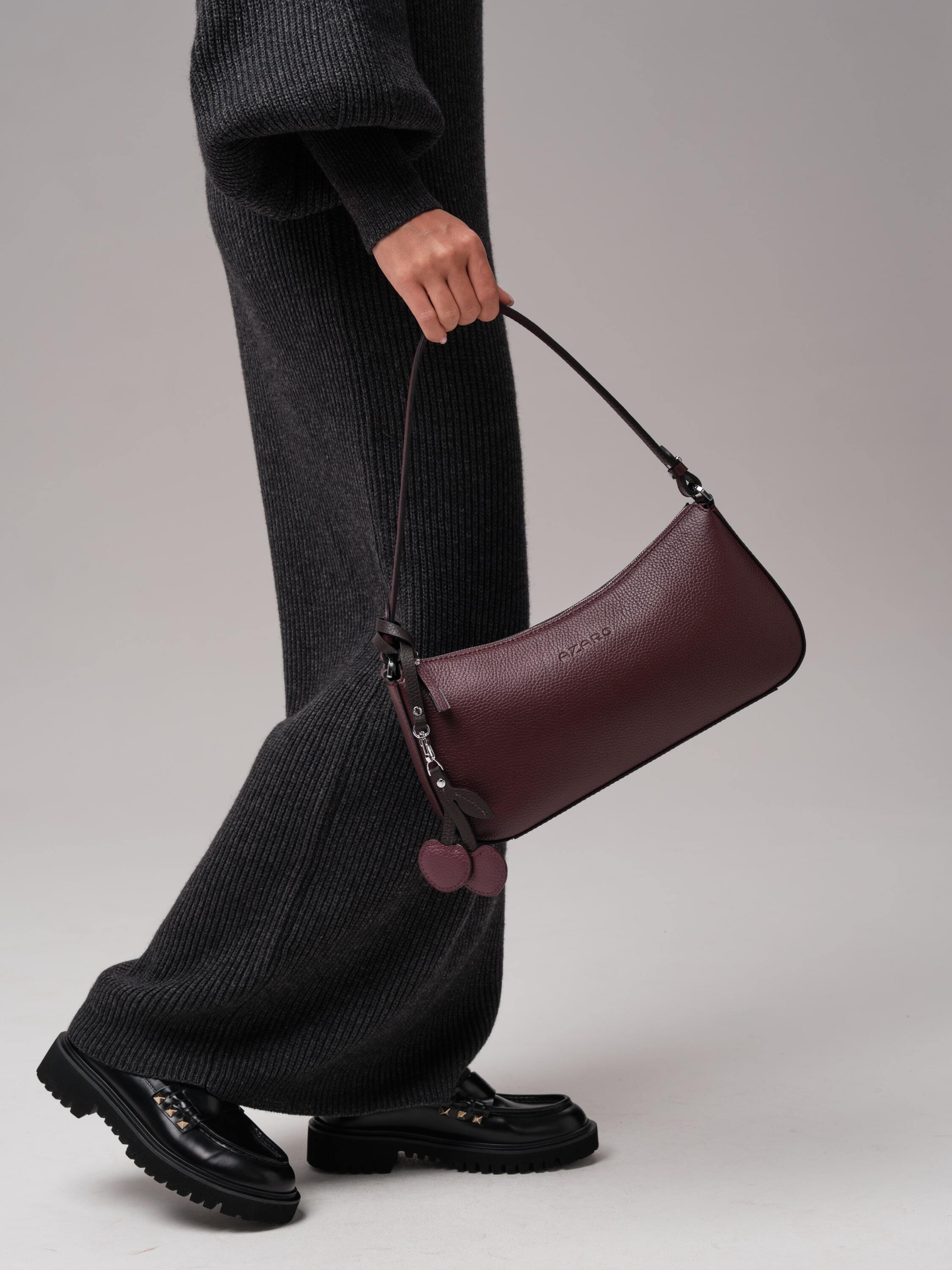 Особая деталь - кожаный подвес в виде вишенок. Он добавляет аксессуару лёгкий флирт, тонкую ноту игривости, превращая строгую форму в нечто более живое, характерное, запоминающееся.