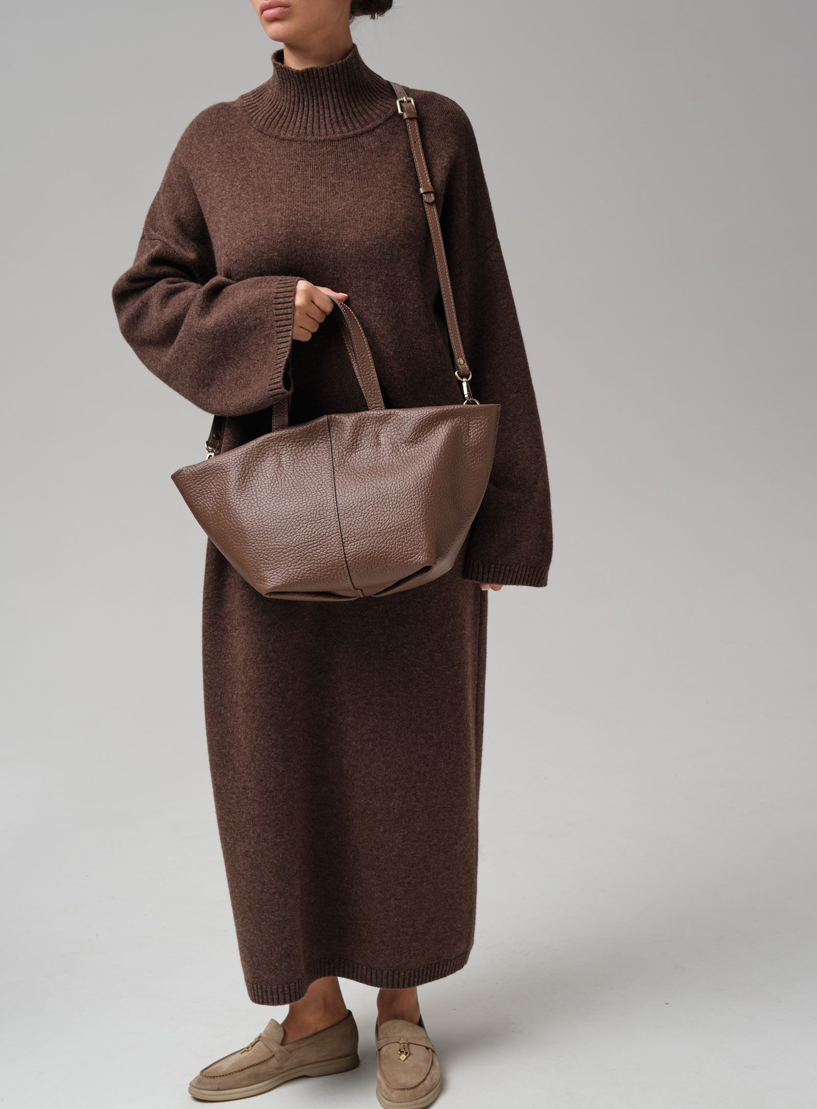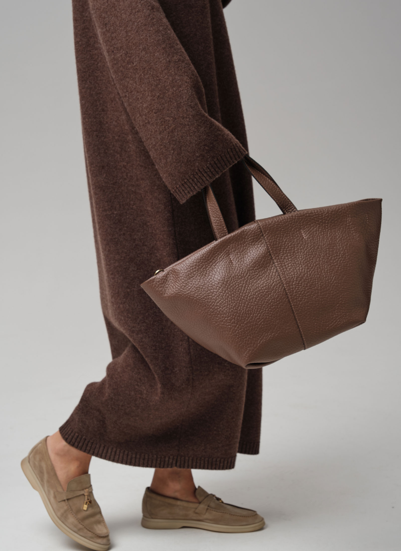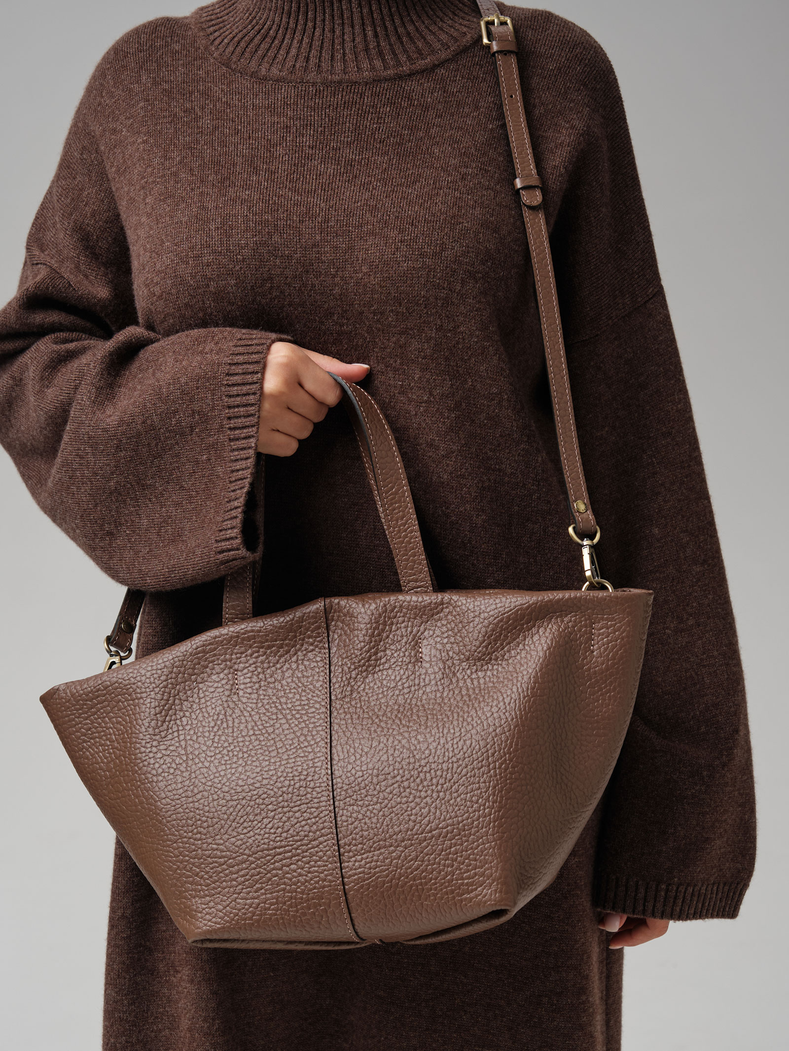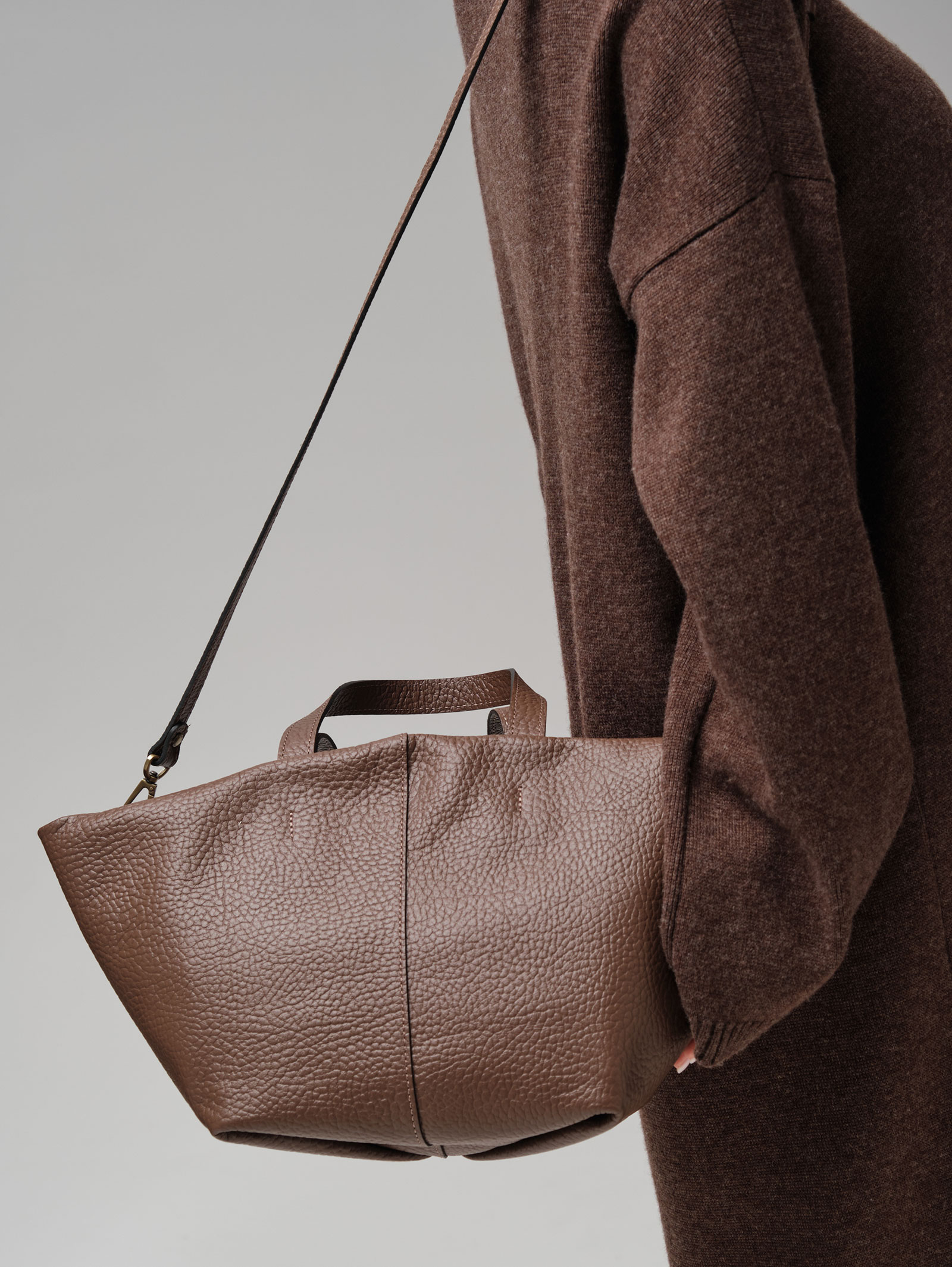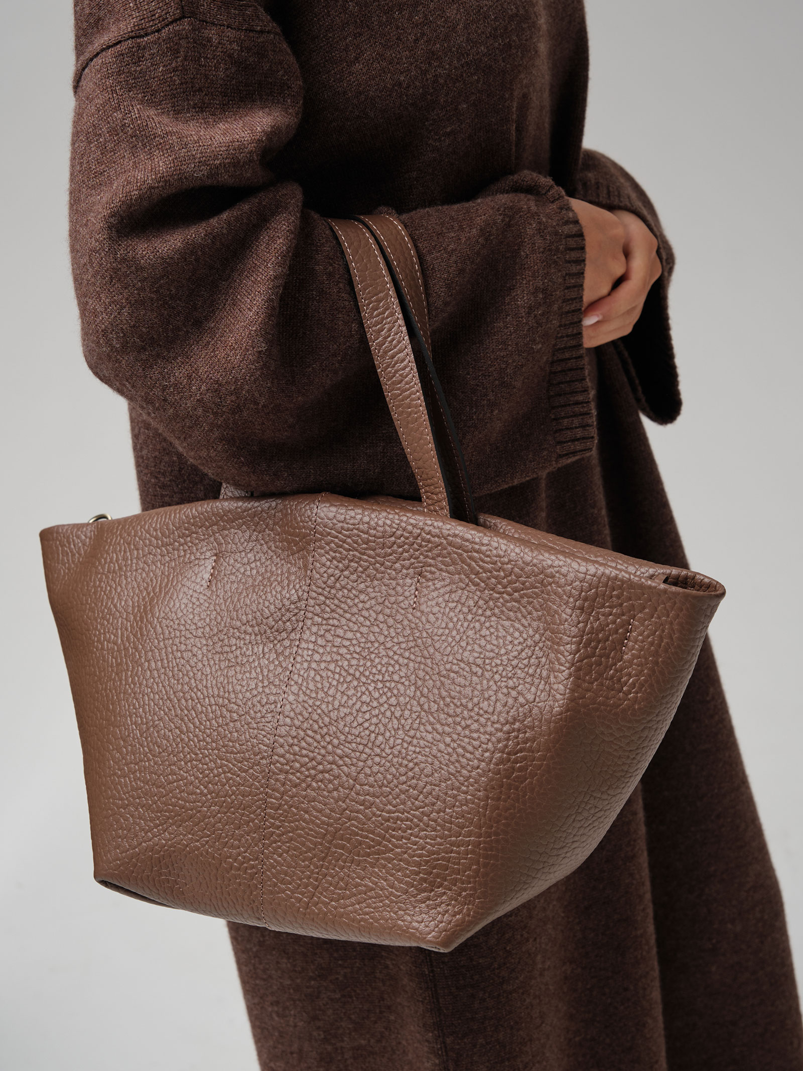 Две широкие кожаные ручки удобны для ношения в руке или на предплечье, хорошо прошиты и выдерживают значительный вес.