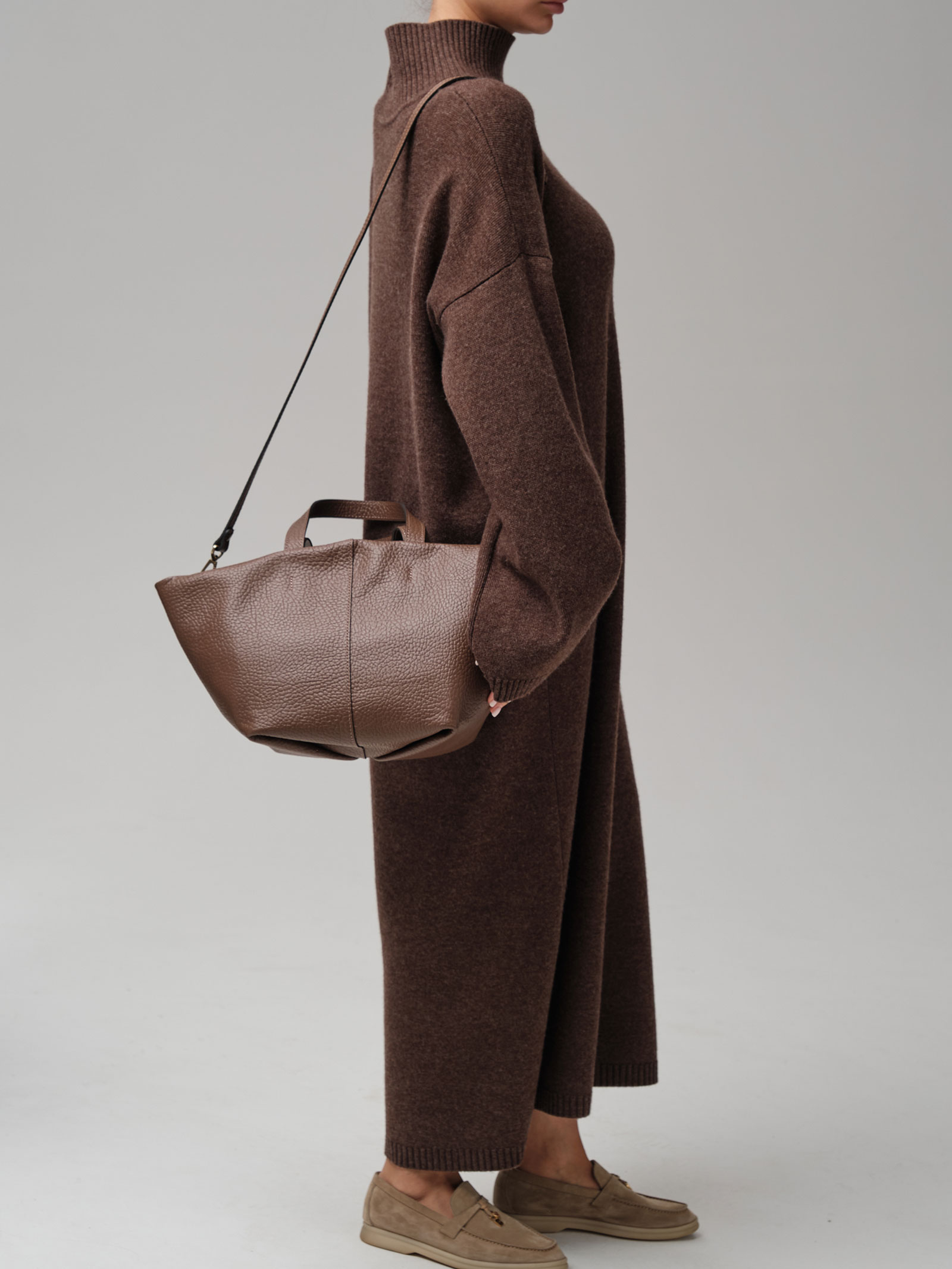 Трапециевидная, слегка расклёшенная форма с мягкими линиями сочетает в себе лаконичность и практичность. Минималистичный стиль без лишнего декора универсален для разных образов.