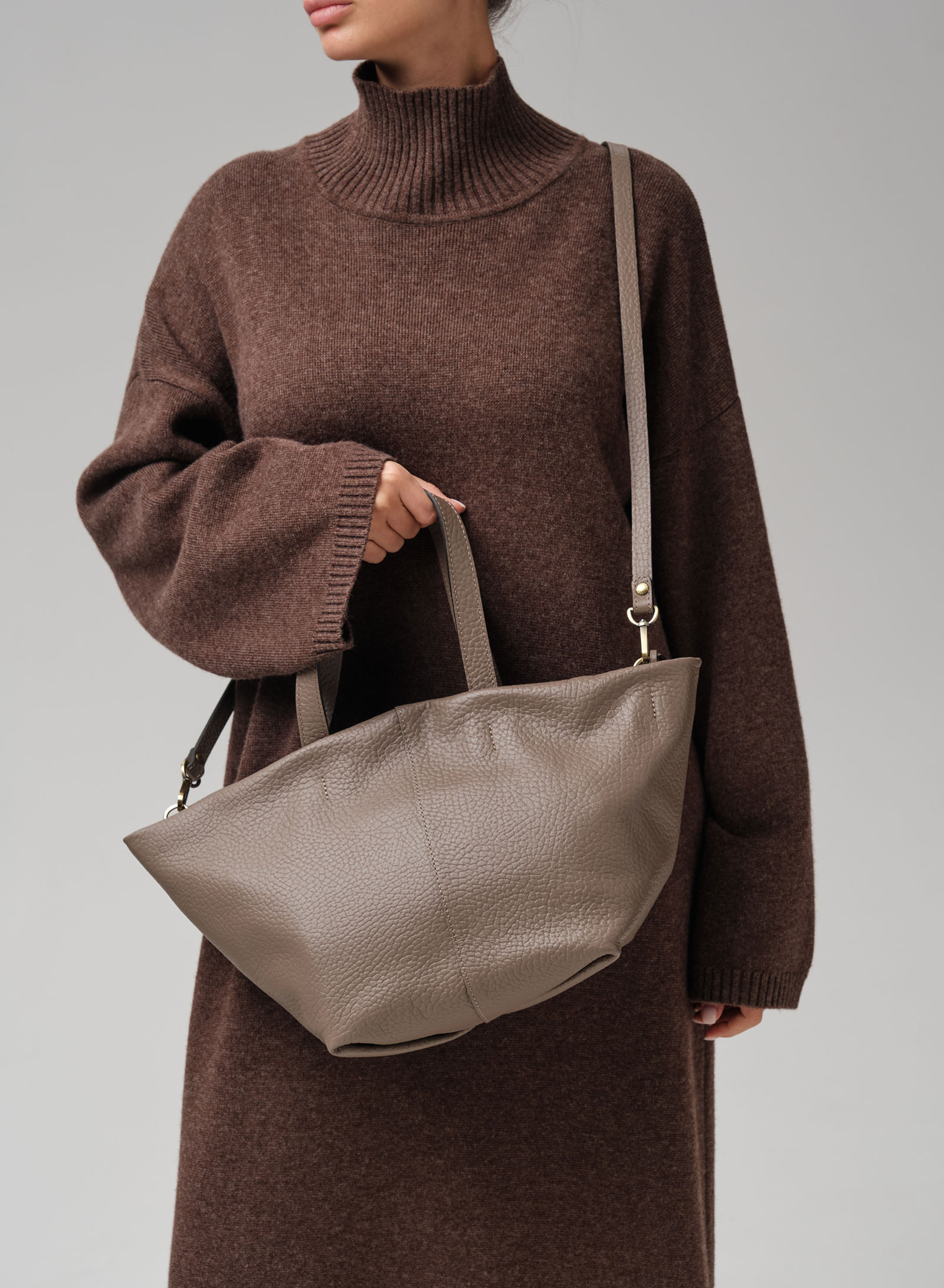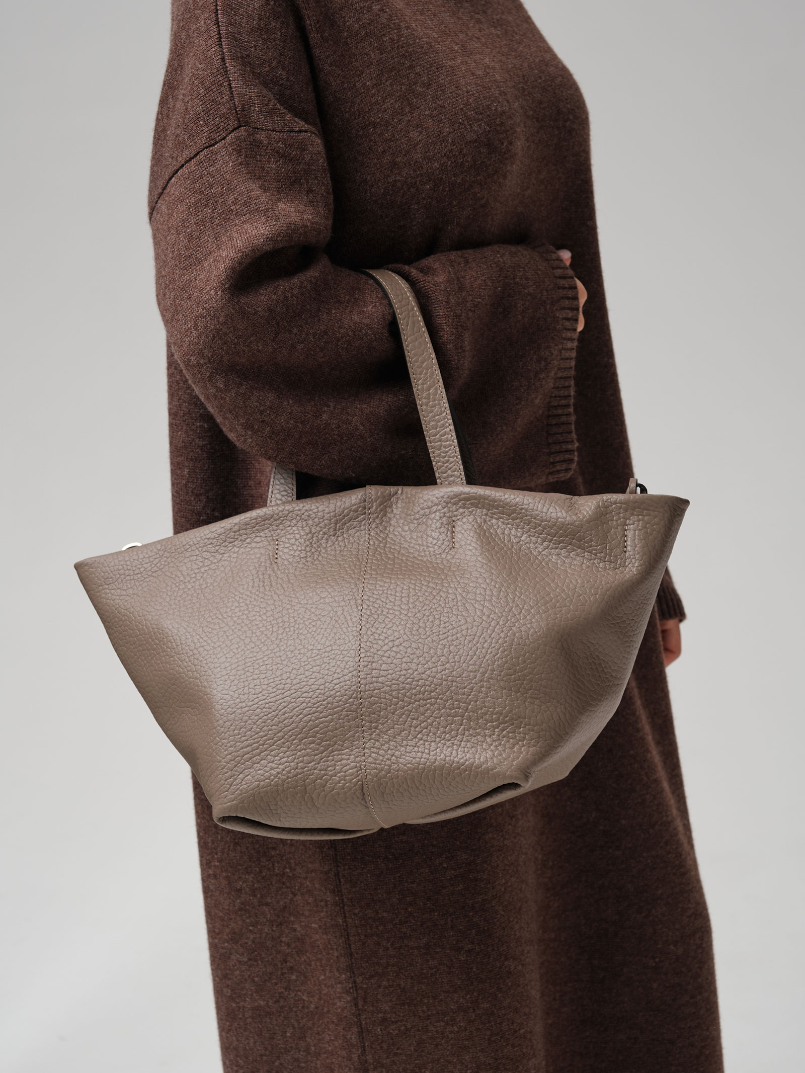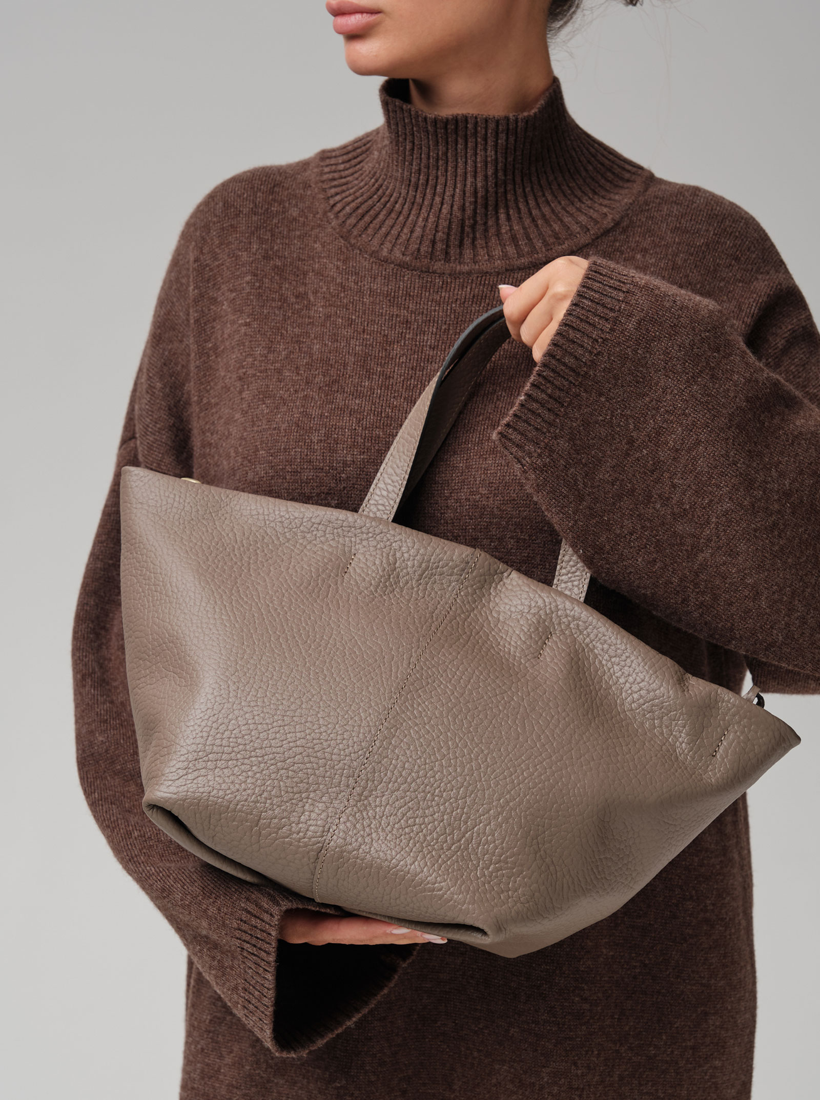 Элегантная сумка-тоут Azaro 31355 тауп соло из высококачественной натуральной зернистой кожи приглушенного серо-коричневого оттенка, сочетающего в себе теплоту коричневого и прохладу серого.