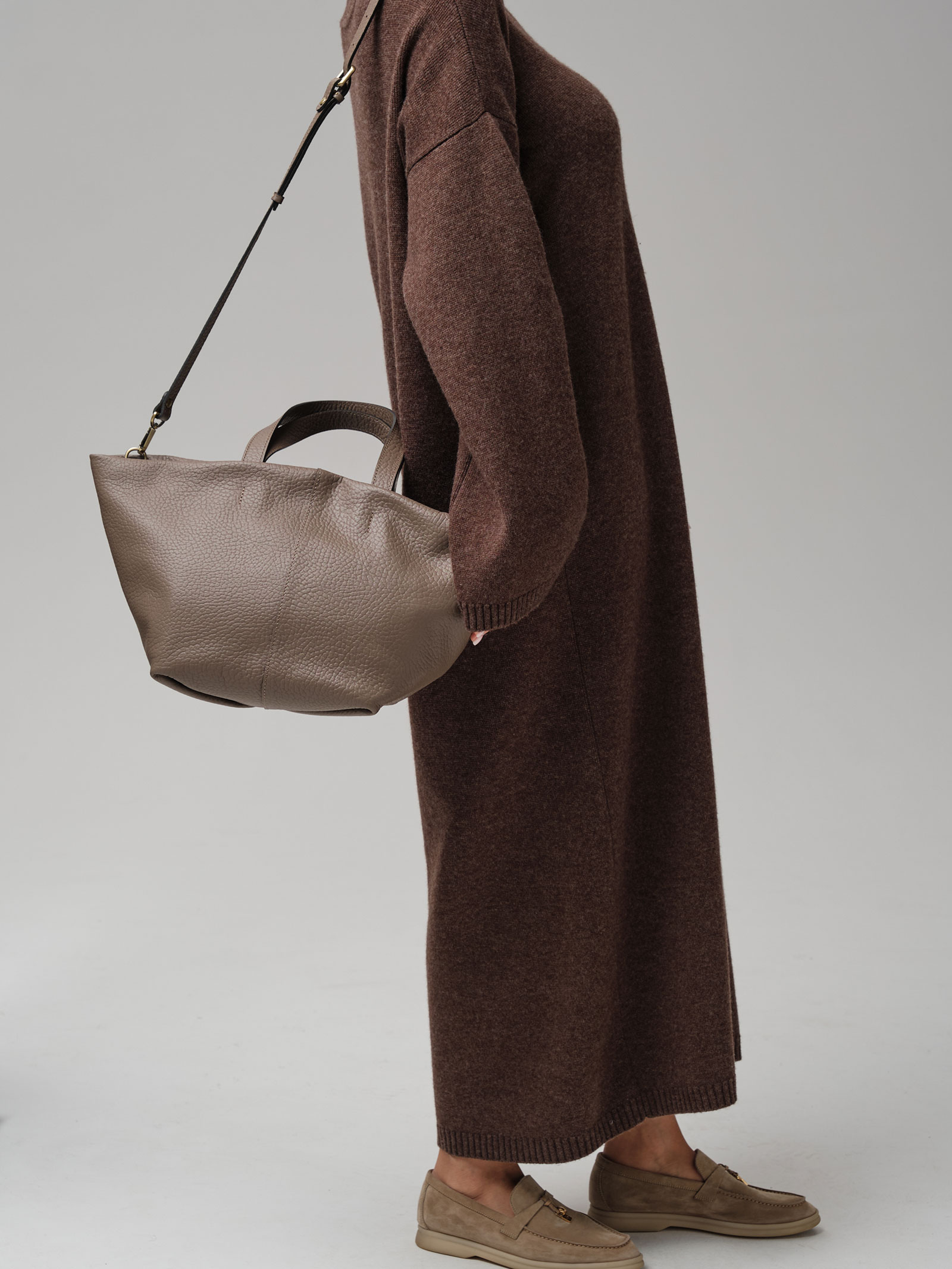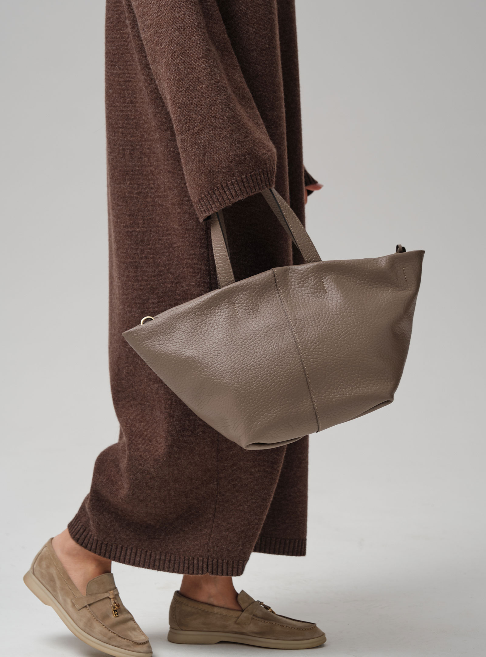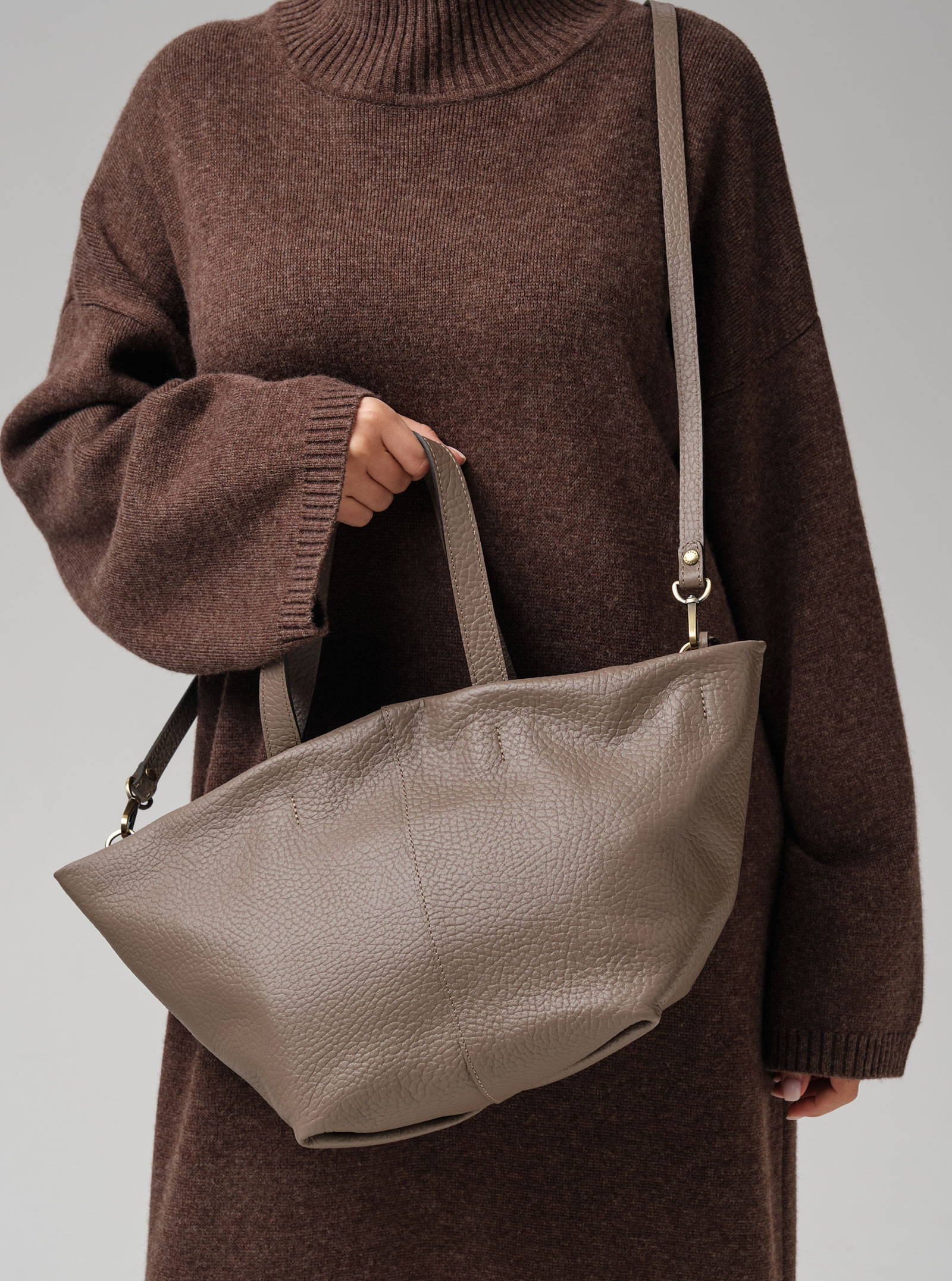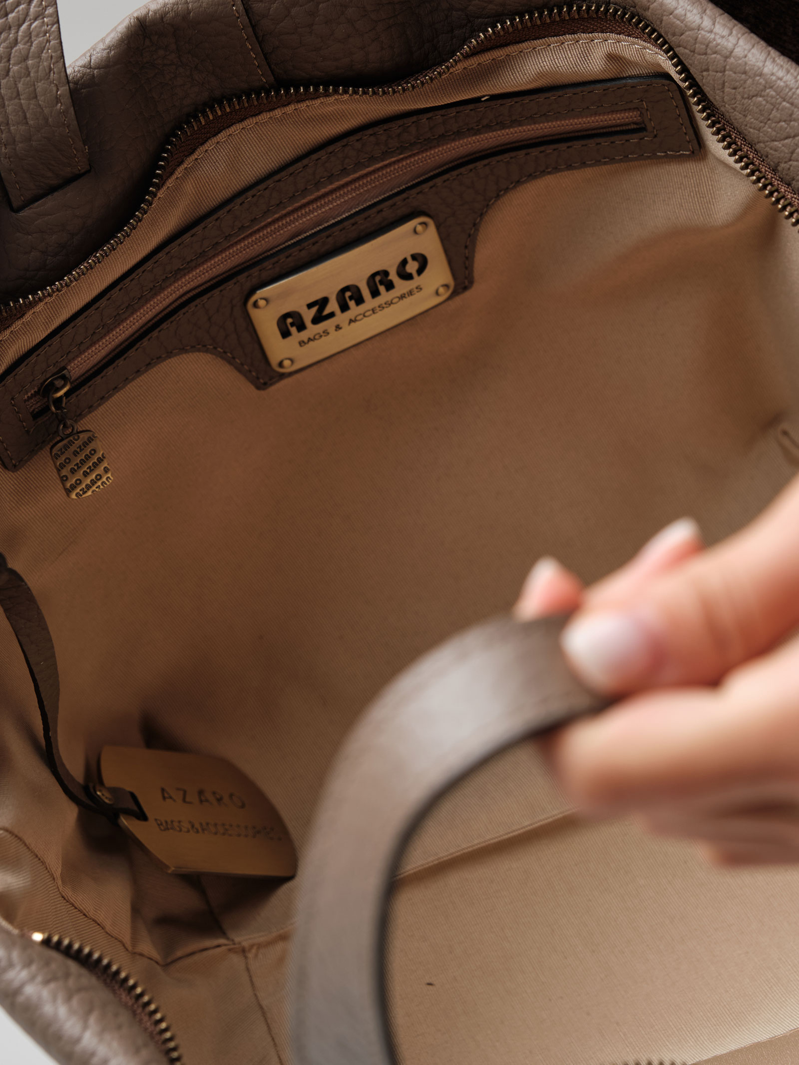 Элегантная сумка-тоут Azaro 31355 тауп соло из высококачественной натуральной зернистой кожи приглушенного серо-коричневого оттенка, сочетающего в себе теплоту коричневого и прохладу серого.