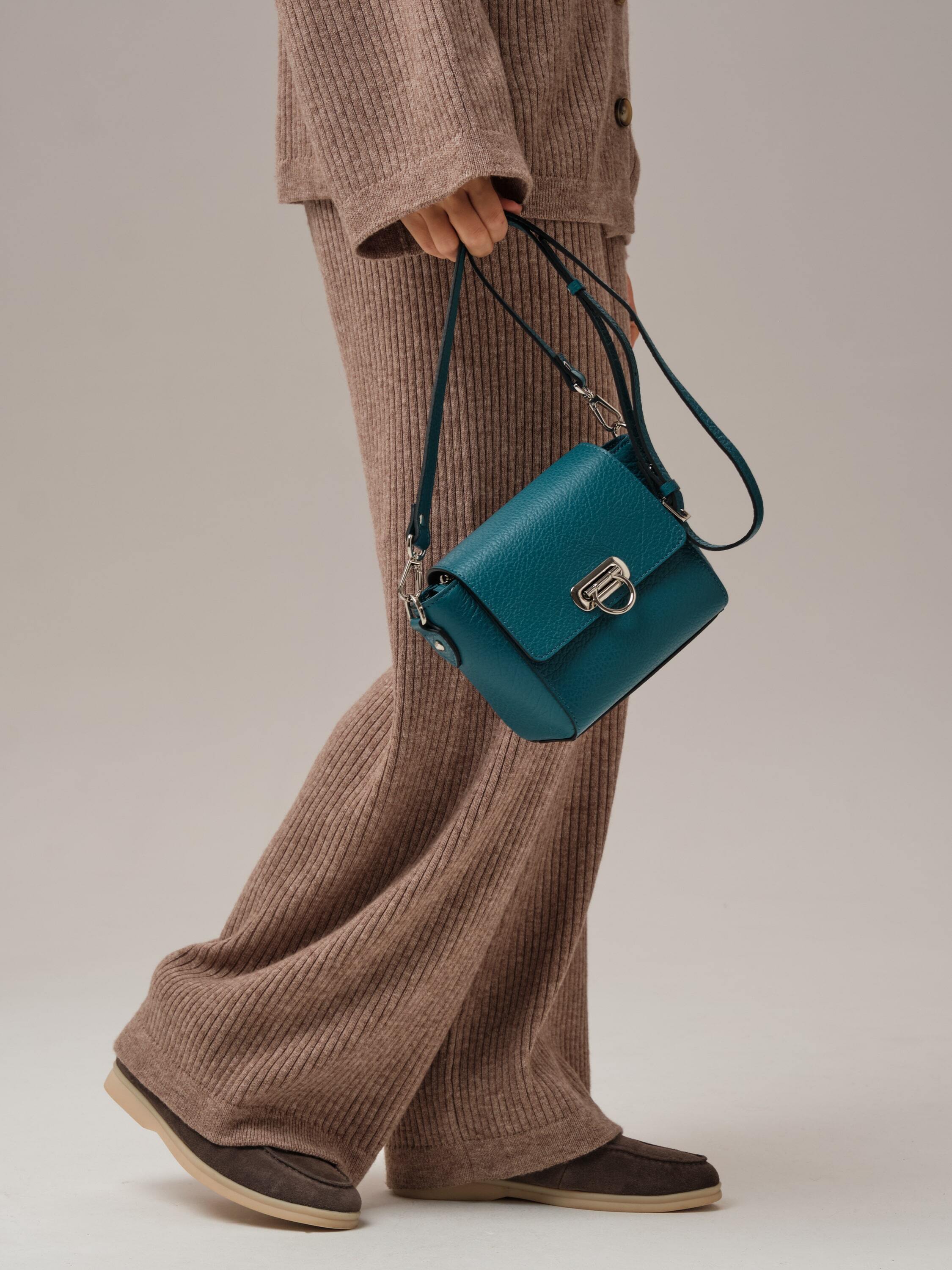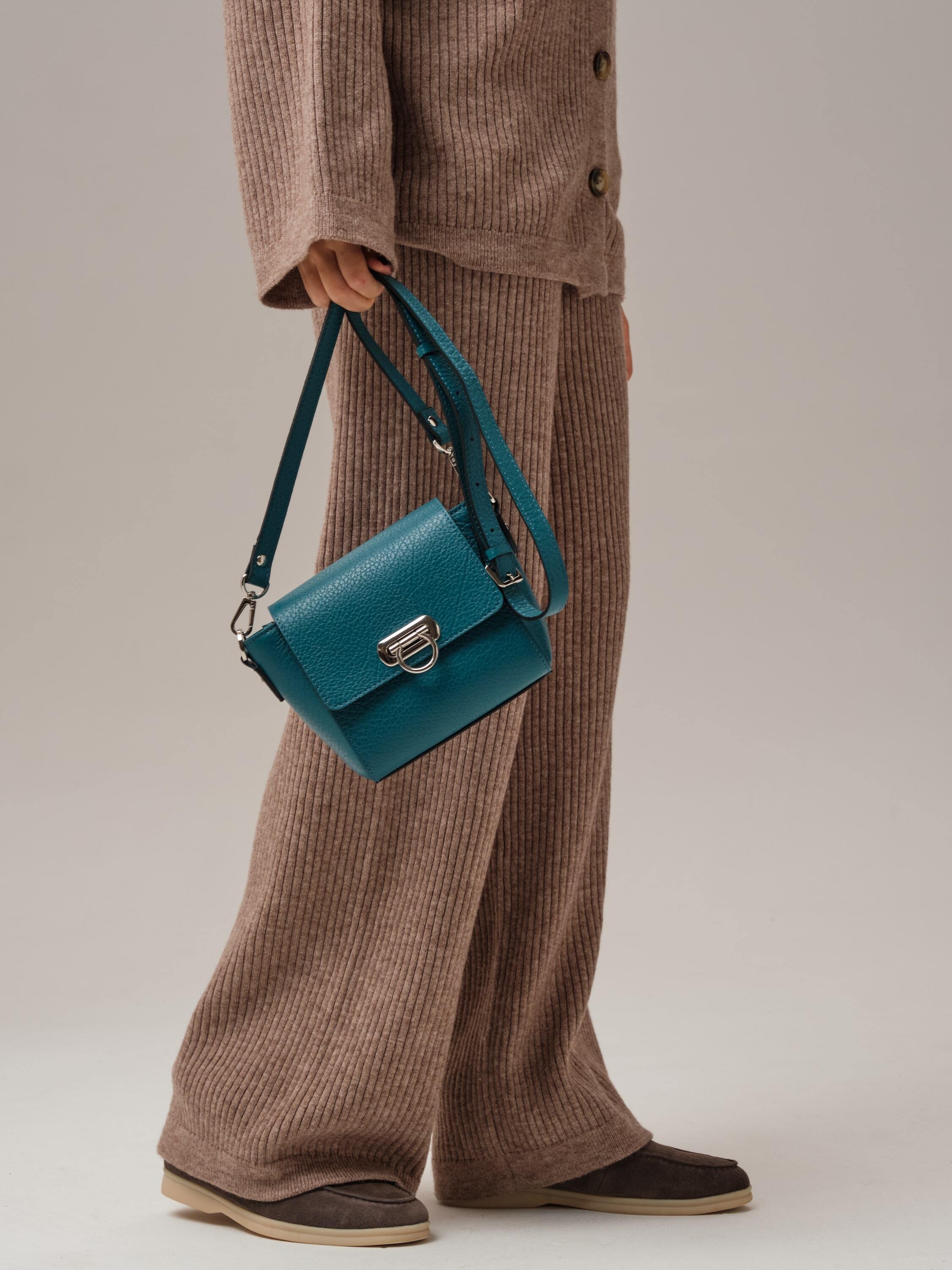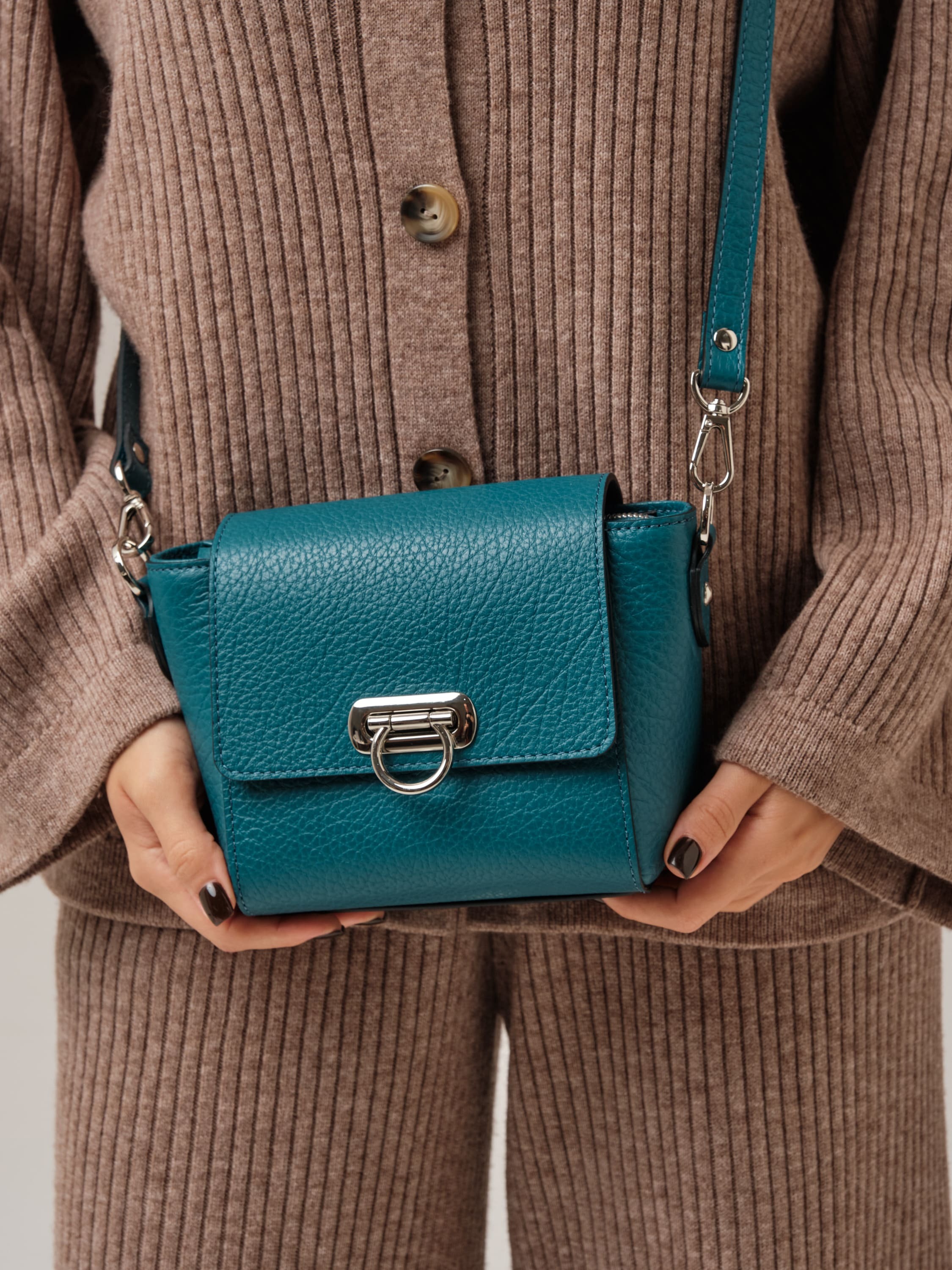Перламутровый оттенок, глубокий и насыщенный, придаёт образу утончённость и элегантность. Этот цвет идеально сочетается как с нейтральными, так и с контрастными тонами, делая сумку универсальной деталью гардероба.