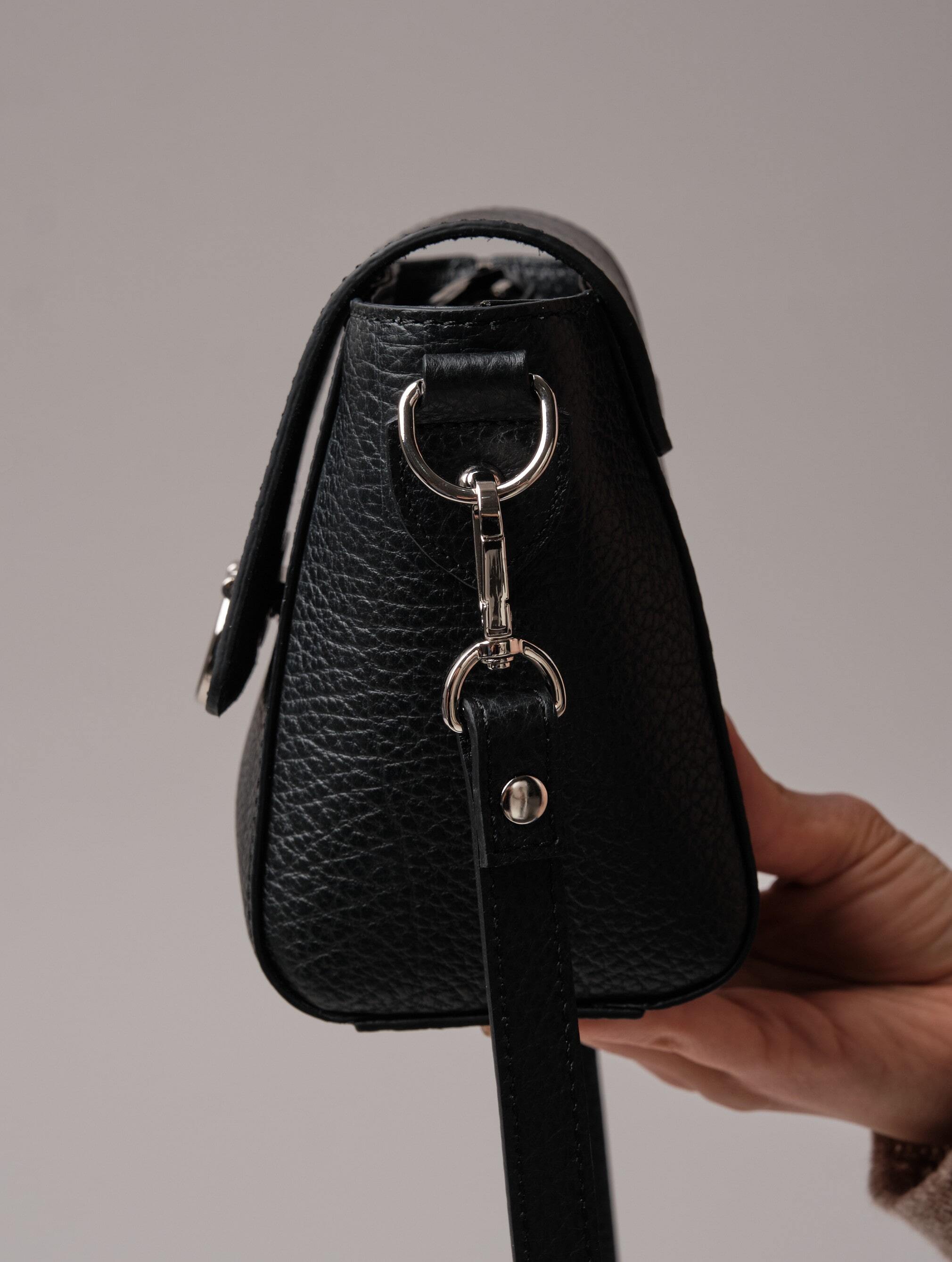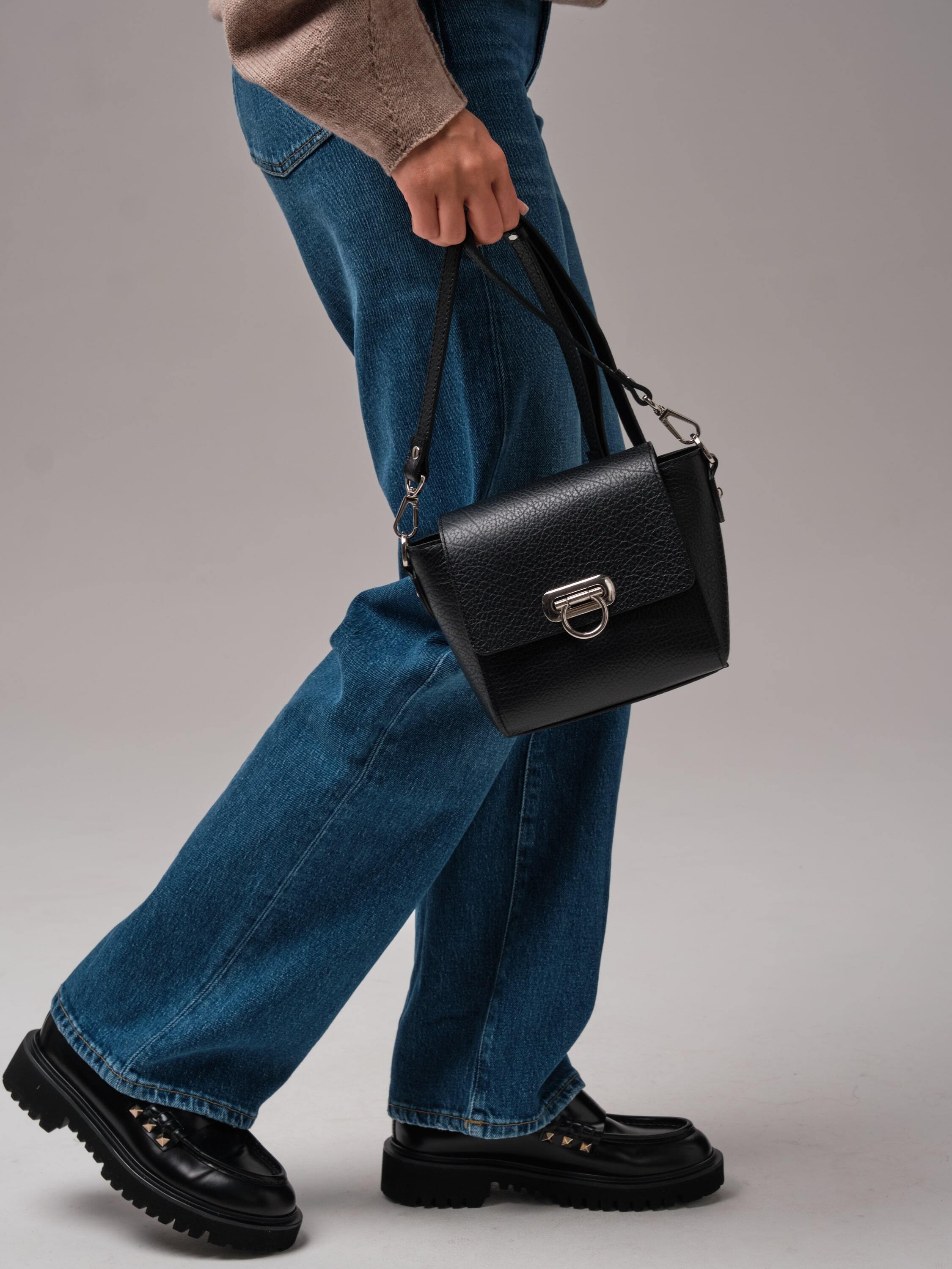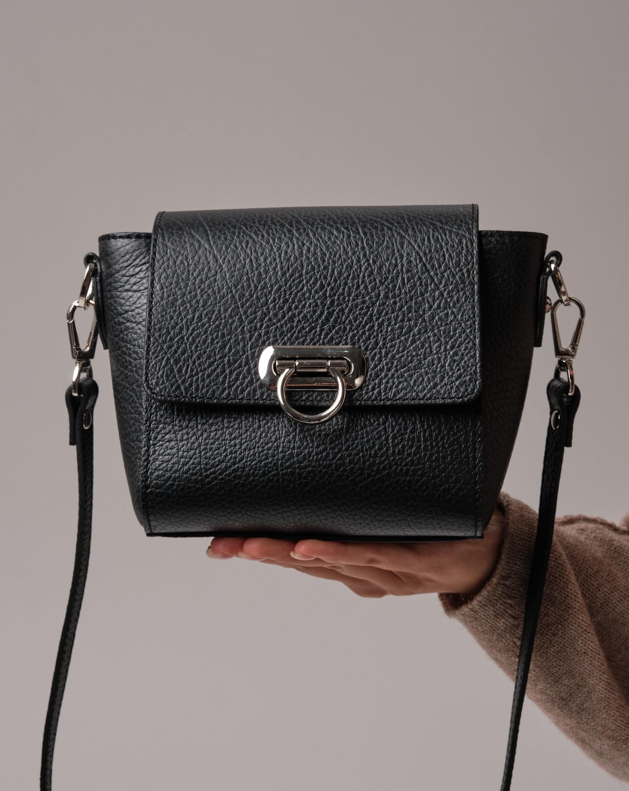 Глубокий и насыщенный черный цвет придаёт образу утончённость и элегантность. Этот цвет идеально сочетается как с нейтральными, так и с контрастными тонами, делая сумку универсальной деталью гардероба.