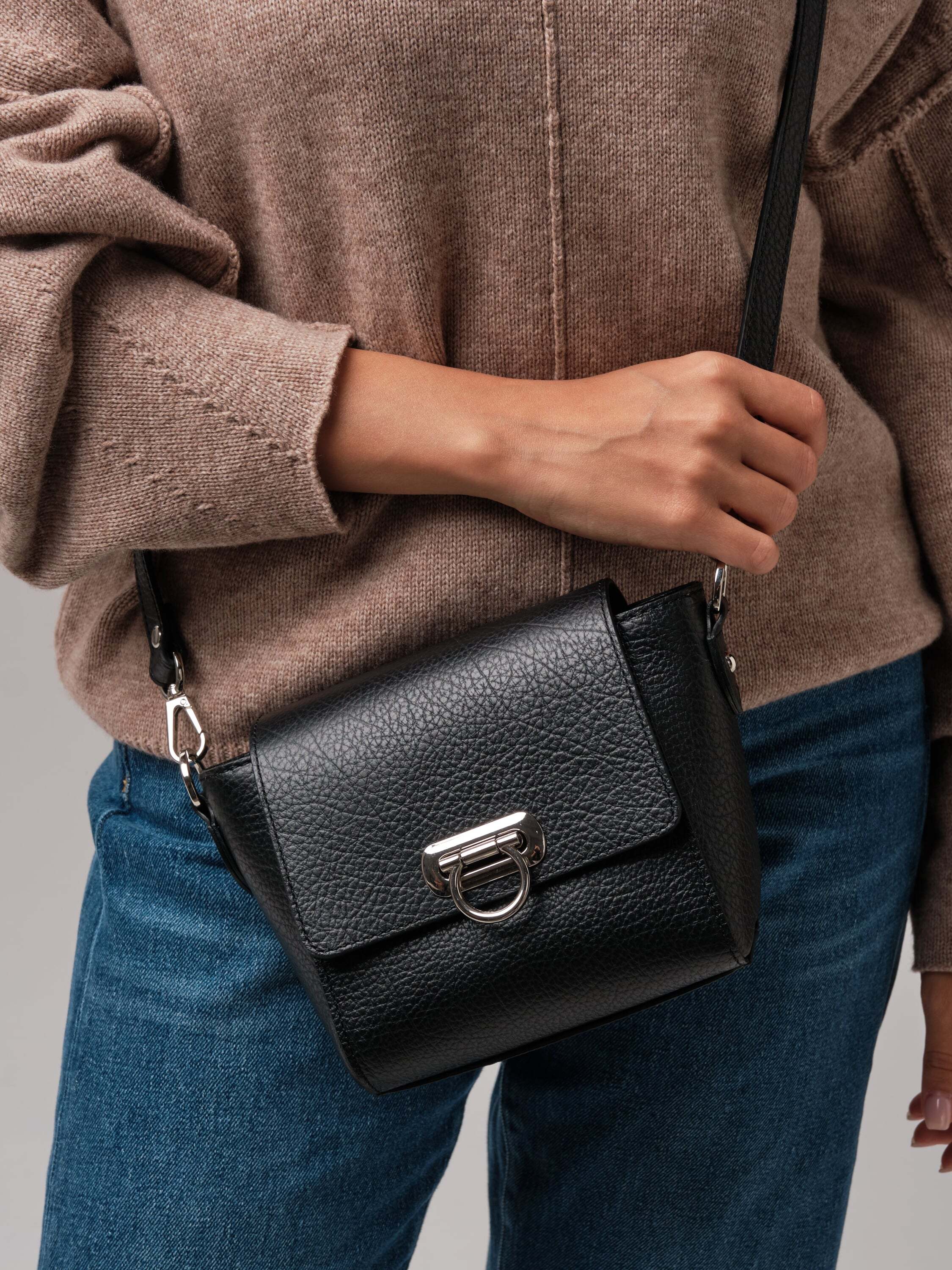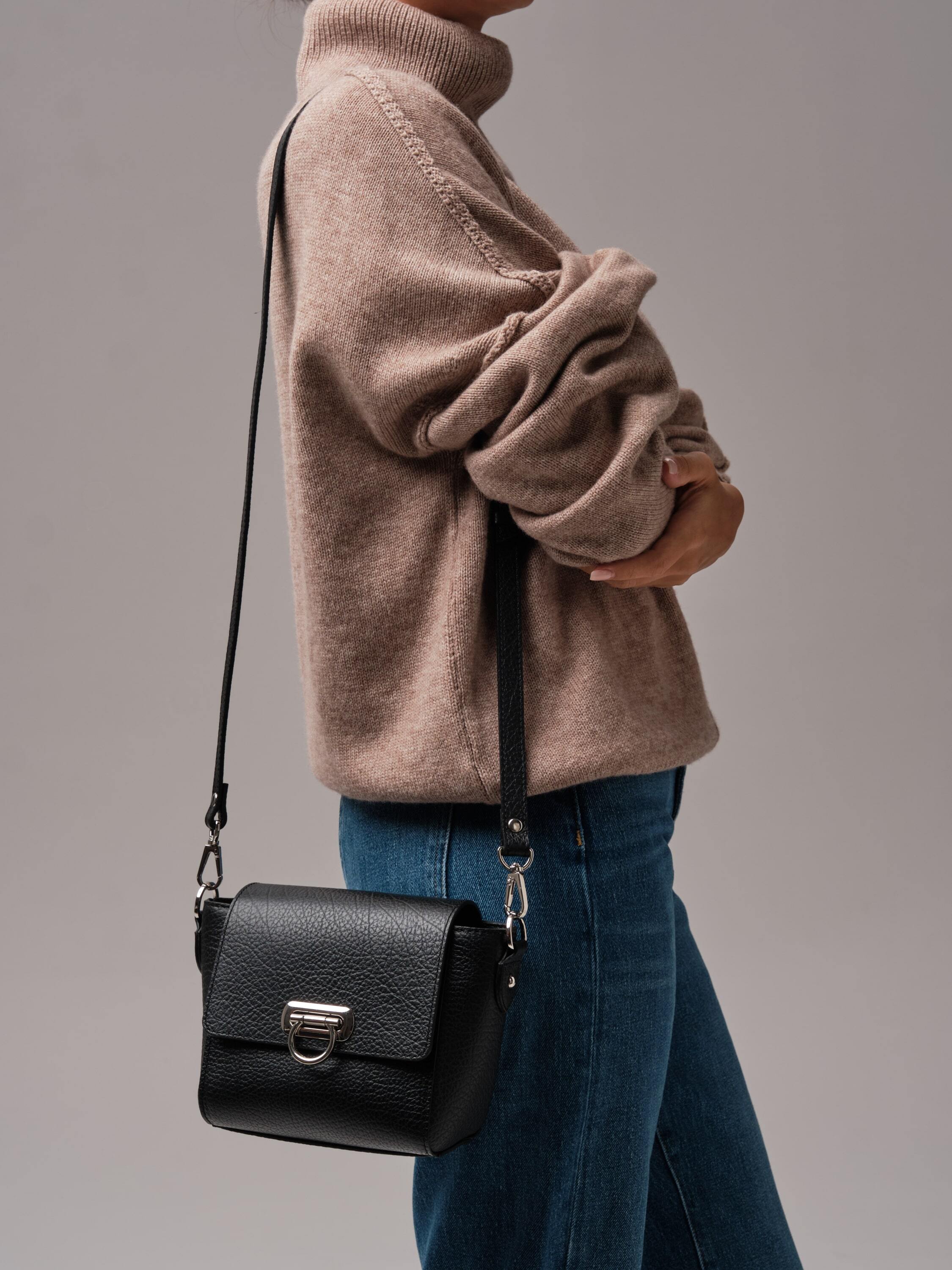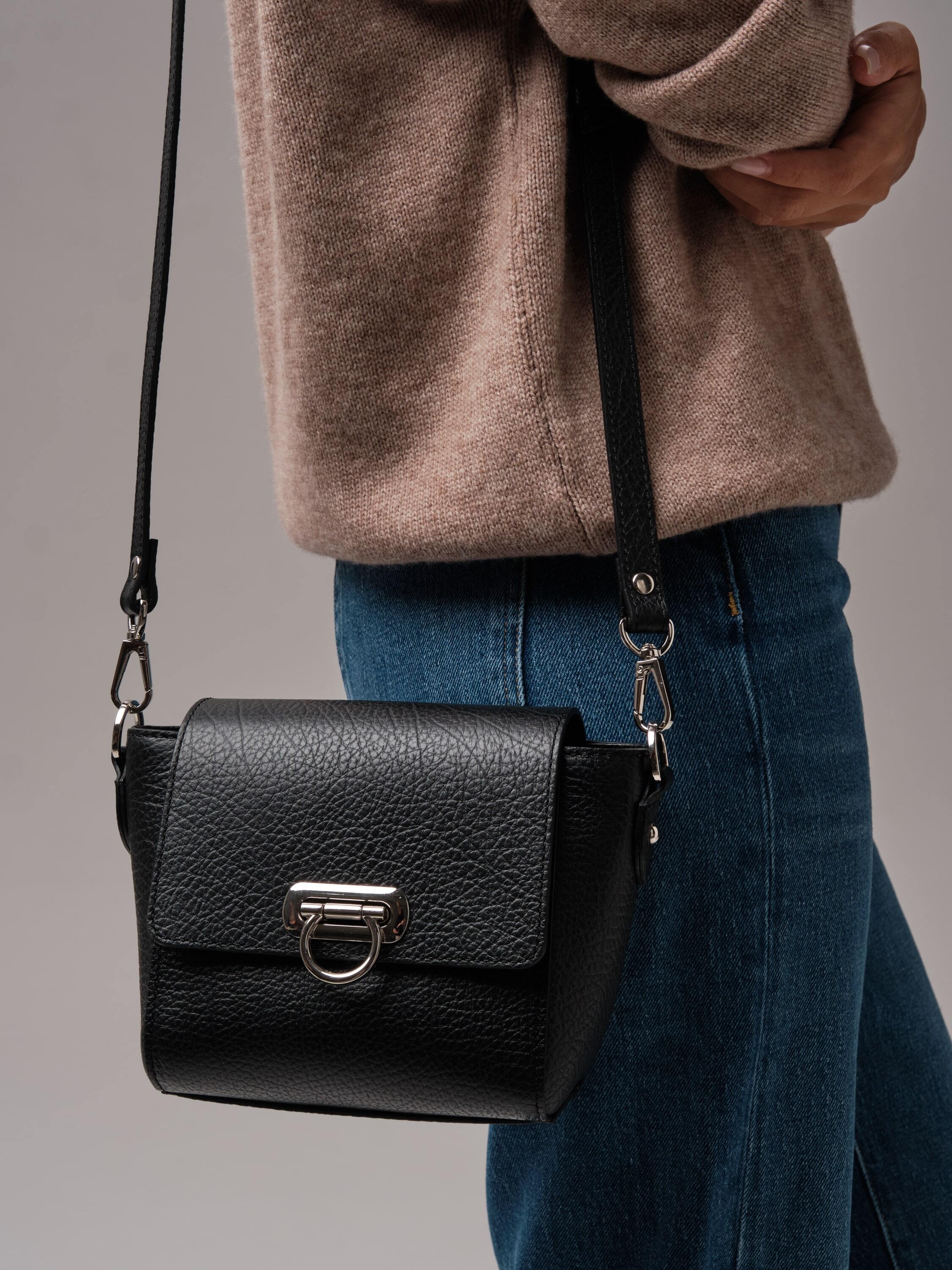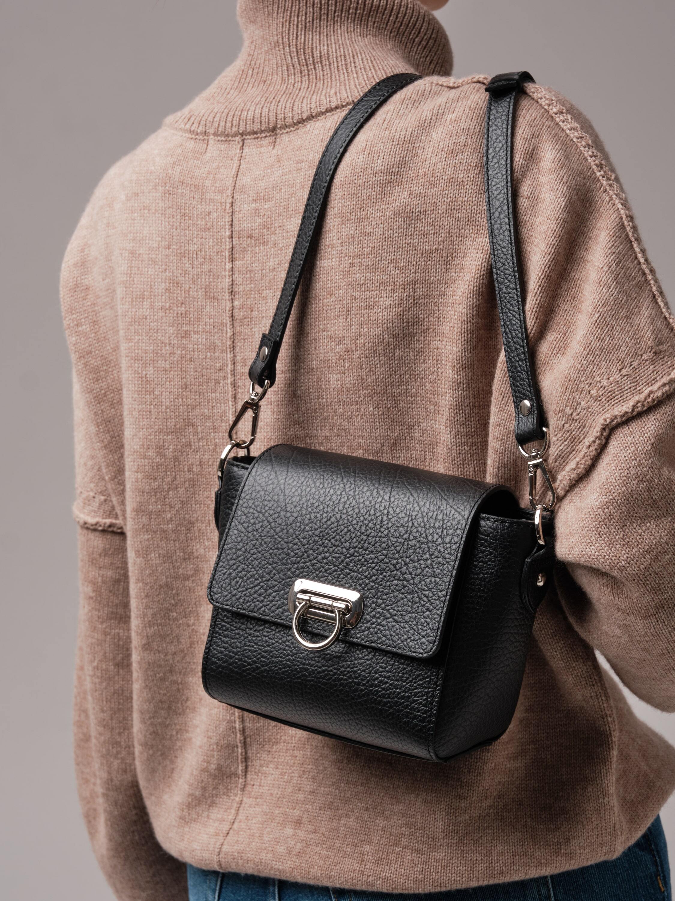 Глубокий и насыщенный черный цвет придаёт образу утончённость и элегантность. Этот цвет идеально сочетается как с нейтральными, так и с контрастными тонами, делая сумку универсальной деталью гардероба.