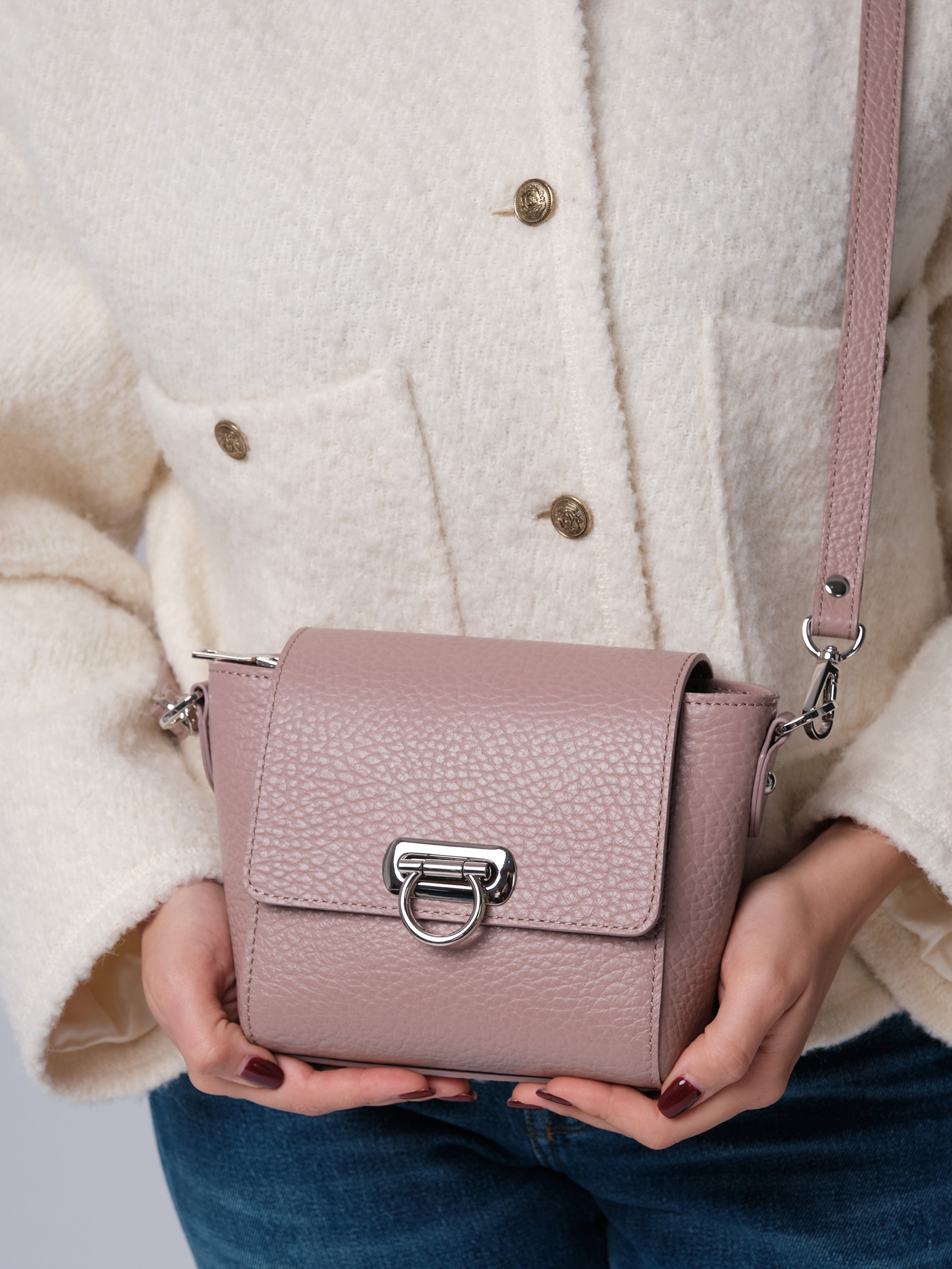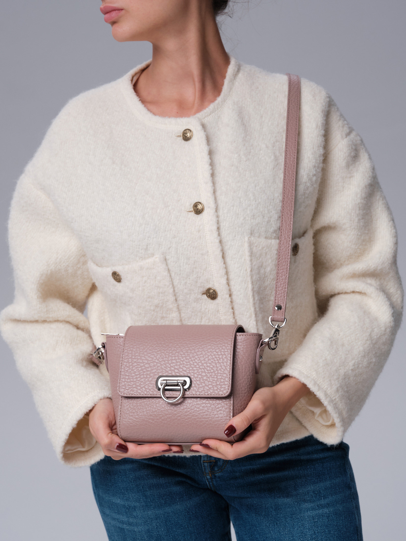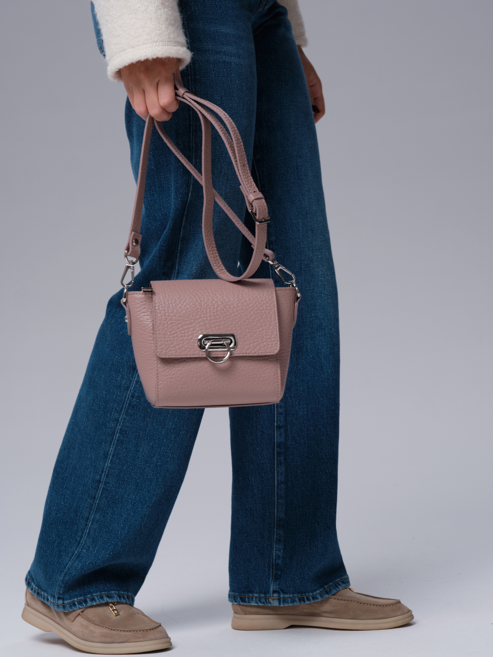 Мягкий, приглушённый пыльно-розовый оттенок придаёт образу утончённость и элегантность. Этот цвет хорошо сочетается с разными образами, делая сумку универсальной деталью гардероба.