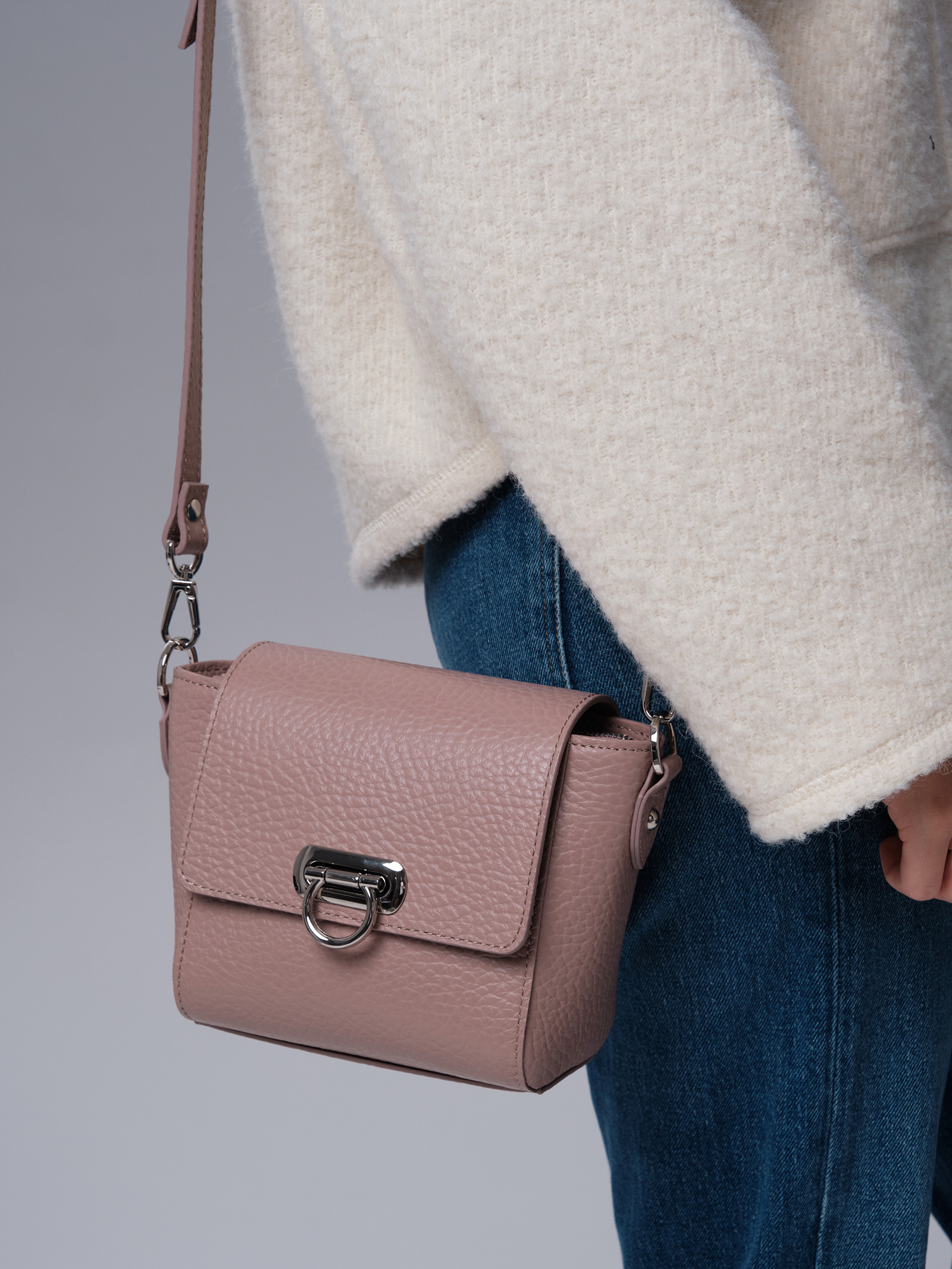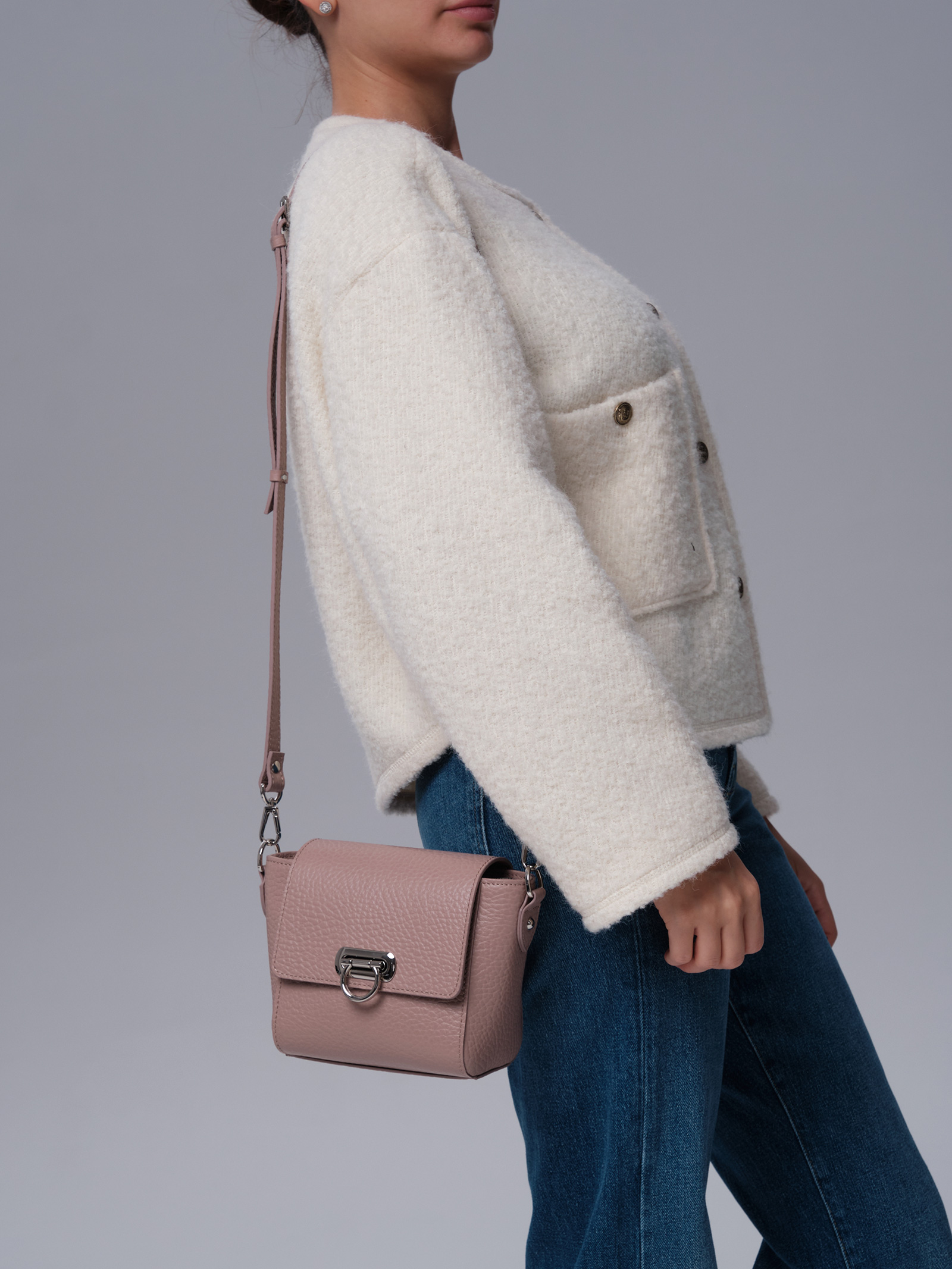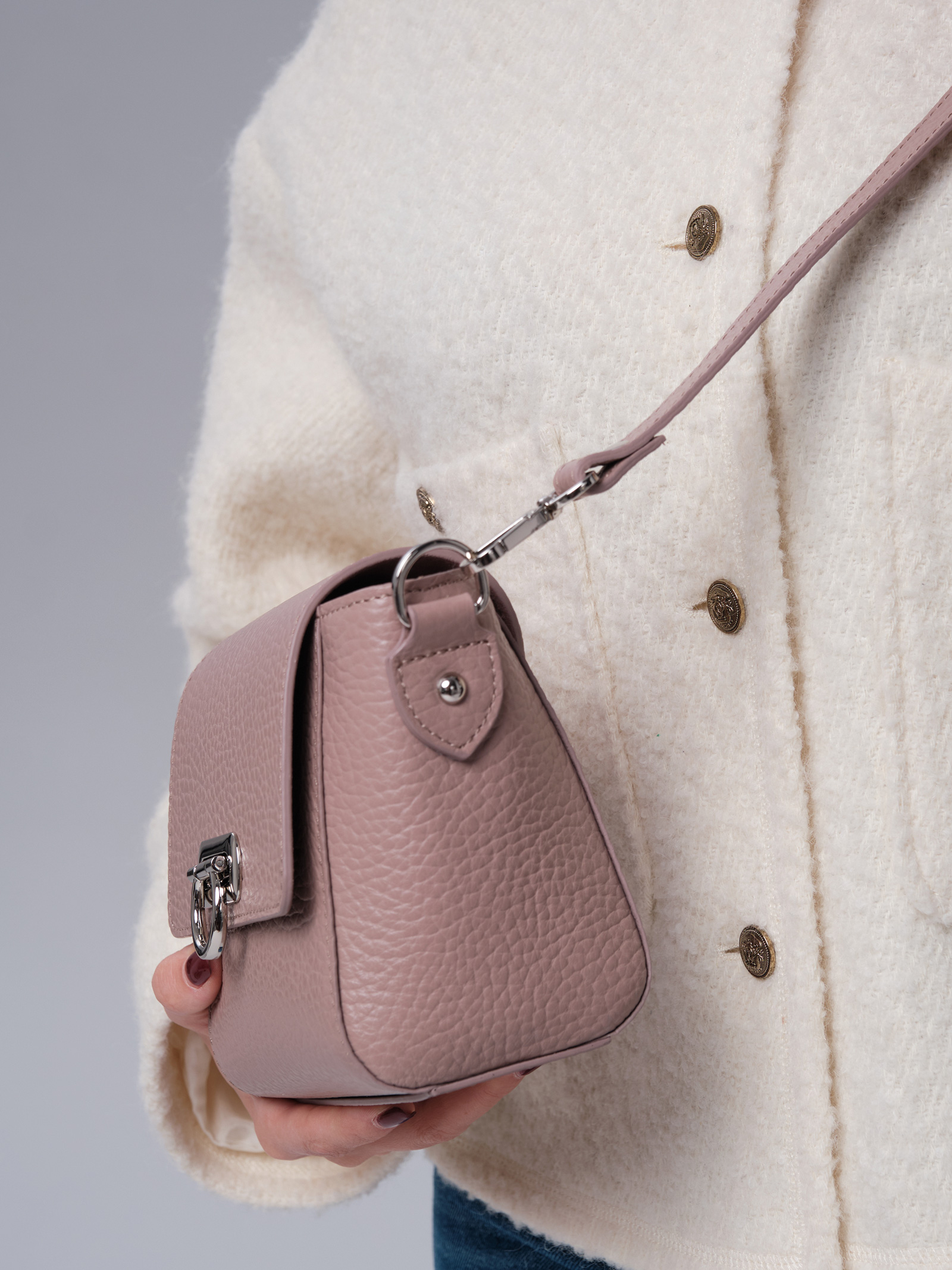 Мягкий, приглушённый пыльно-розовый оттенок придаёт образу утончённость и элегантность. Этот цвет хорошо сочетается с разными образами, делая сумку универсальной деталью гардероба.