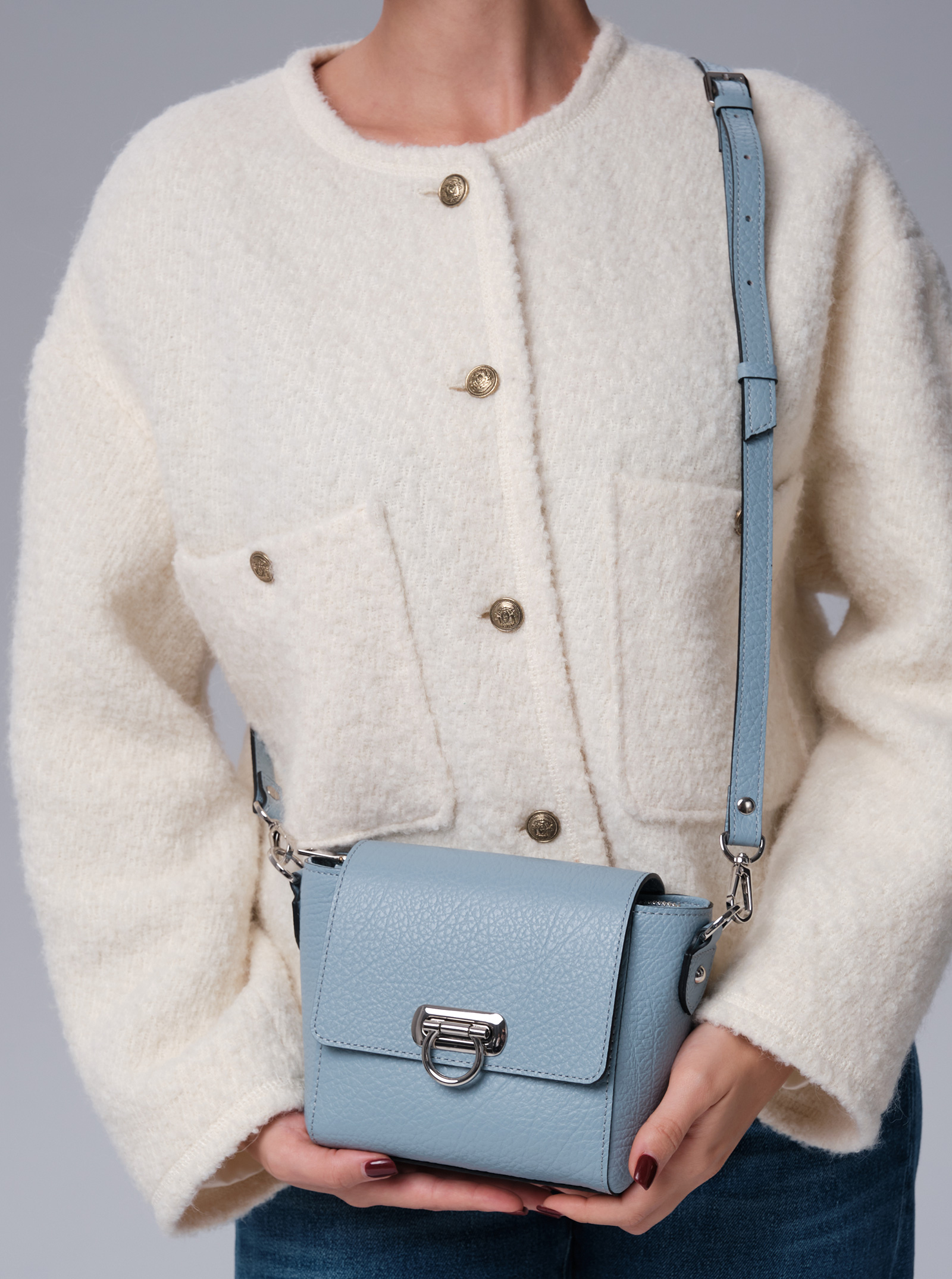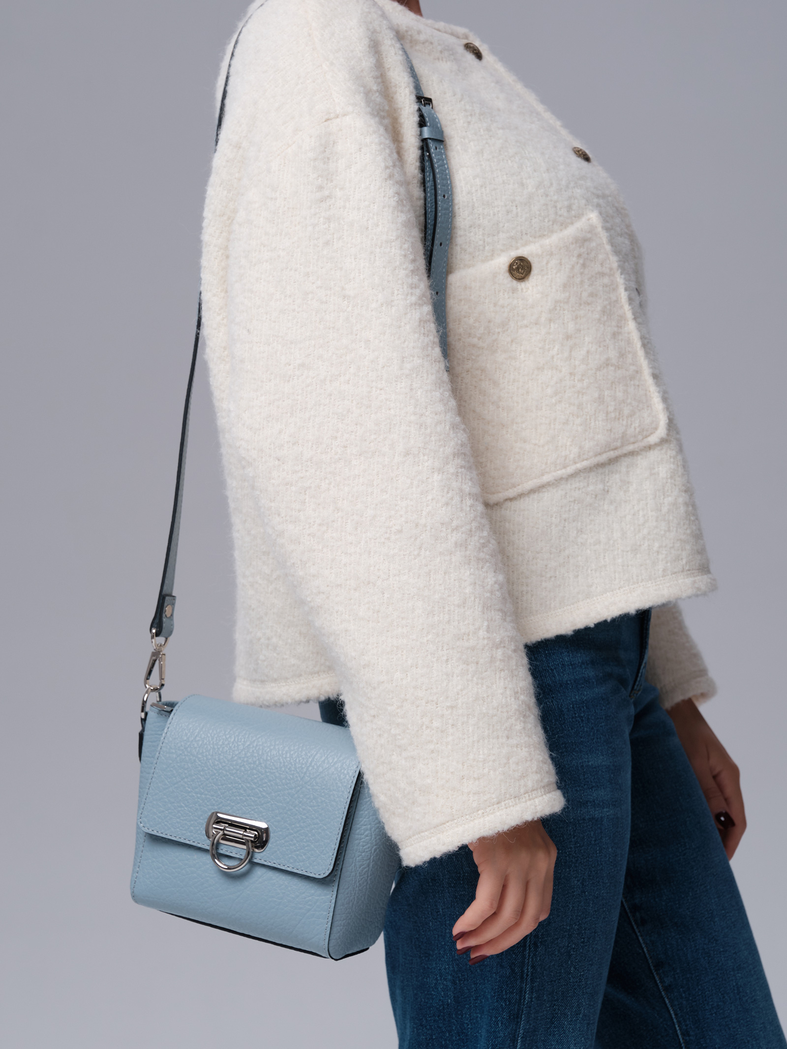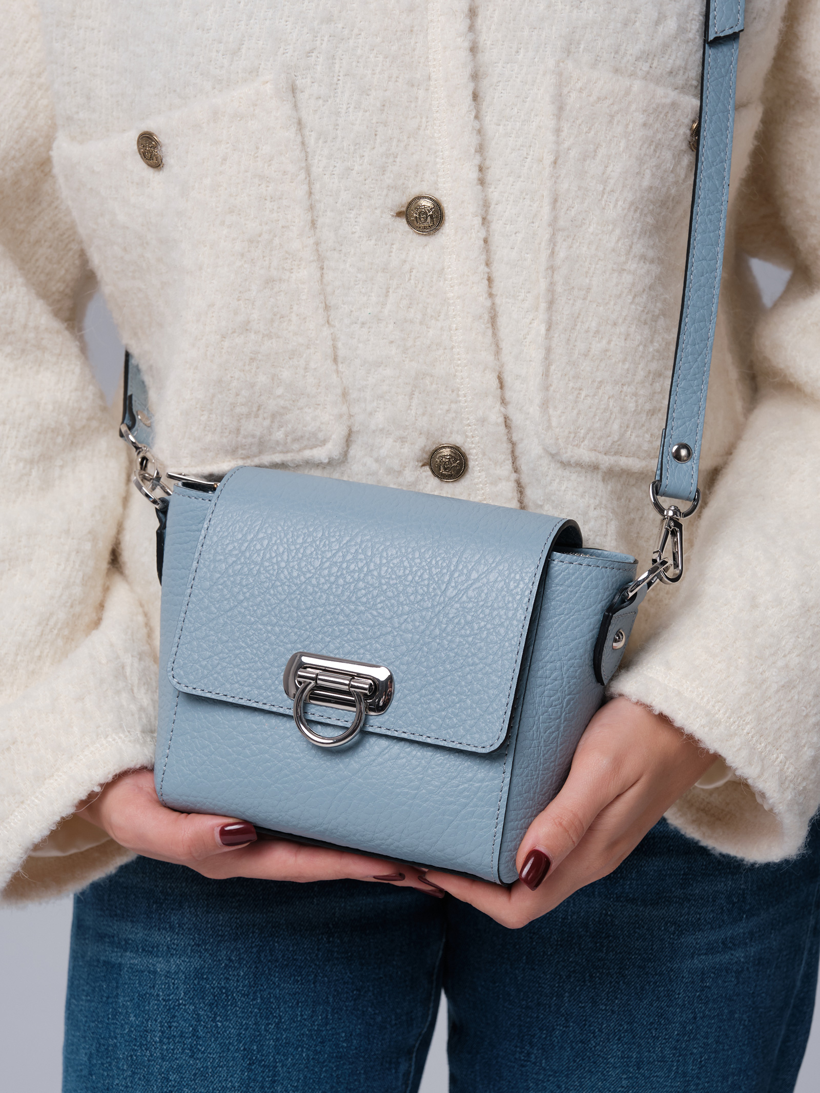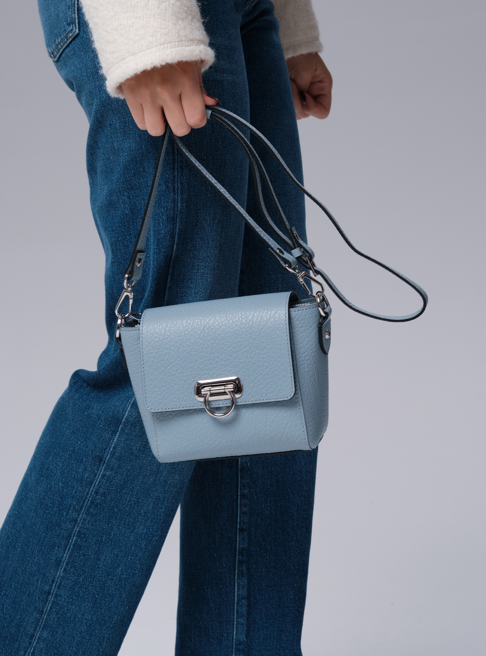 Приглушенный серо-голубой оттенок хорошо сочетается с разными образами, делая сумку универсальной деталью гардероба.