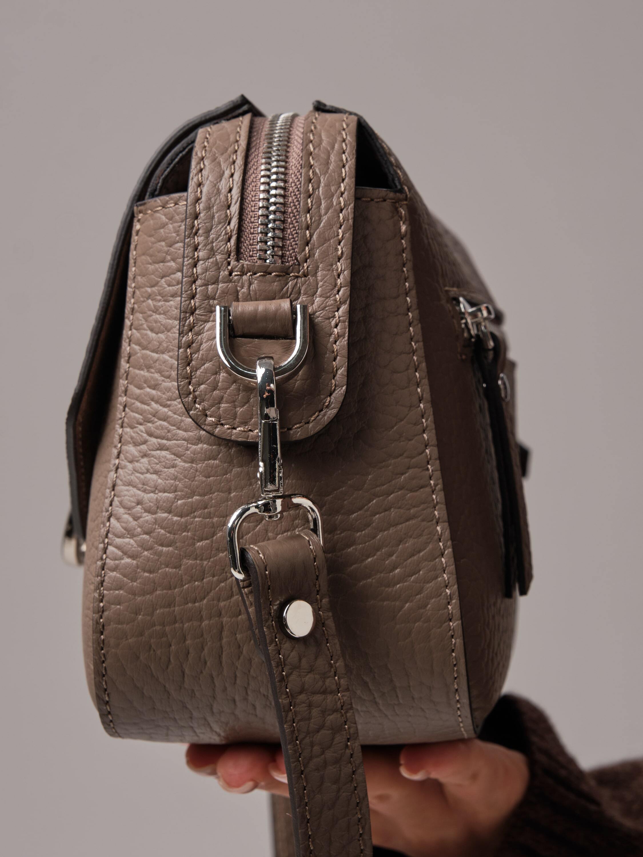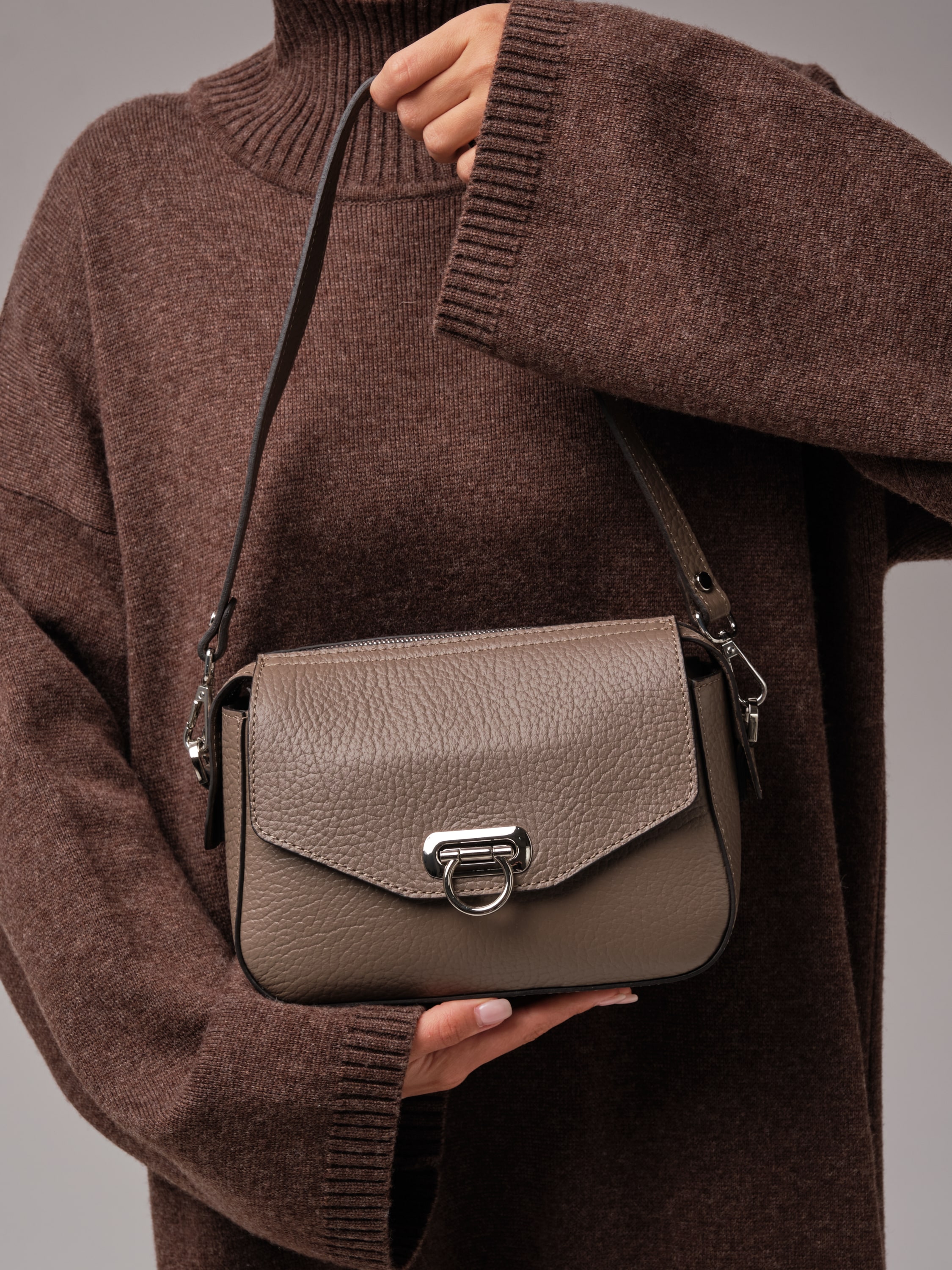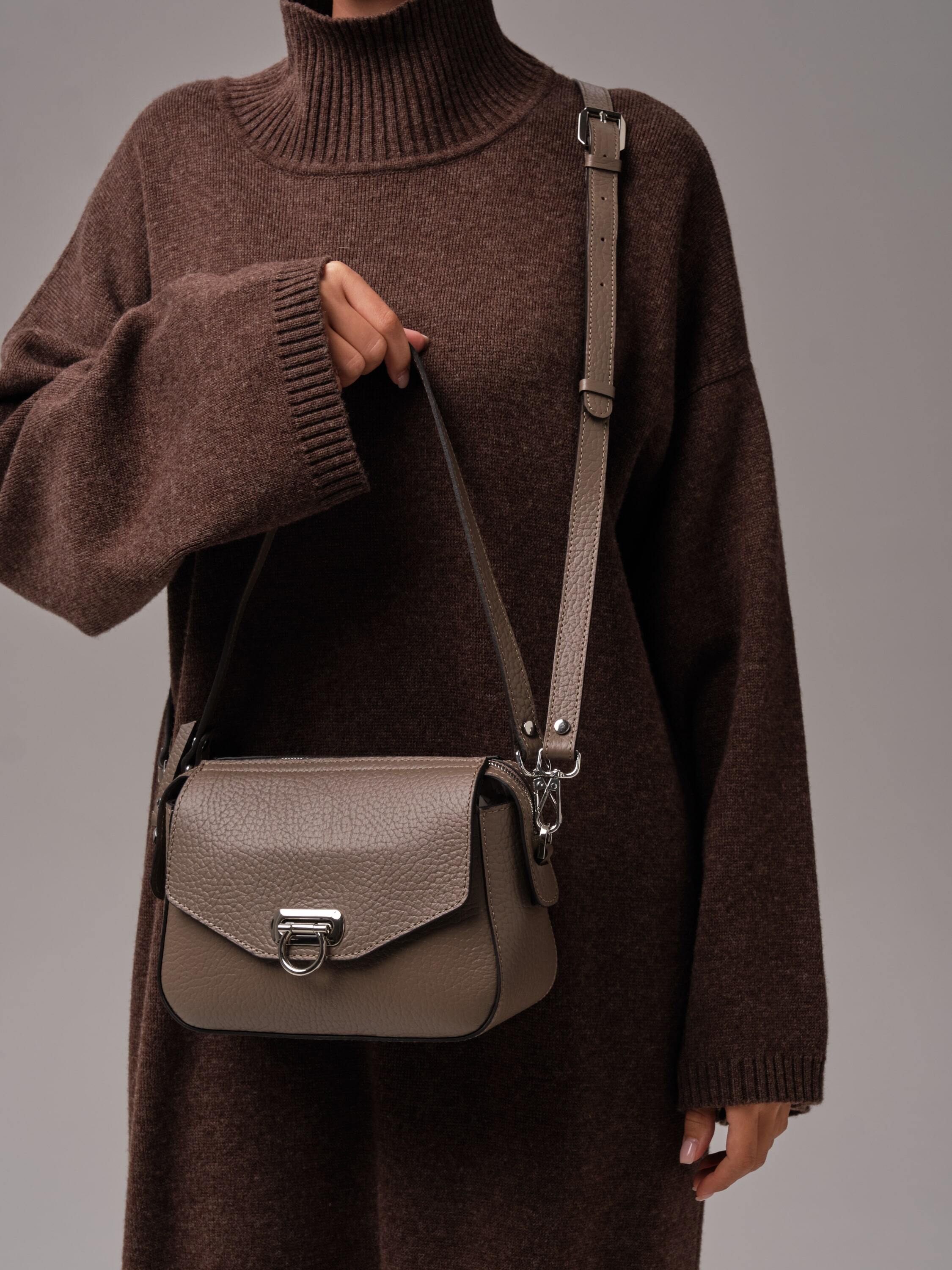 Кожаная женская сумка Azaro 3684 тауп соло - стильная и современная модель, выполненная из плотной, фактурной натуральной кожи с выразительным зернением. Материал выглядит дорого, отлично держит форму и устойчив к носке.