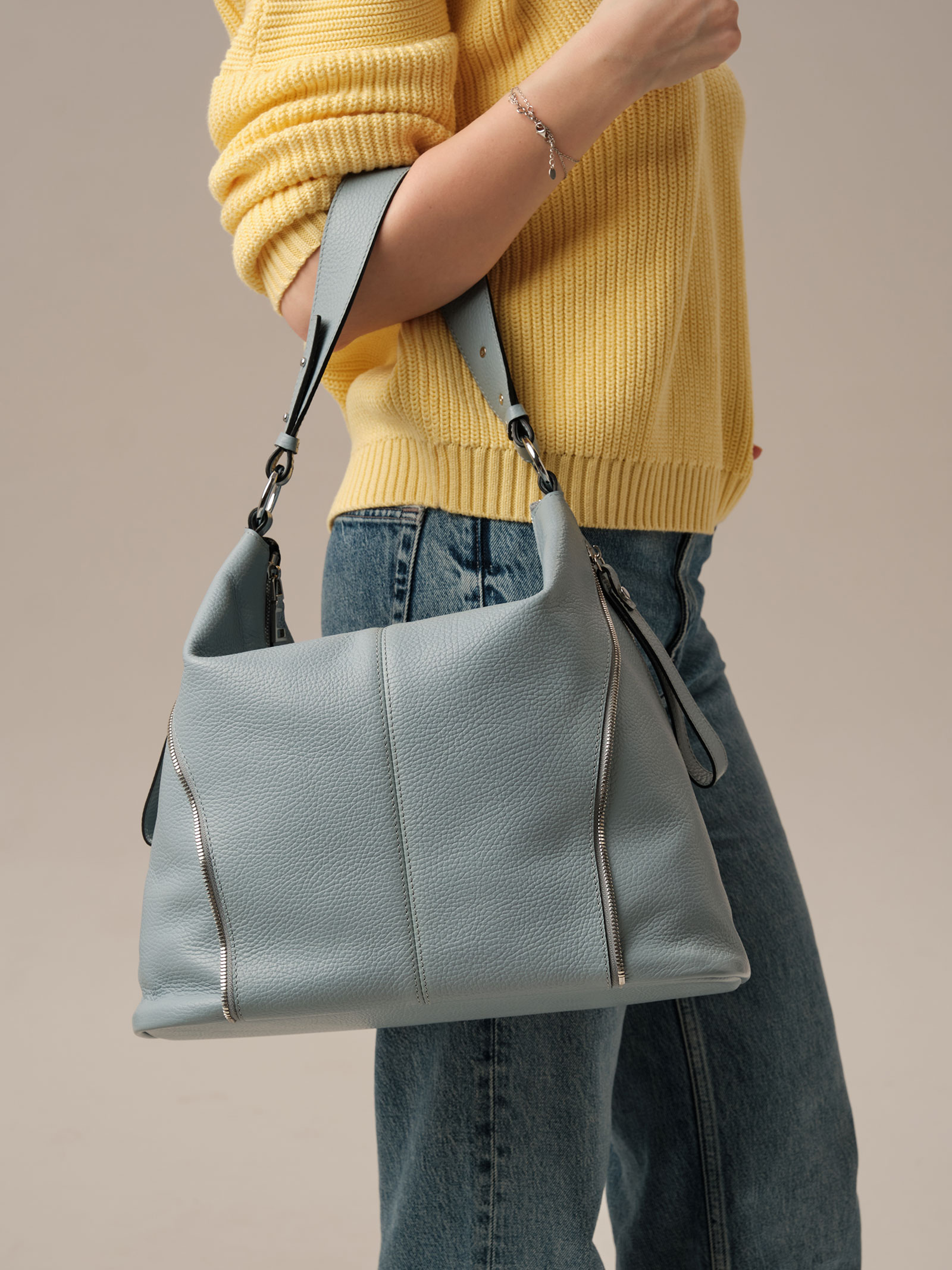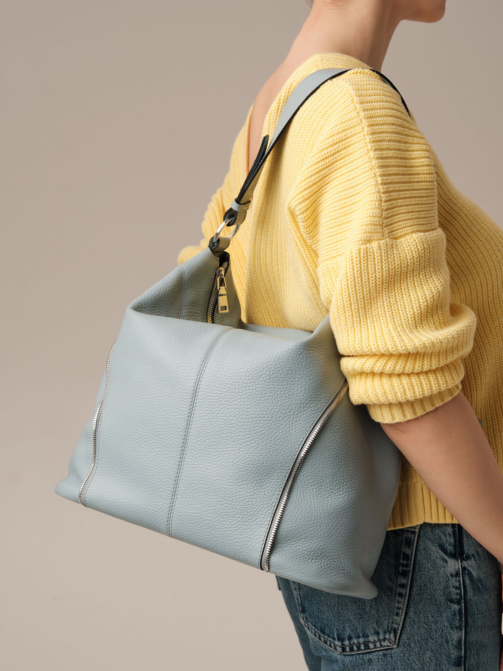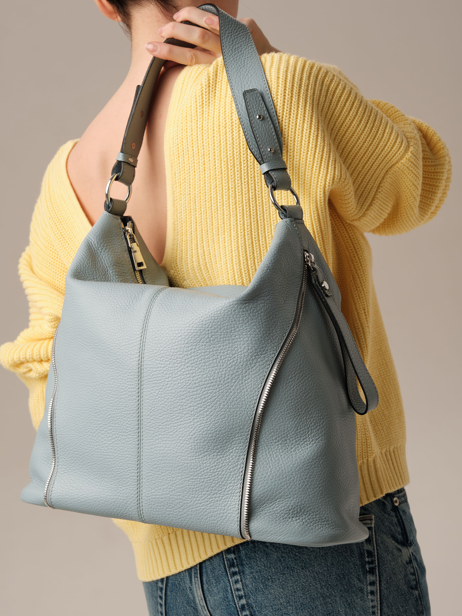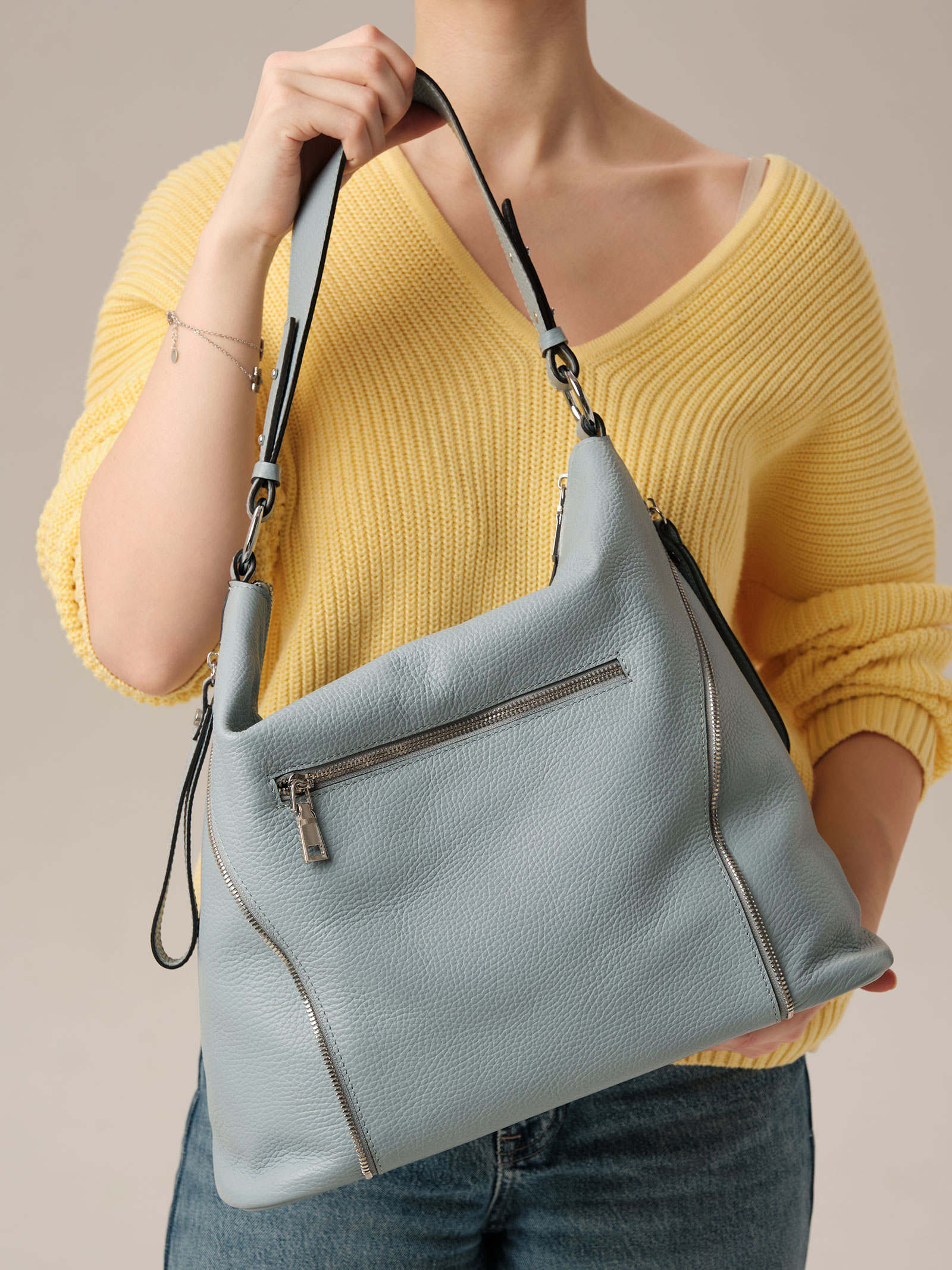 Детали: натуральная кожа, 1 внутреннее отделение, хлопковая водонепроницаемая подкладка, застежка на металлическую молнию, 1 внутренний закрытый карман на молнии в рамке из натуральной кожи с логотипом бренда, 2 внутренних открытых кармана, 1 внешний карман на молнии, 1 регулируемая ручка.