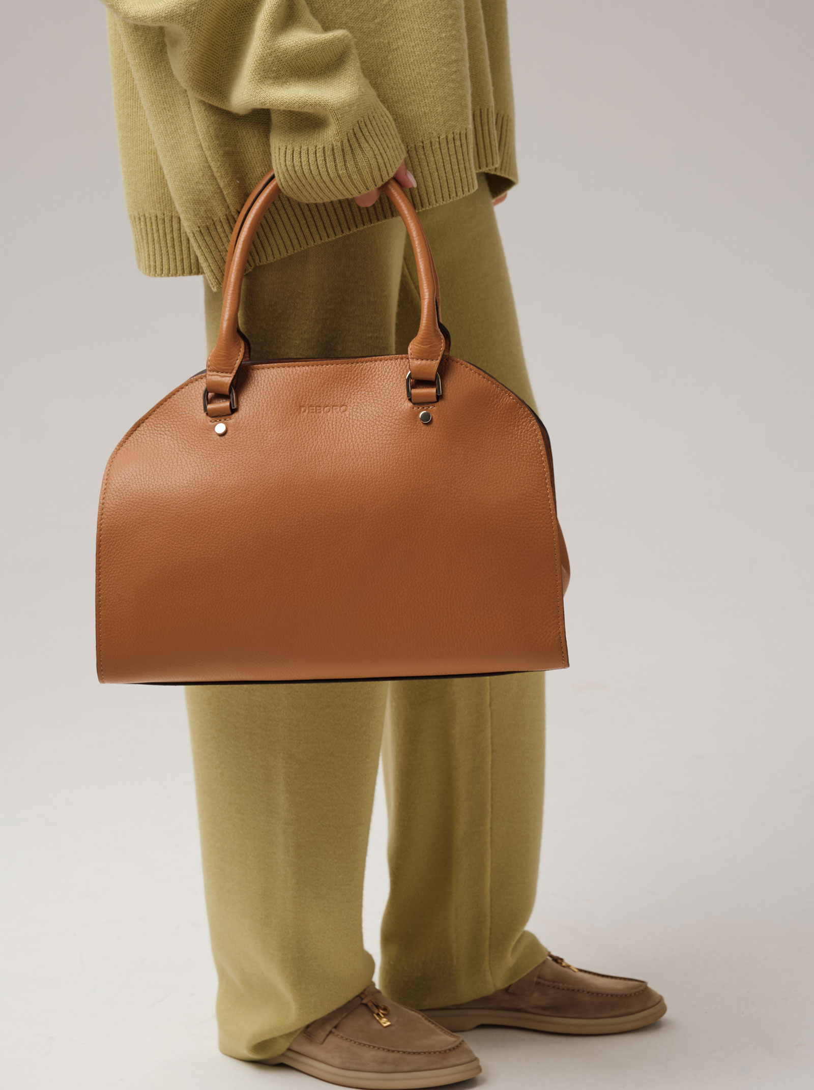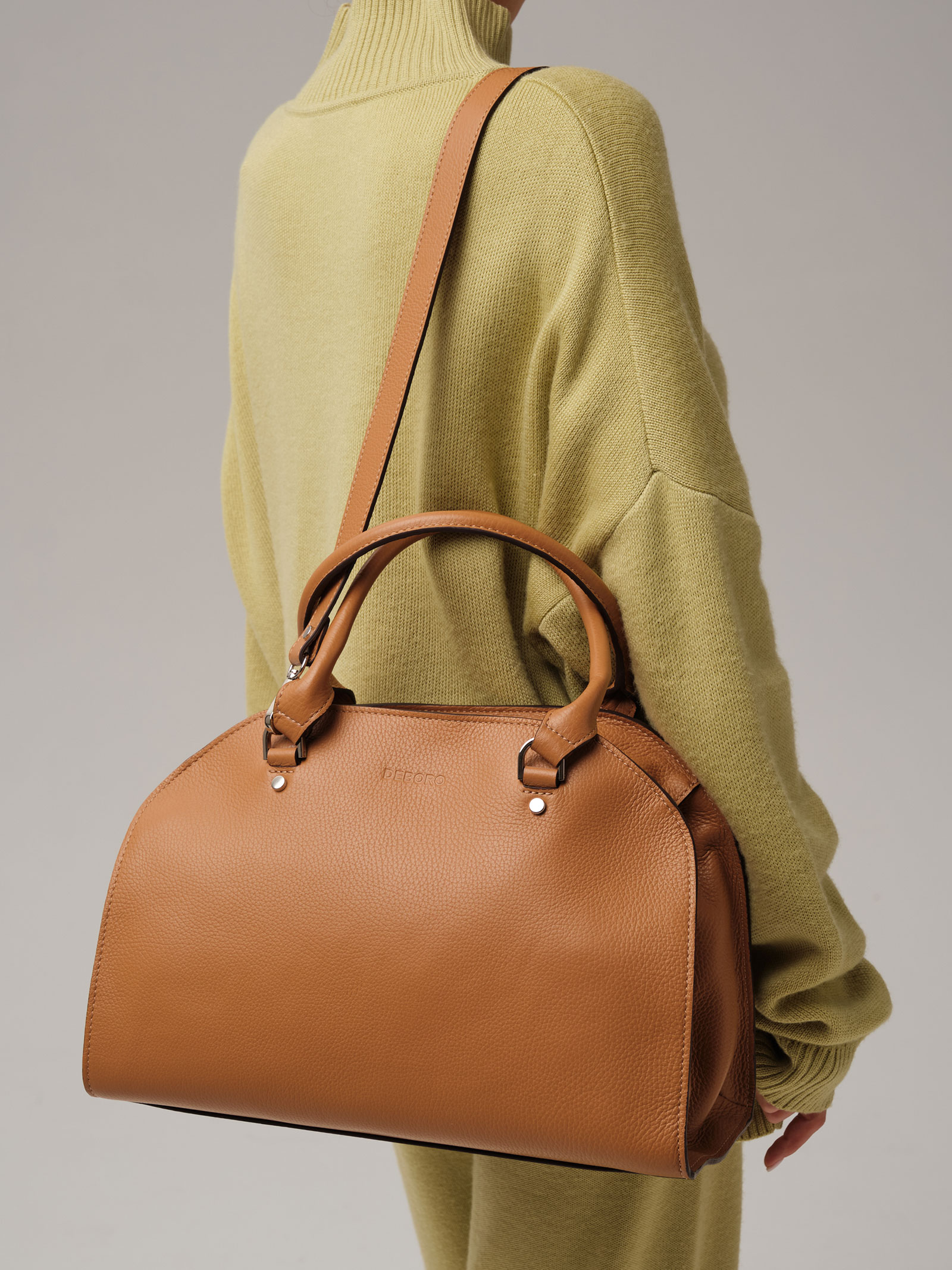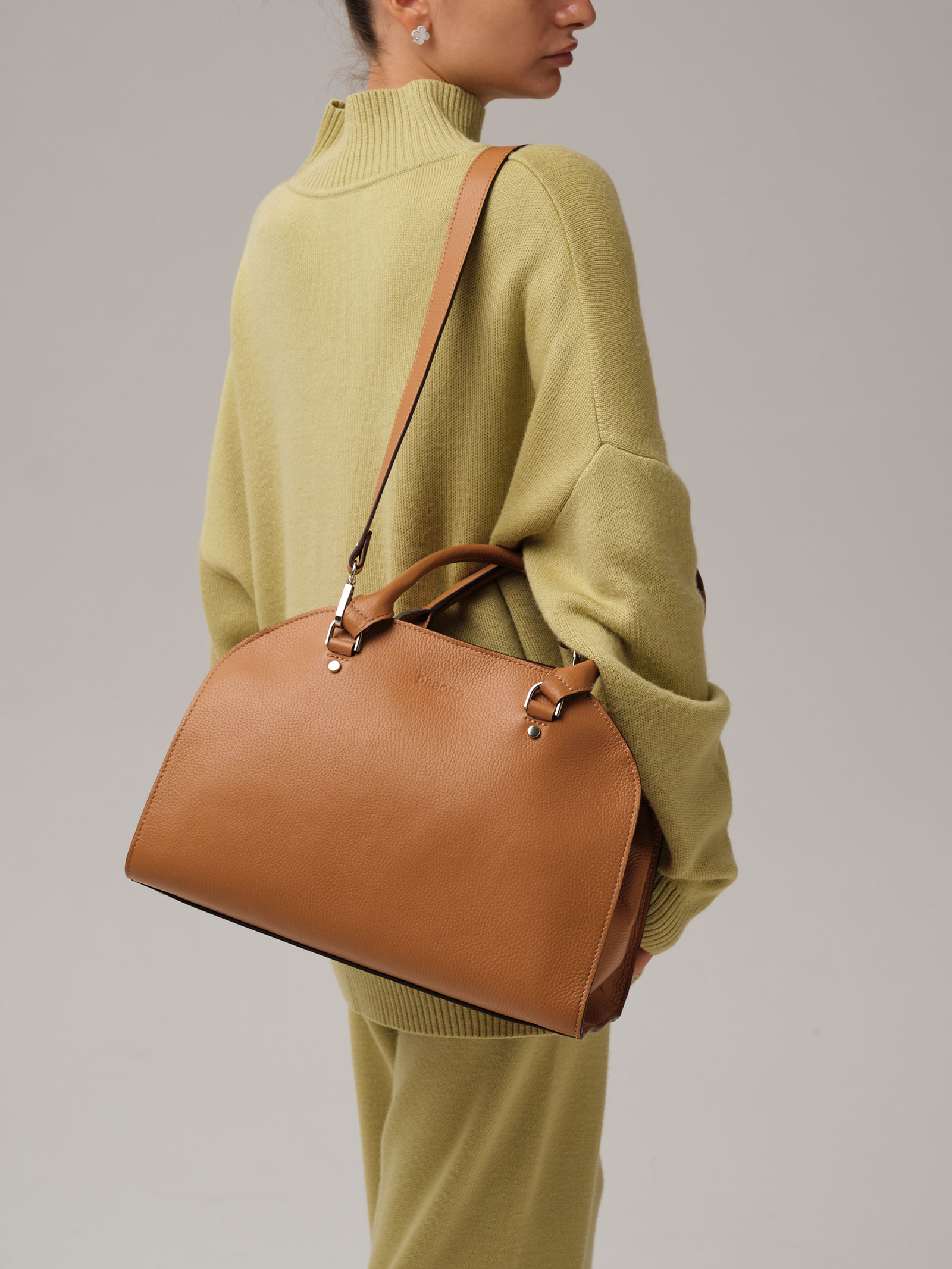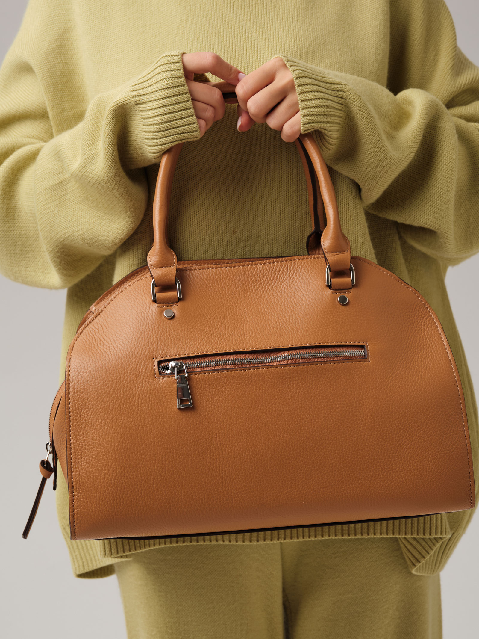 Детали: натуральная кожа, 2 ручки, 1 внутреннее отделение с хлопковой водонепроницаемой подкладкой, 1 внутренний закрытый карман на молнии, застежка на металлическую молнию с кожаным пуллером, съемный нерегулируемый плечевой ремень, металлические ножки.