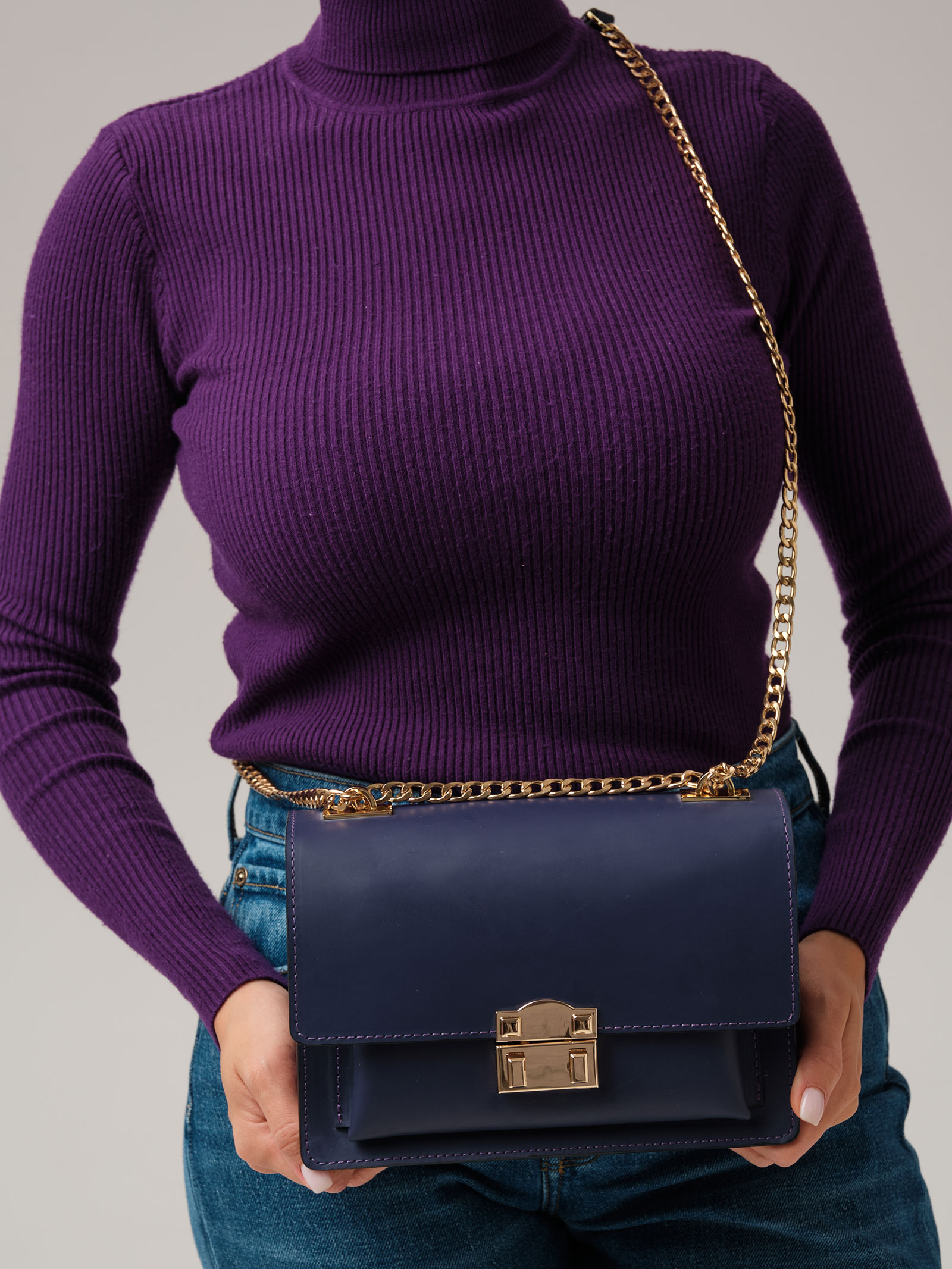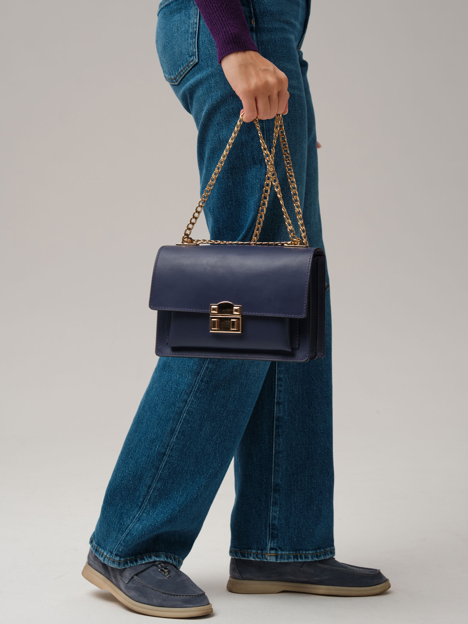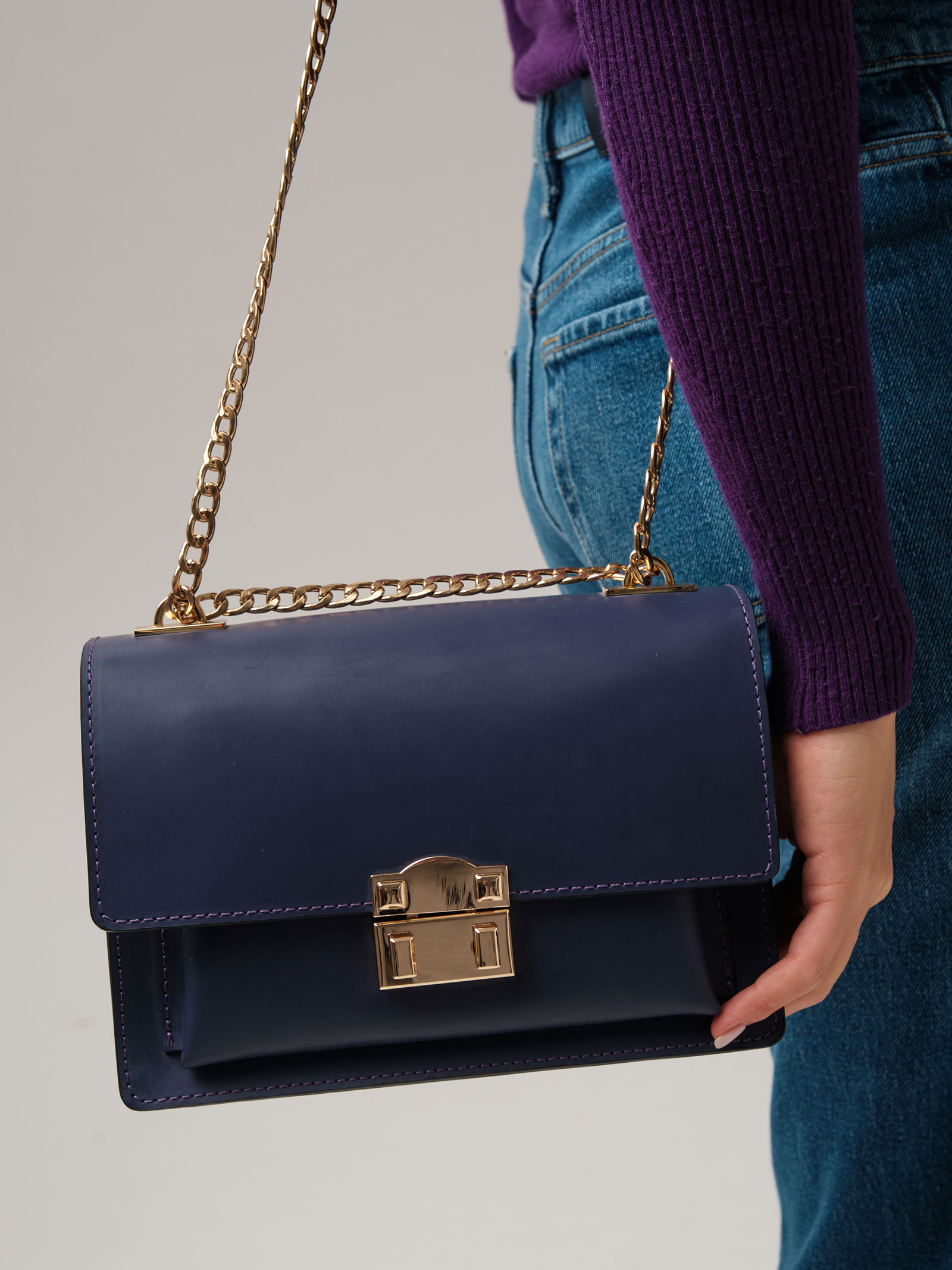 Детали: натуральная кожа, несъемный ремень-цепочка с кожаной ручкой, клапан с внутренней отделкой из натуральной замши, 3 внутренних отделения, 1 внутренний закрытый карман на молнии, 1 внешний открытый накладной карман.