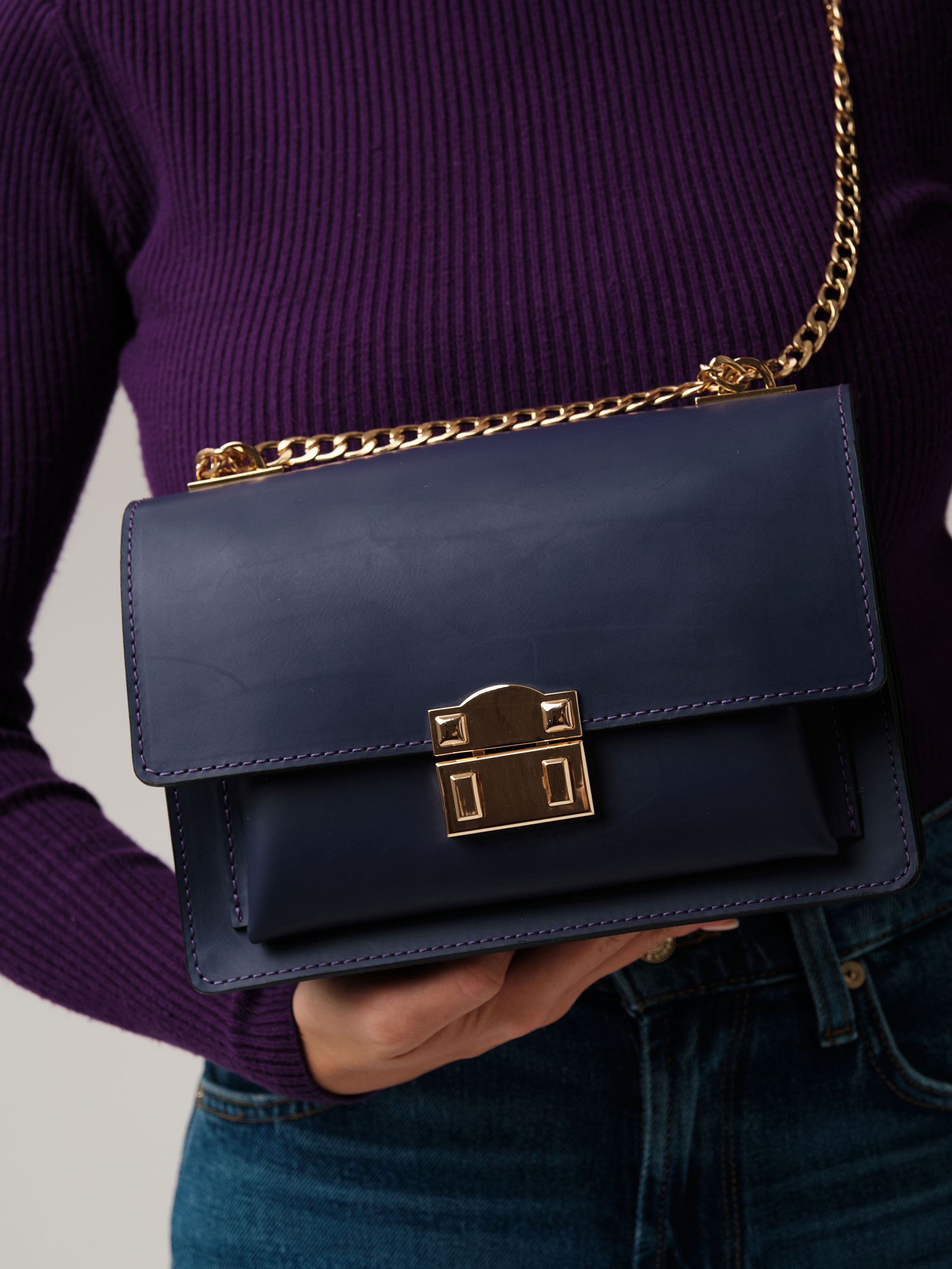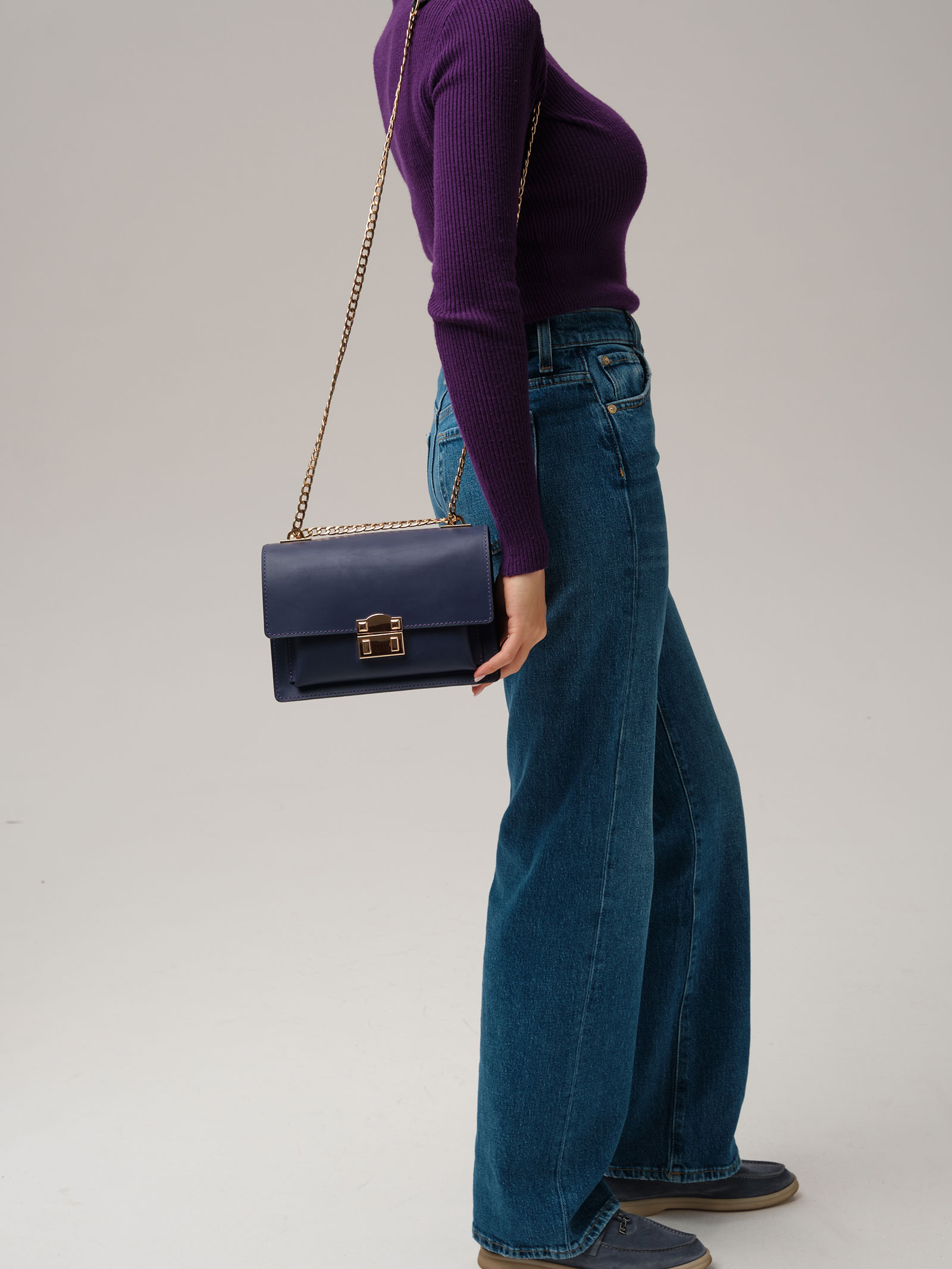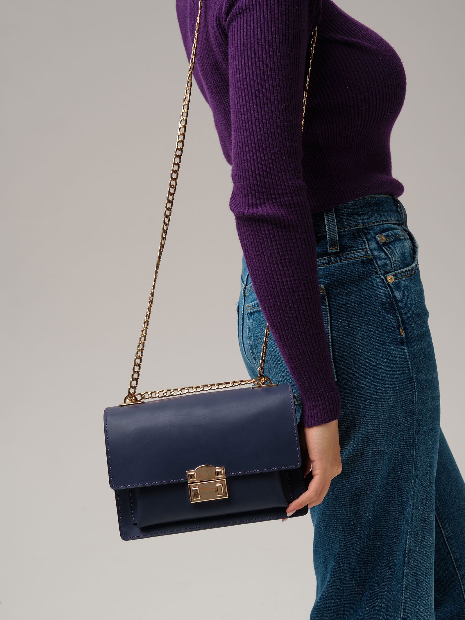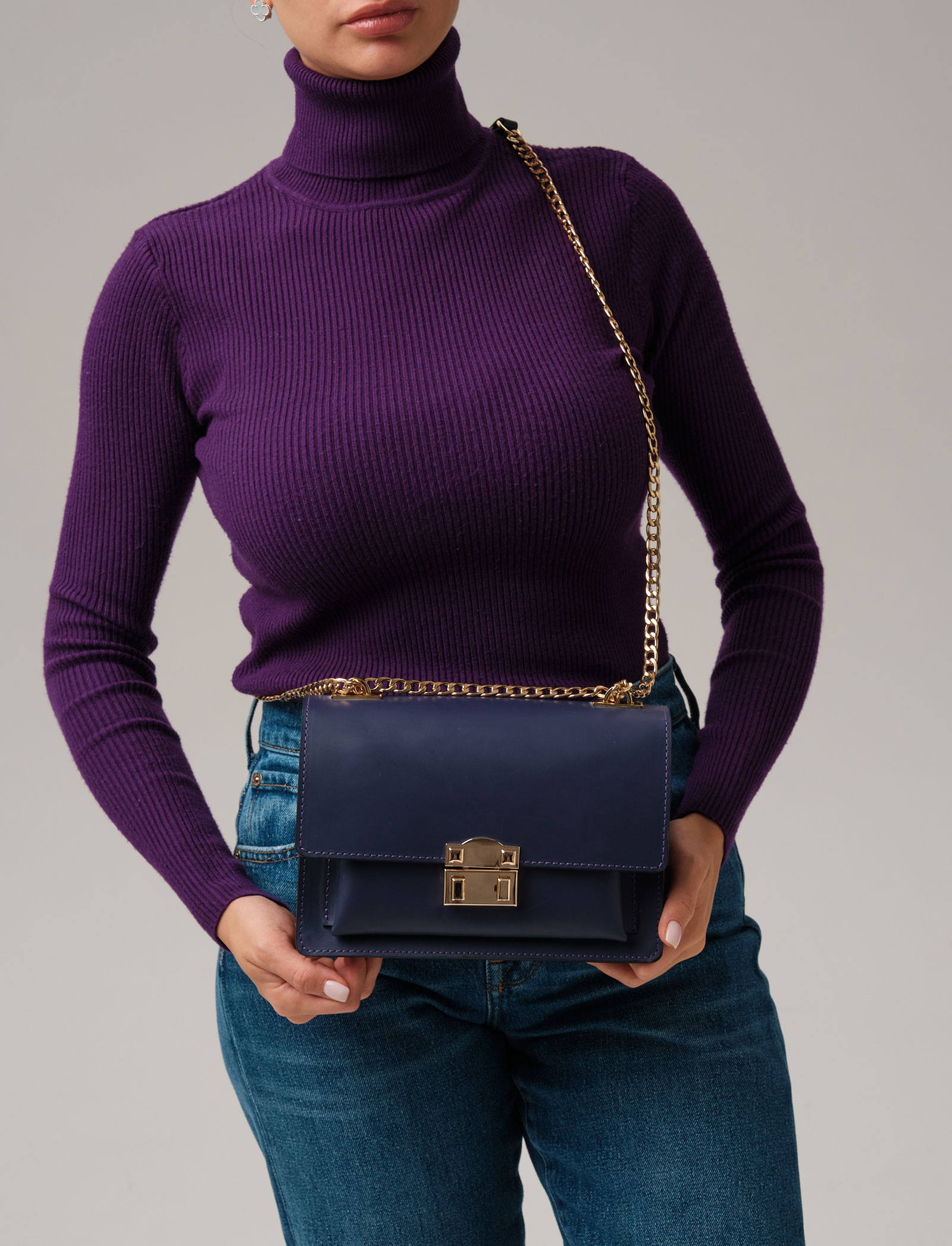 Детали: натуральная кожа, несъемный ремень-цепочка с кожаной ручкой, клапан с внутренней отделкой из натуральной замши, 3 внутренних отделения, 1 внутренний закрытый карман на молнии, 1 внешний открытый накладной карман.