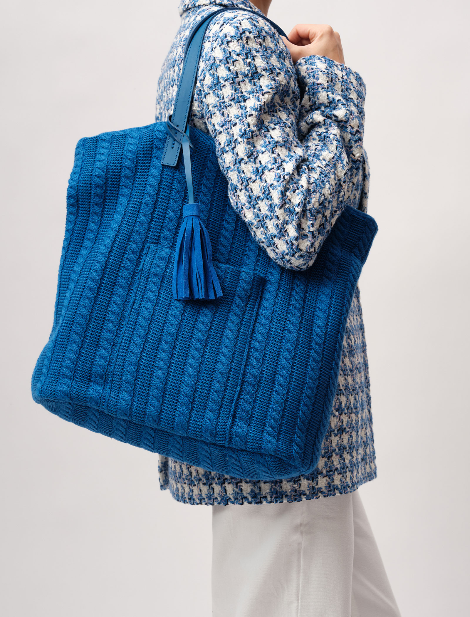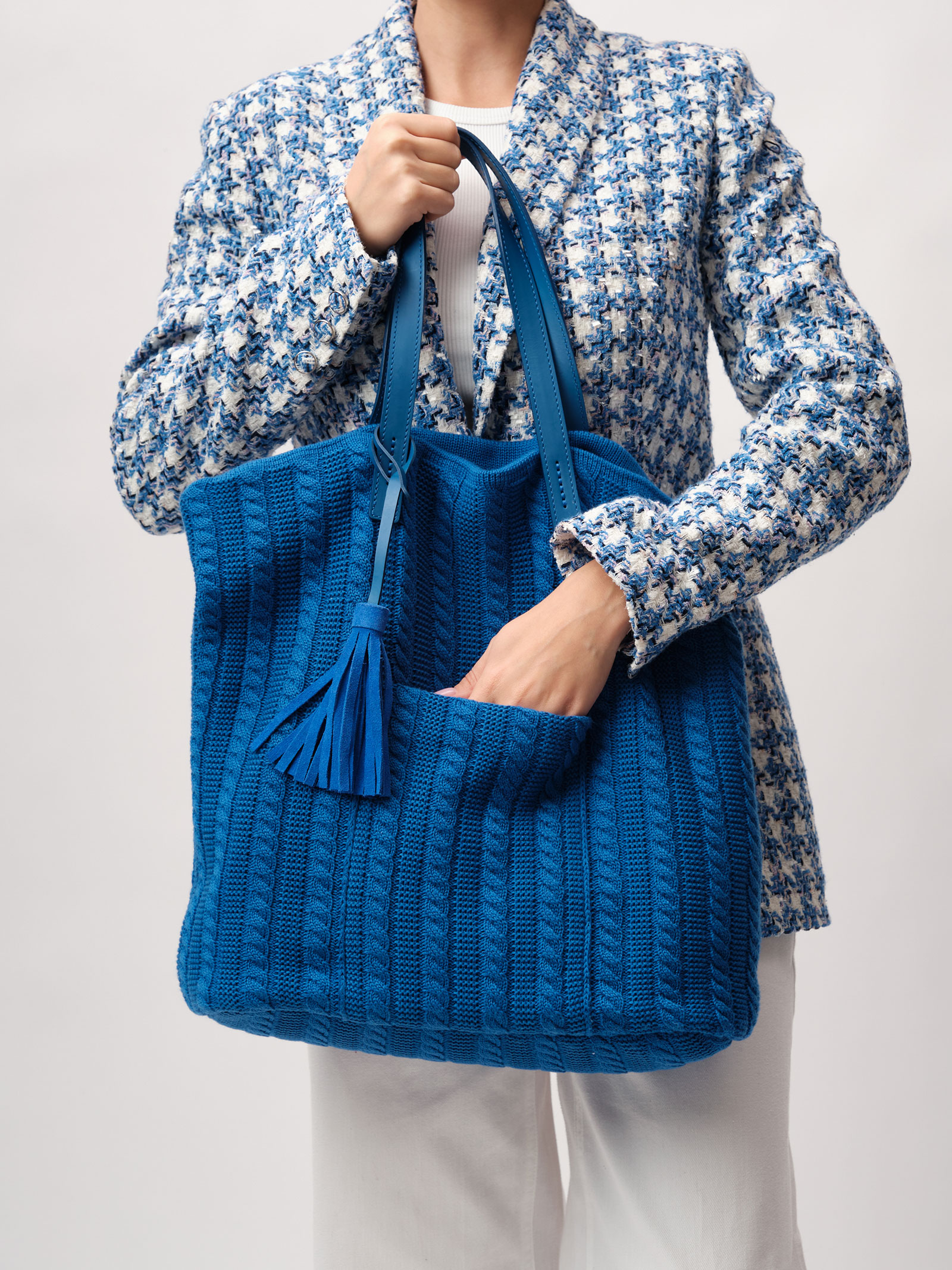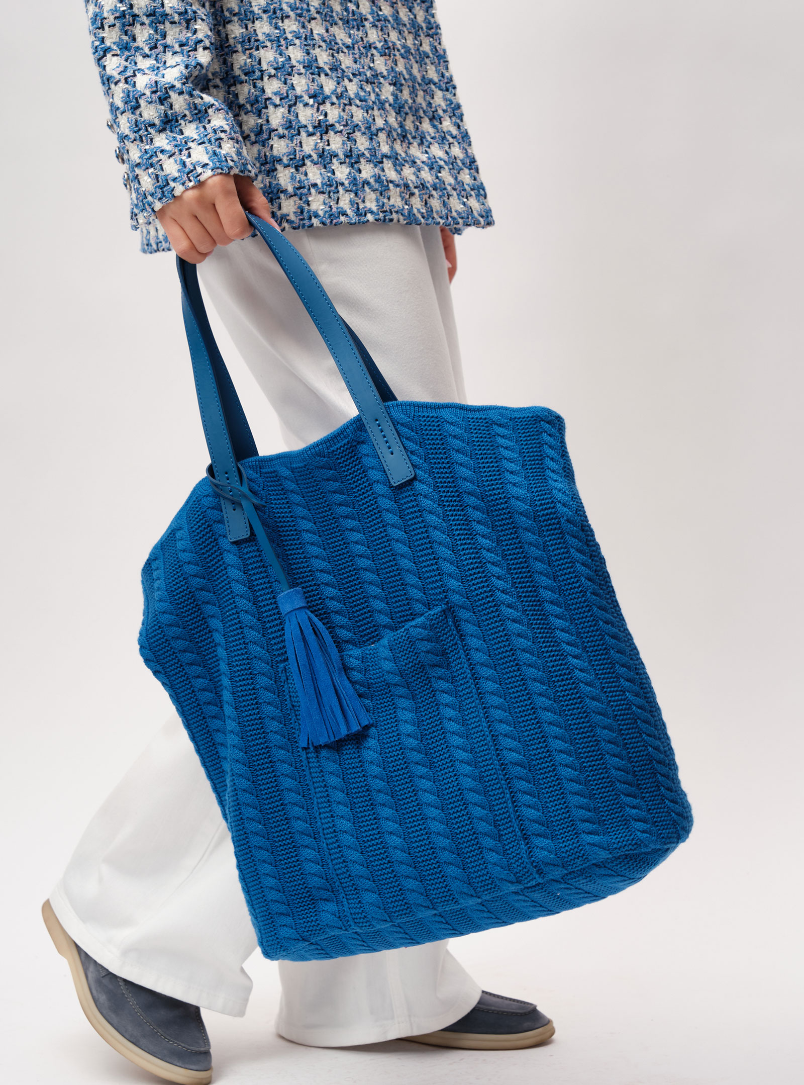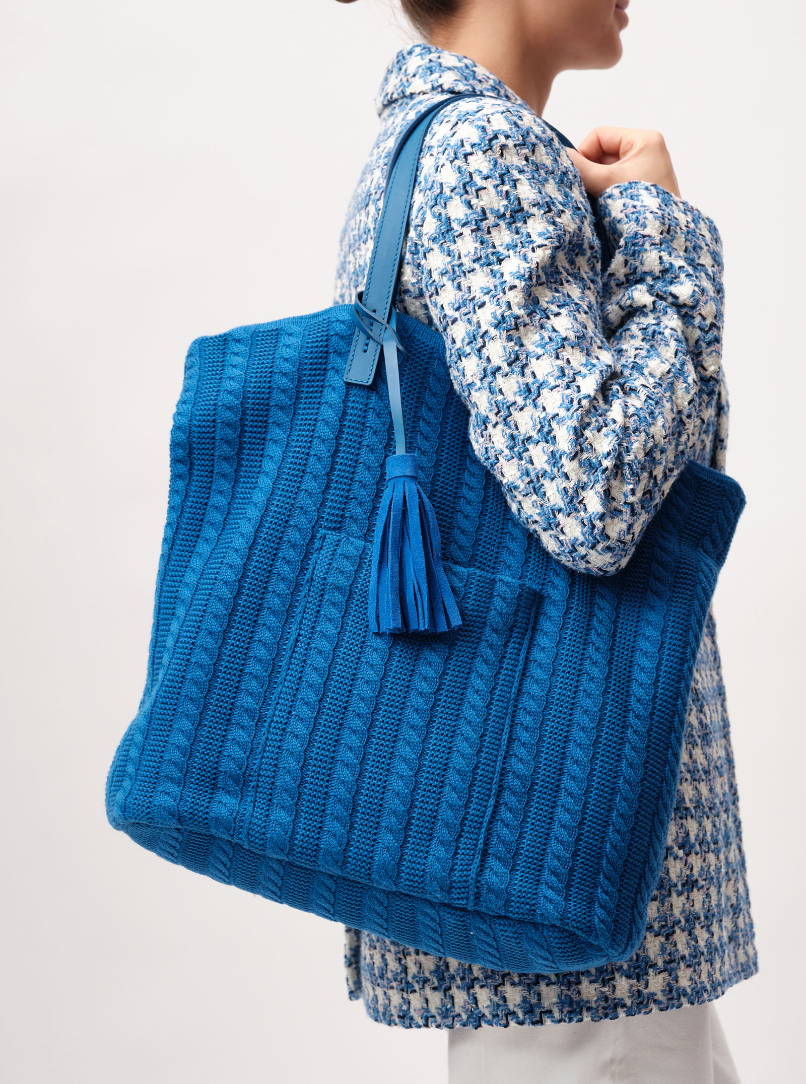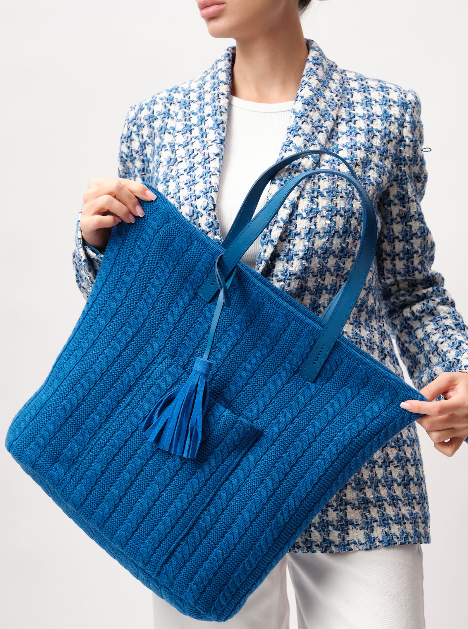 Сумка шоппер Deboro 30678 синий трикотаж из комбинации натуральной кожи, замши и вязаного хлопкового трикотажа.